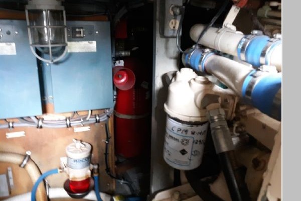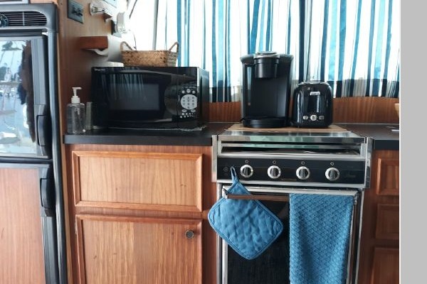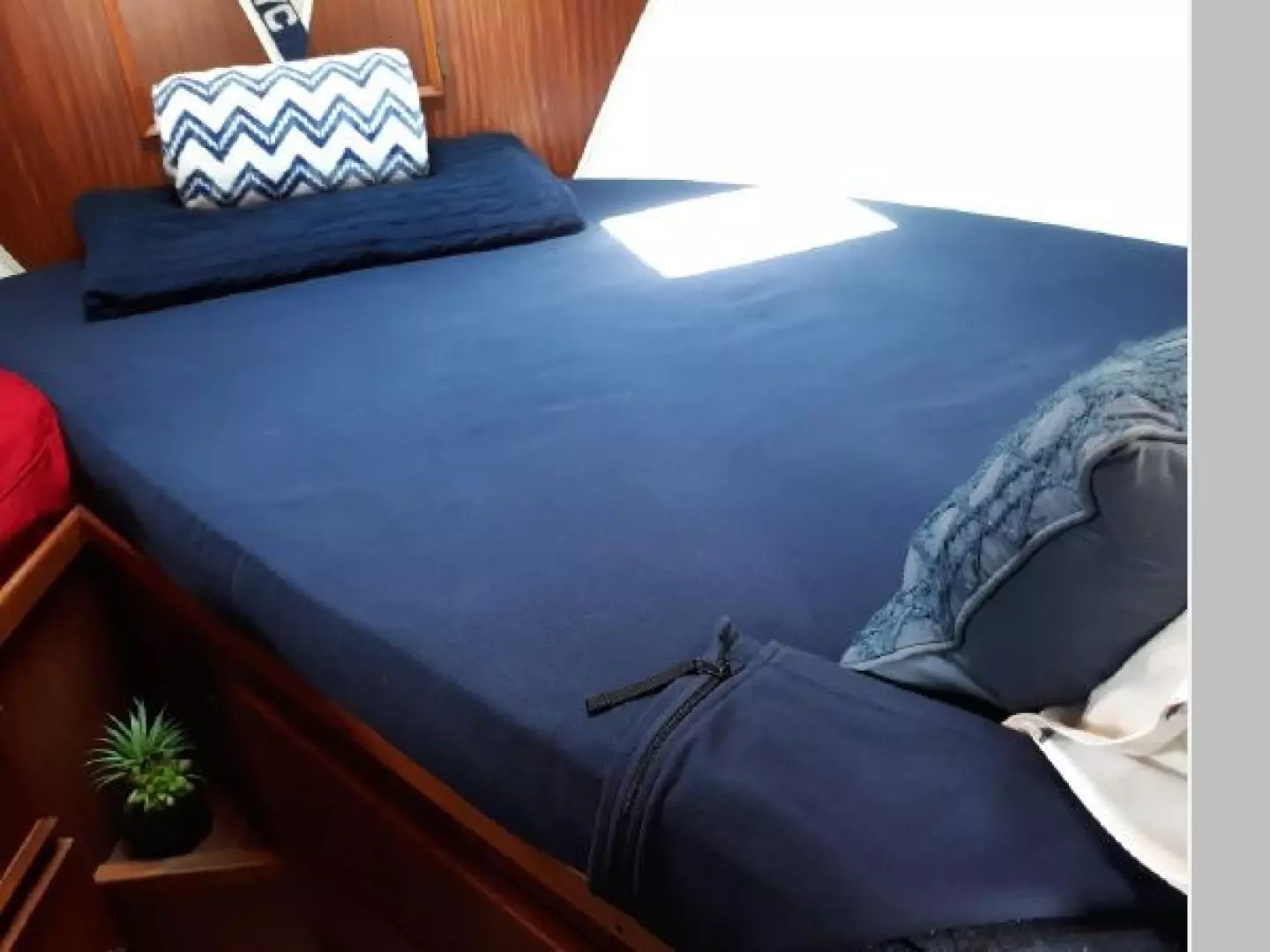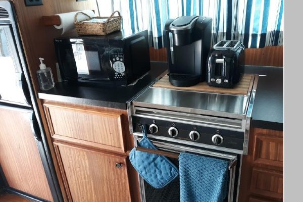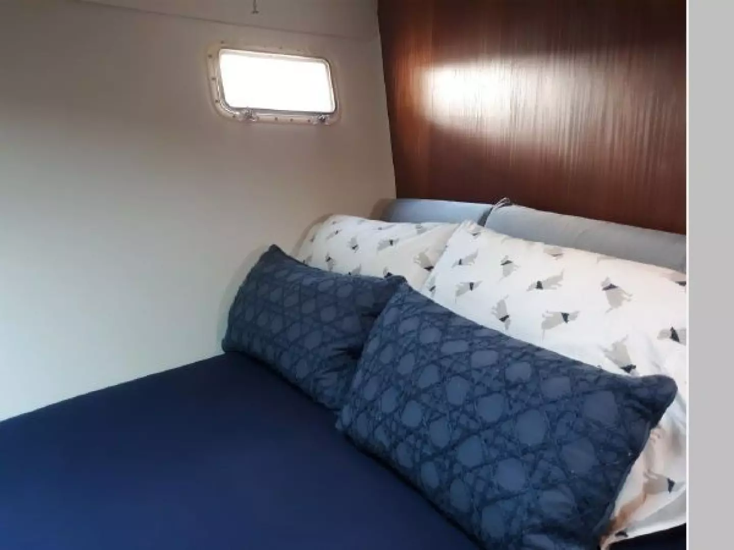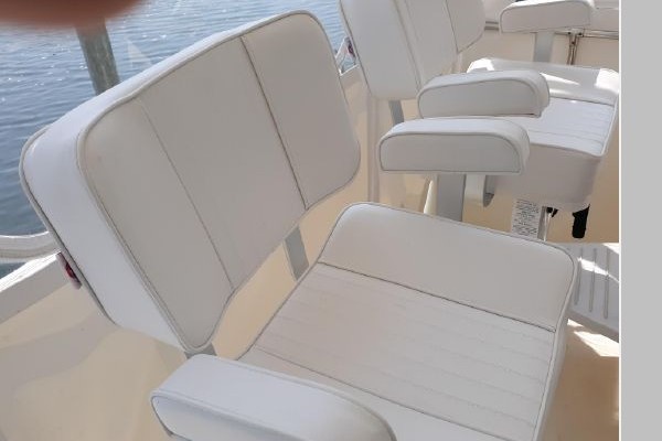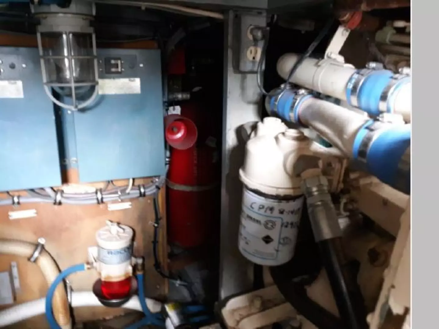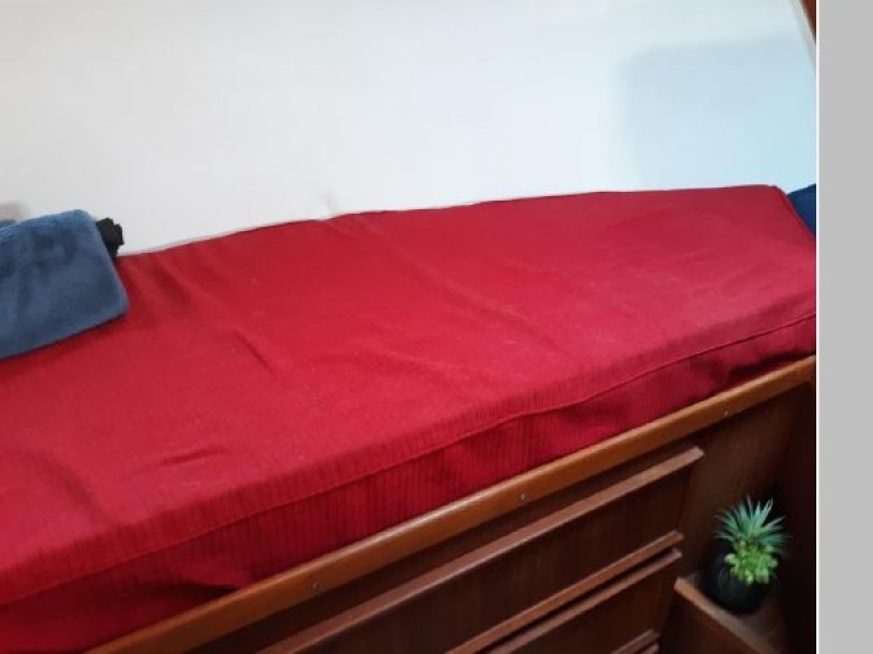 Forward in the V-Berth you have an offset double bed to starboard and a single bed to port, hanging locker and a ventilation hatch. Aft to port is the head with a separate stall shower, head, vanity and mirror. Aft to starboard is the second stateroom with upper and lower berths. Up a couple of steps to the salon area with the full galley to port and sofa and lounge chair to starboard. Full windows provide plenty of natural light and a flat screen TV. Out to the cockpit area where you have a transom door providing access to the swim platform. Up on the flybridge you have a center helm with 2 Captains Chairs, bench seat forward of the helm and a lounge seat to starboard.