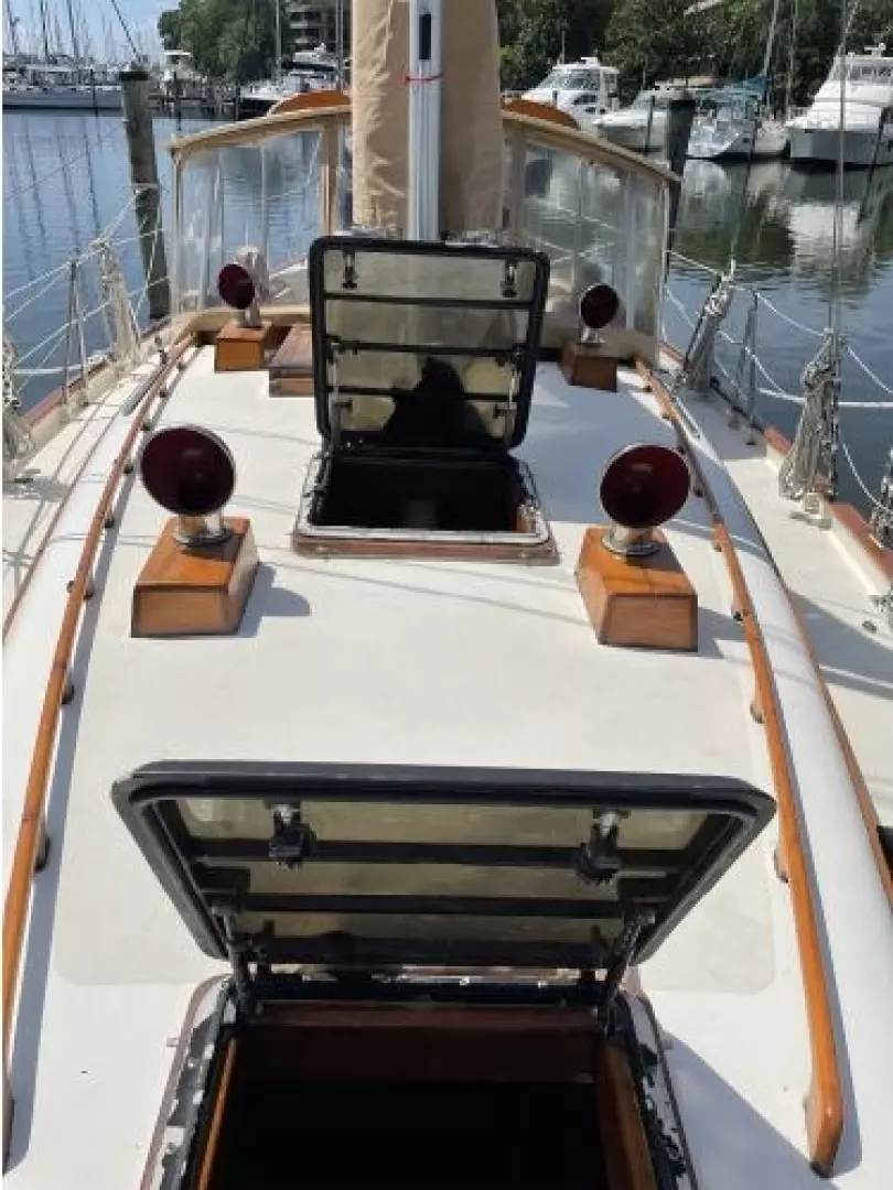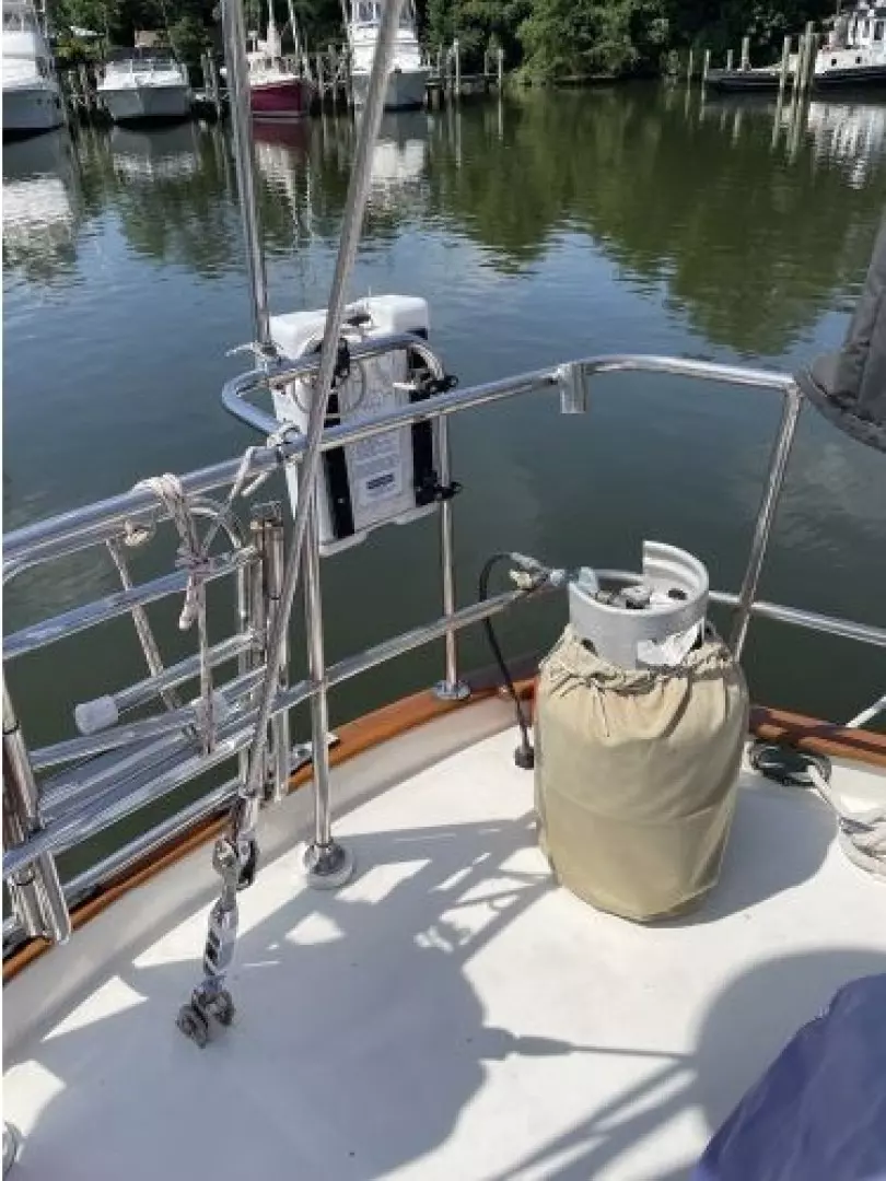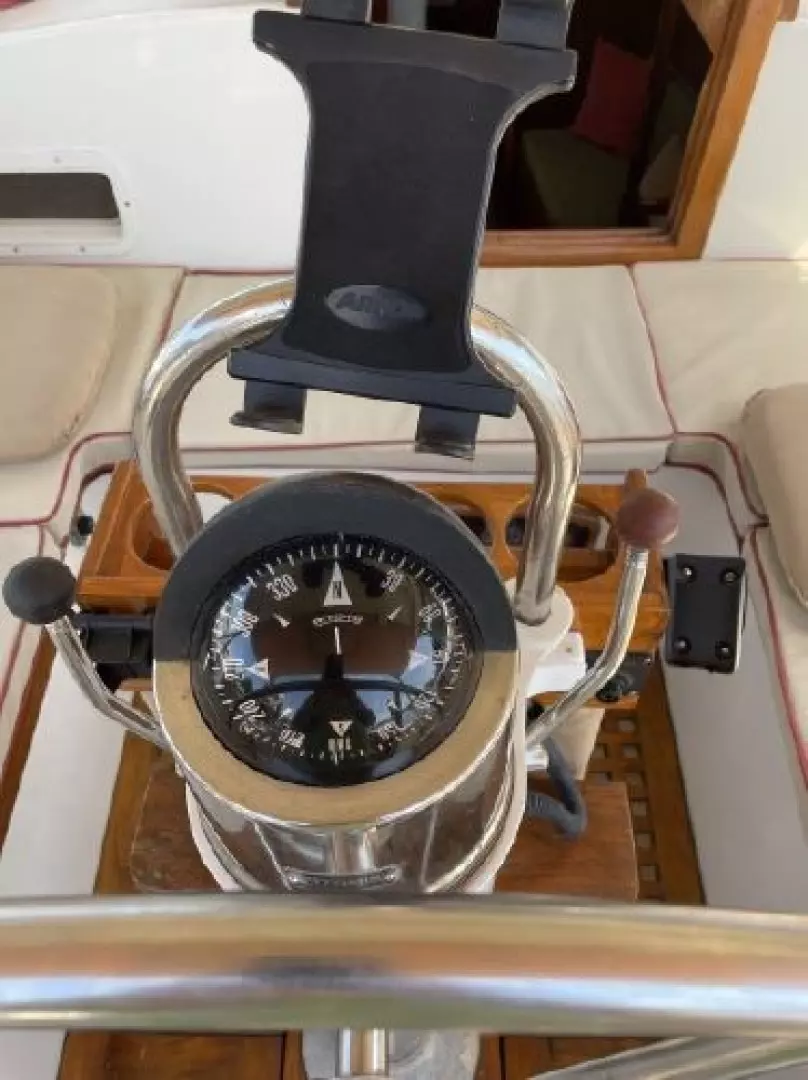 She has a large cockpit that can accommodate a crowd or stretch out in comfort. She has a custom hard dodger with canvas extension aft and full enclosure. Full set of cockpit cushions and teak cockpit table with drink holder. Her wide side decks allows one to wander the decks in comfort and security.