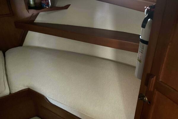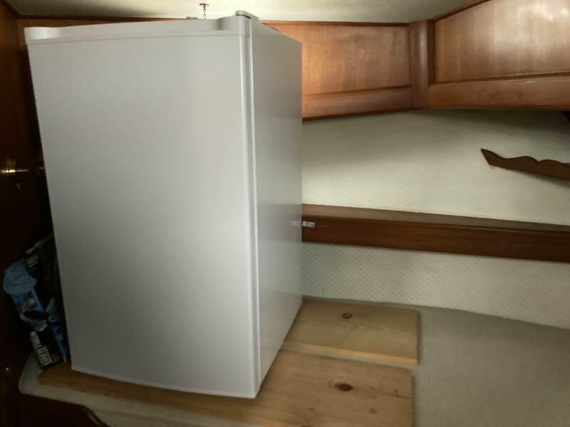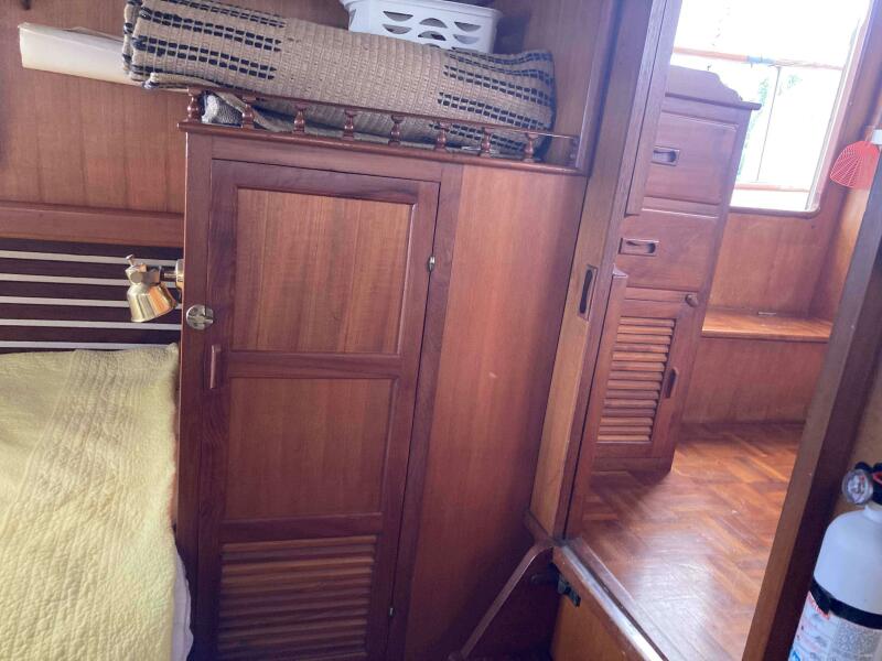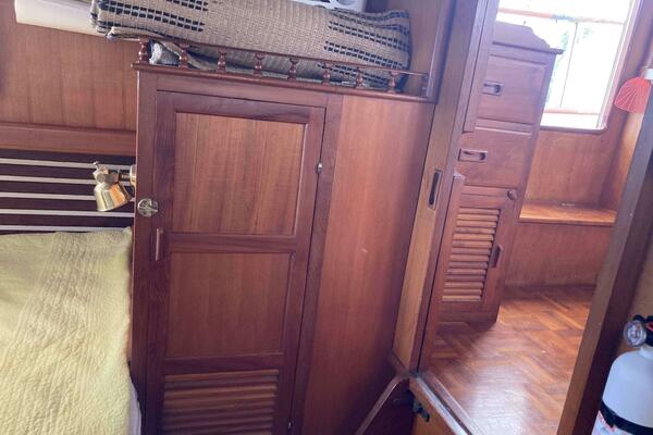The forward cabin features a large V-berth, providing a comfortable sleeping space with a large freezer on the port side. The aft cabin boasts a queen-sized bed, making it perfect for the owners or guests. Both staterooms have plenty of storage, built-in drawers and hanging lockers.
