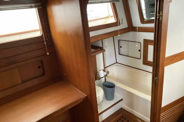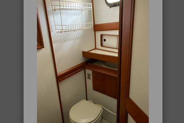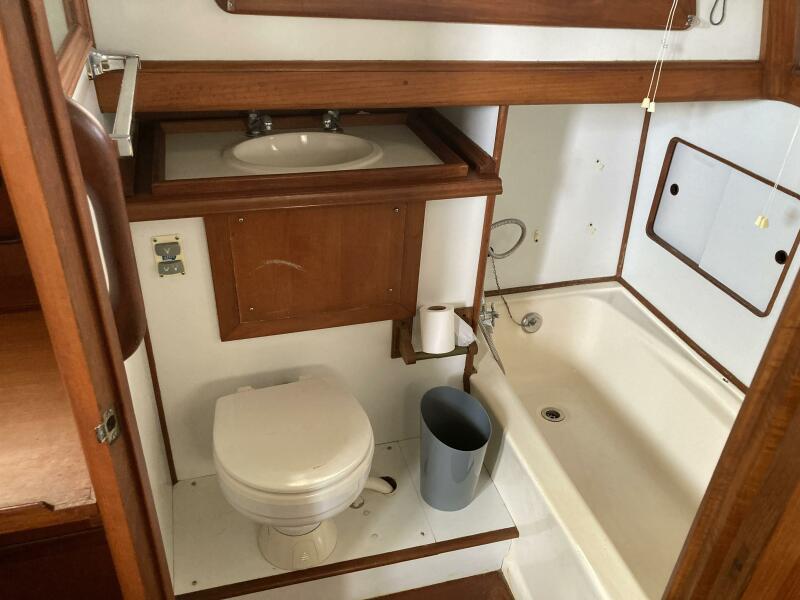 The heads are conveniently located near both cabins and are designed for easy access. The master includes a full-size tub/shower, toilet, and sink, offering everything needed for comfortable living aboard.