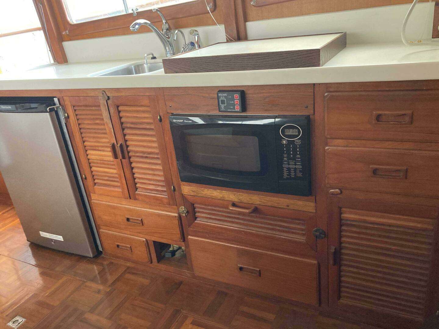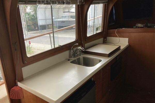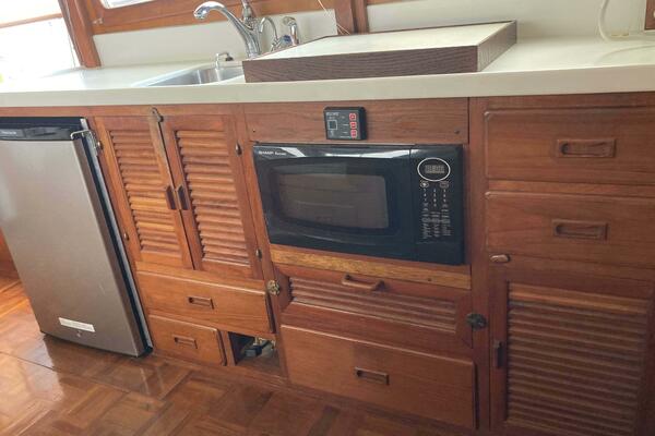 To port, the galley is designed for efficiency, offering a propane cooktop, microwave, fridge and freezer, along with ample counter space. There's plenty of storage for kitchen essentials, making long-distance cruising or weekend cooking a breeze.