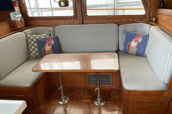 Moving into the salon, from either port or starboard sliding doors you're greeted by a warm, inviting space with large windows providing plenty of natural light. The comfortable seating area is perfect for relaxing or entertaining guests, with a pedestal table for dining or game nights. A well-placed helm station is located forward in the salon, providing excellent visibility for navigating while still remaining close to the living areas.