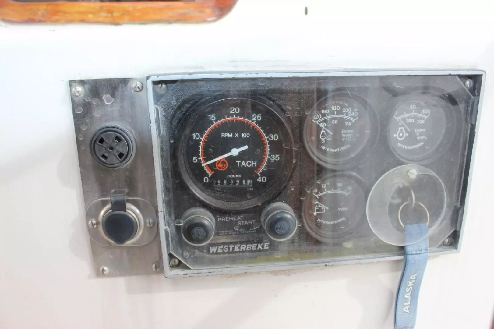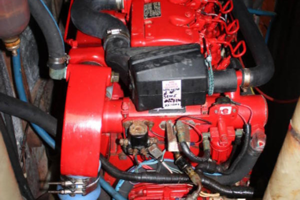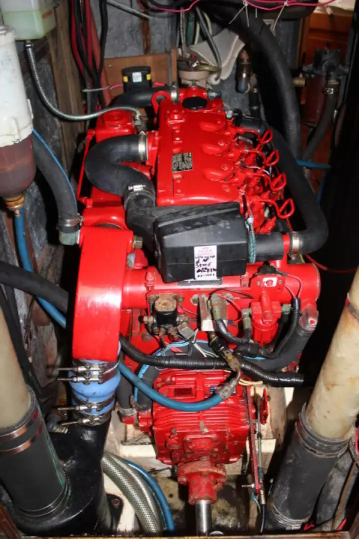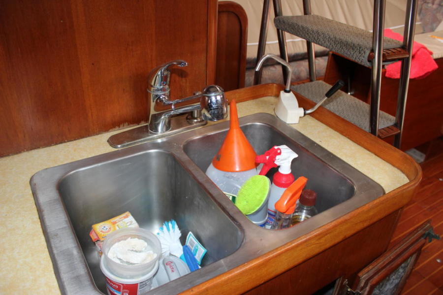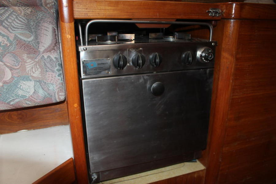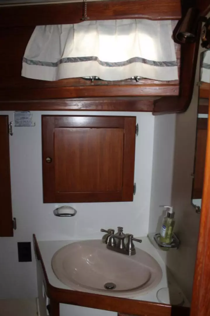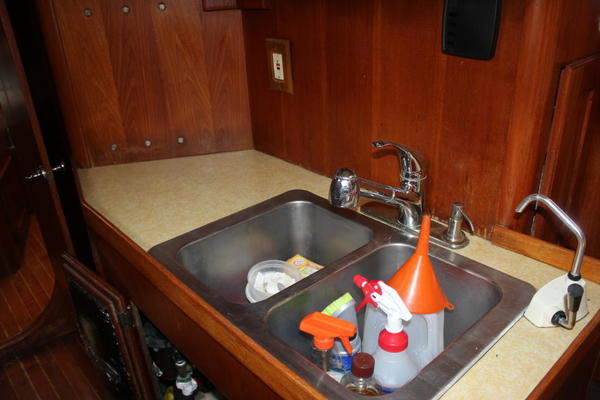 To starboard is the galley running aft with double-sinks on centerline above the Westerbeke diesel with good access to mechanicals and batteries. Outboard is the refrigeration, stove/oven and galley storage and generous counterspace.