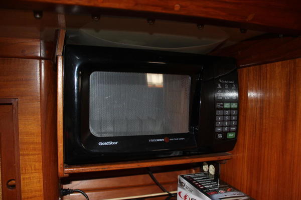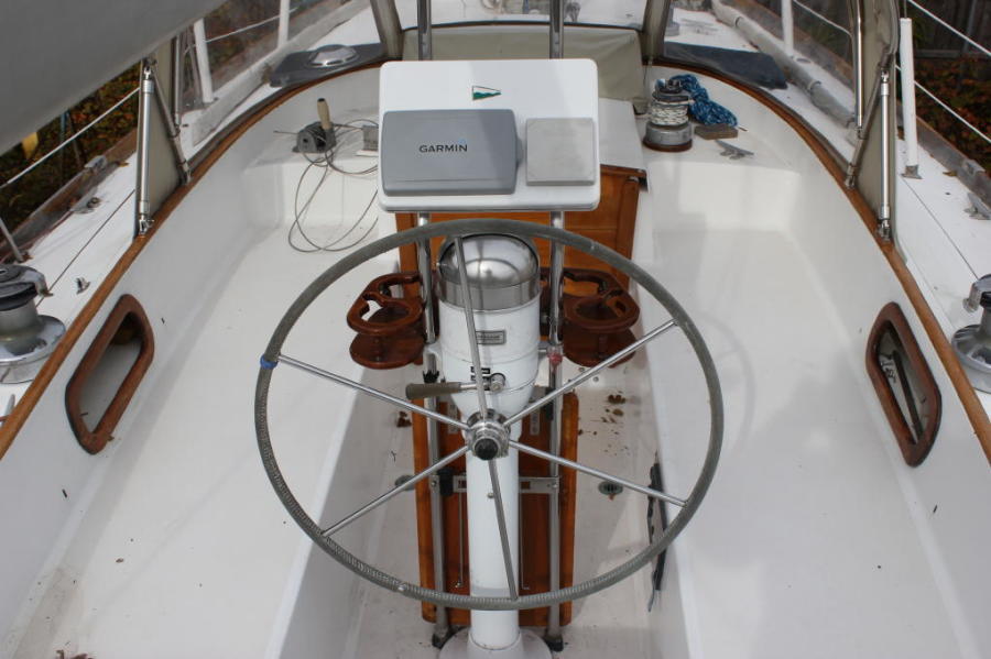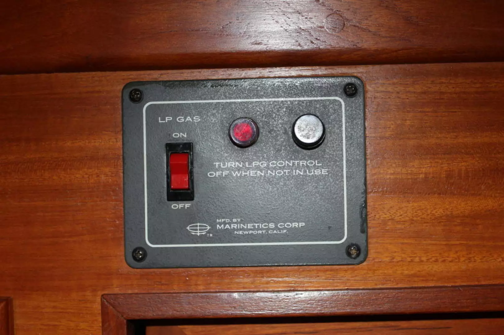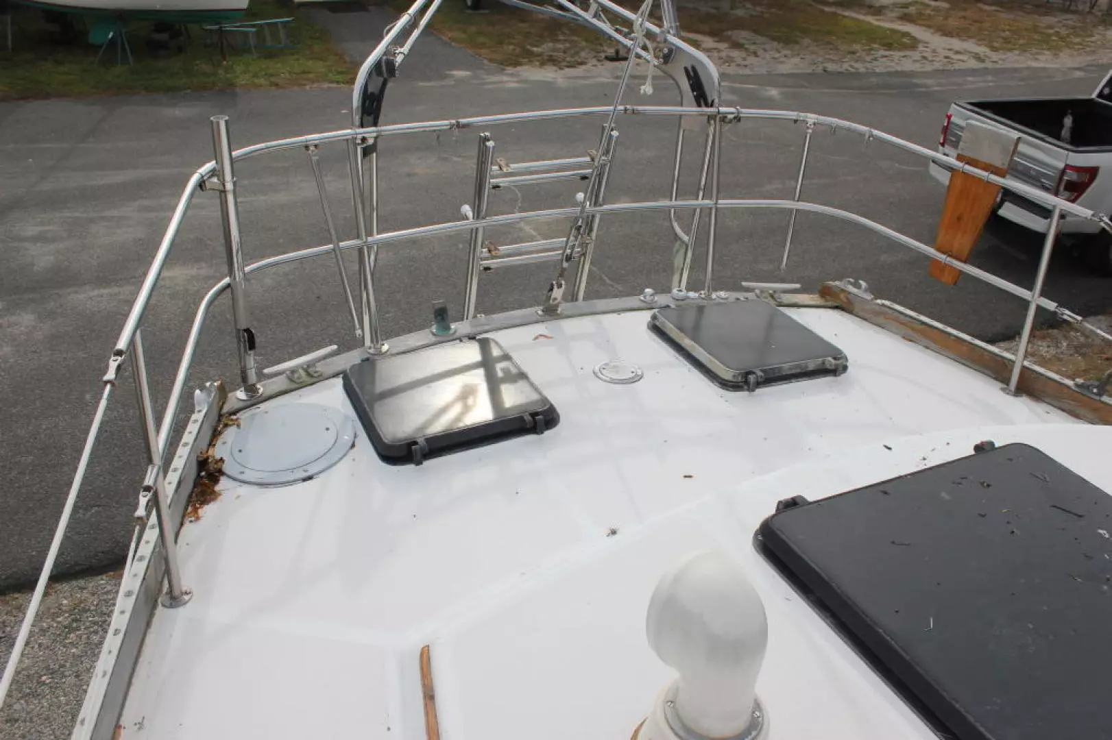 To starboard is the galley running aft with double-sinks on centerline above the Westerbeke diesel with good access to mechanicals and batteries. Outboard is the refrigeration, stove/oven and galley storage and generous counterspace.