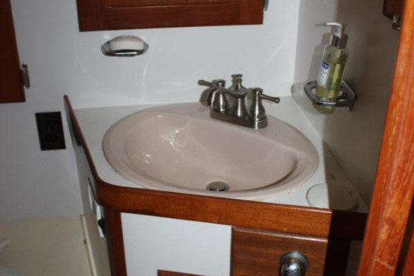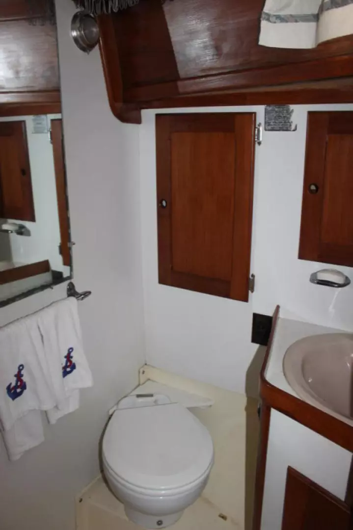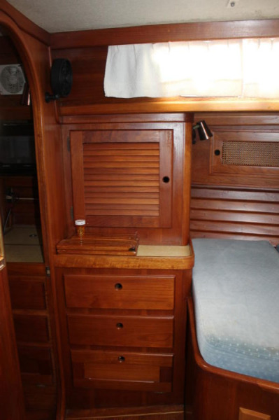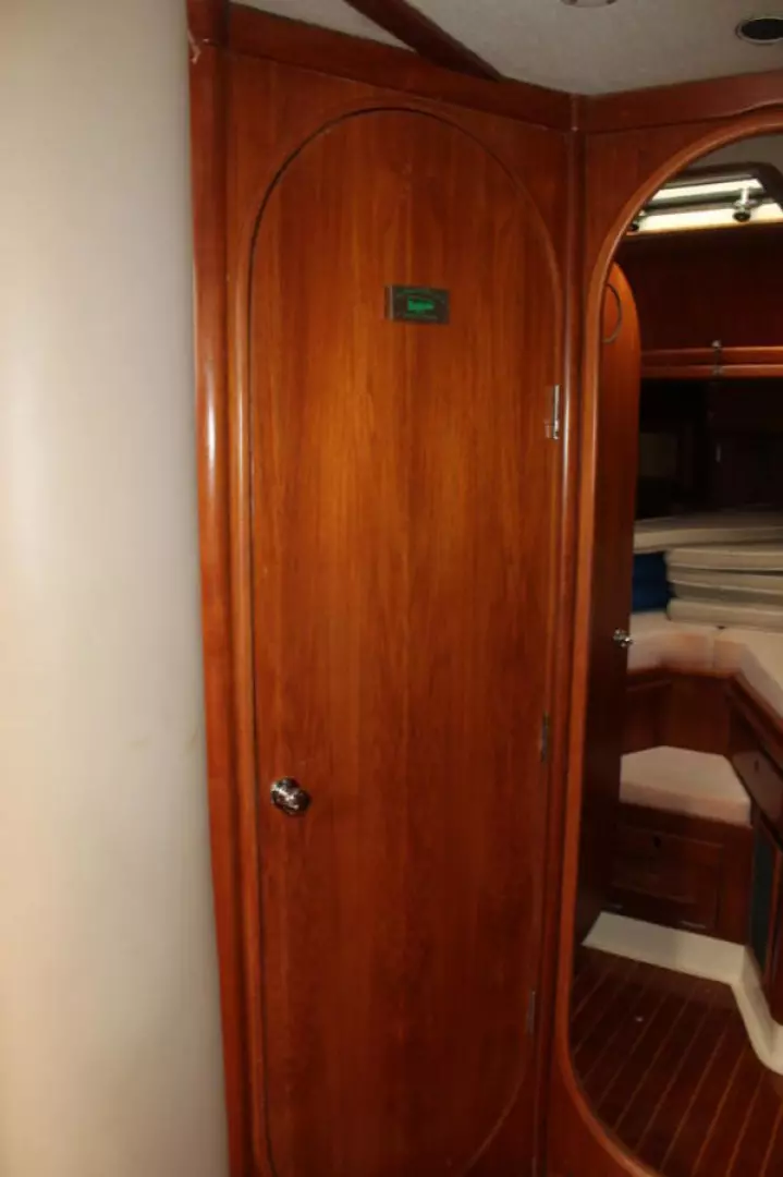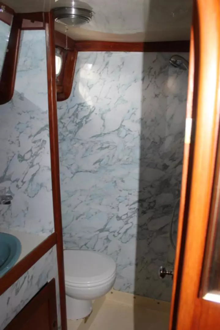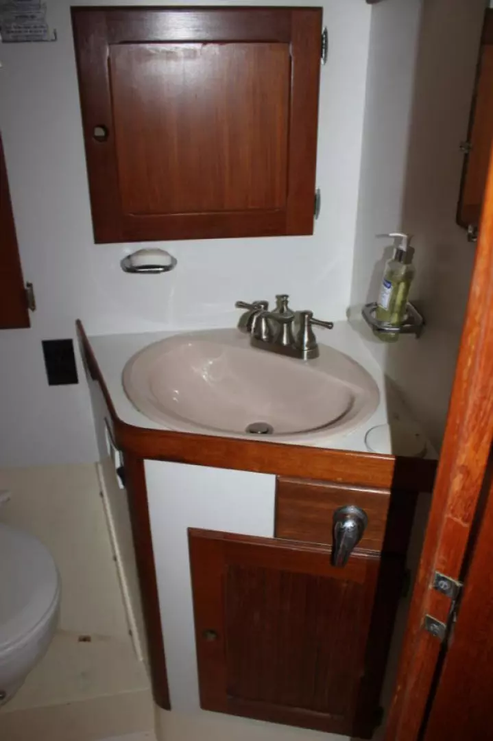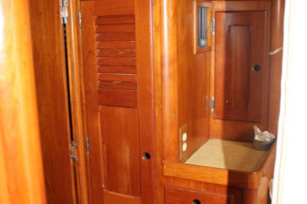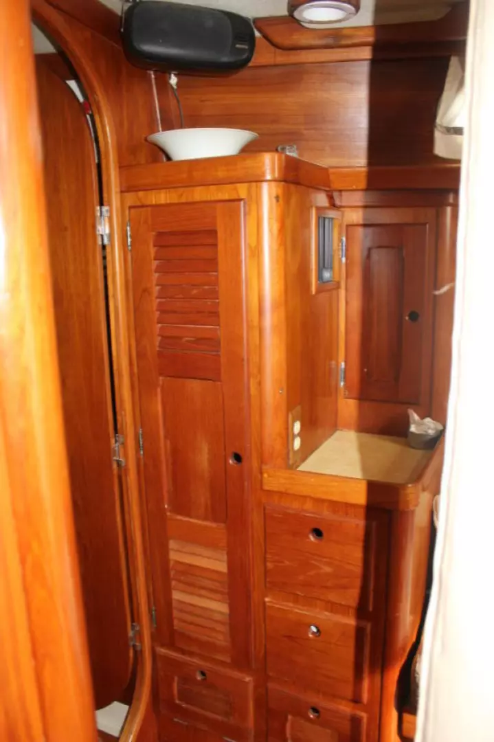 Aft of the Galley is the owner's stateroom with generous storage, V- berth, drawers and hanging lockers, and to port forward is the spacious head with a fresh water marine toilet, holding tank, vanity, storage, and shower area.