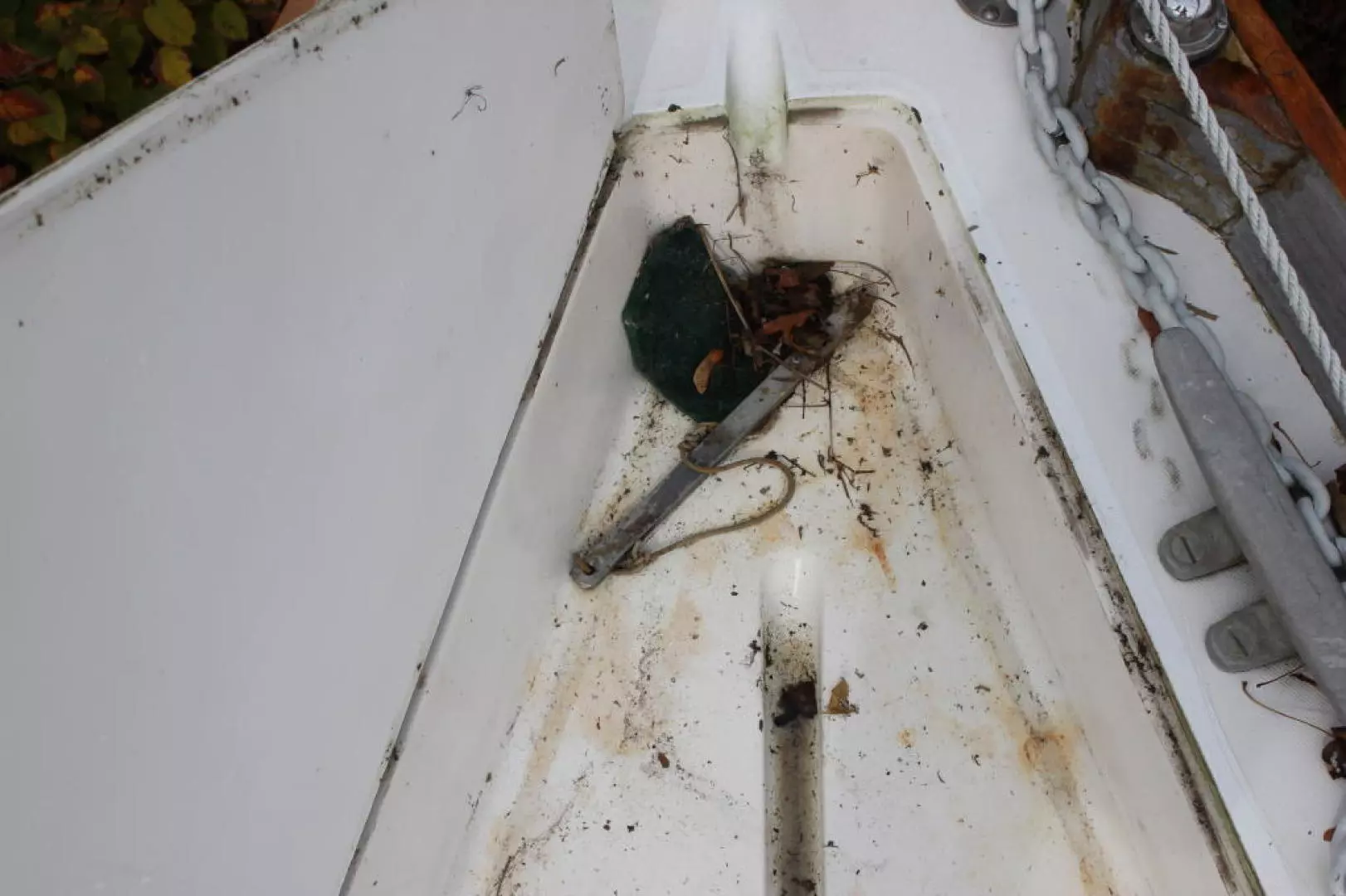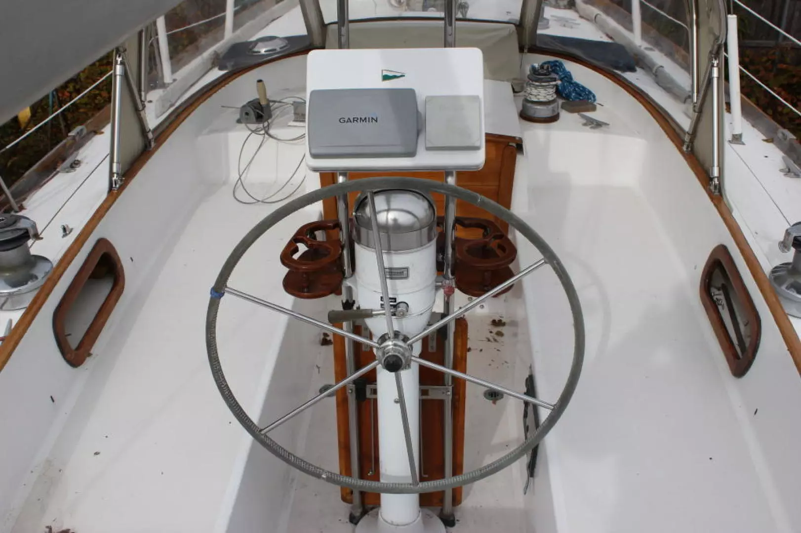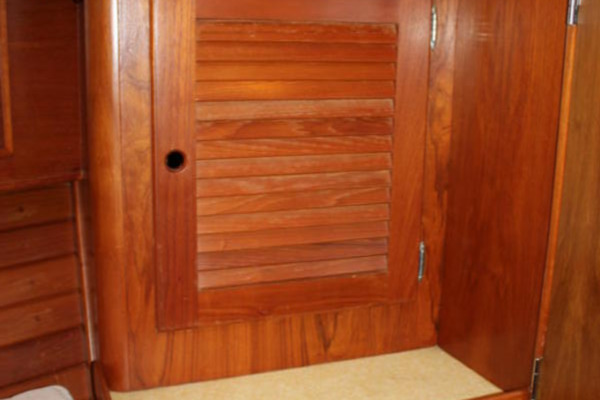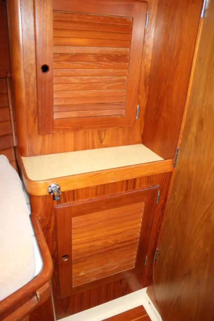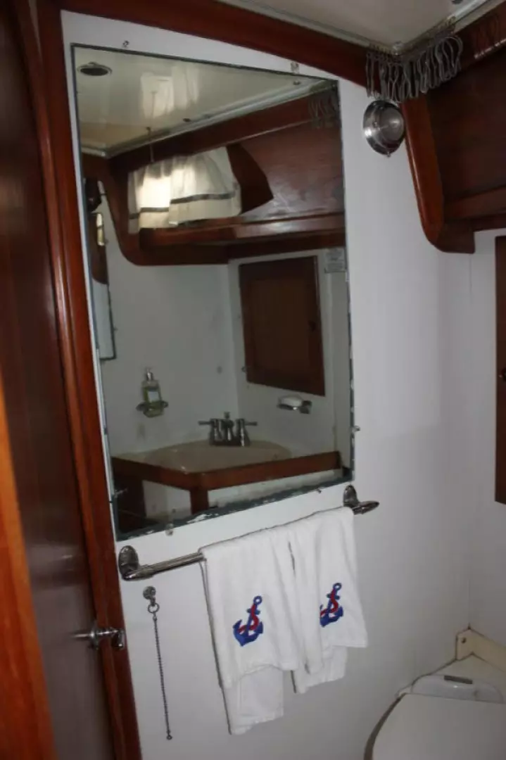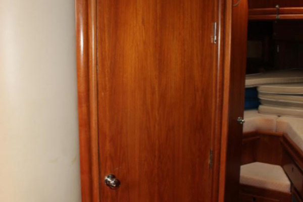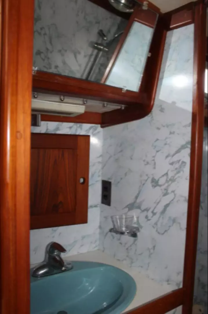 Aft of the Galley is the owner's stateroom with generous storage, V- berth, drawers and hanging lockers, and to port forward is the spacious head with a fresh water marine toilet, holding tank, vanity, storage, and shower area.