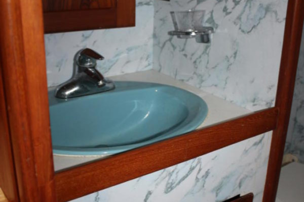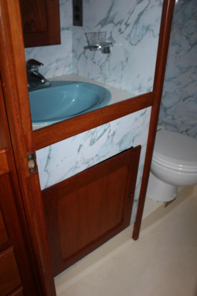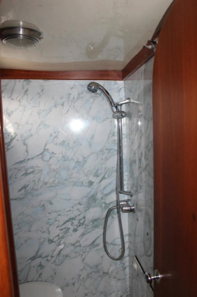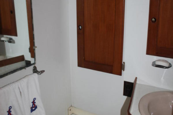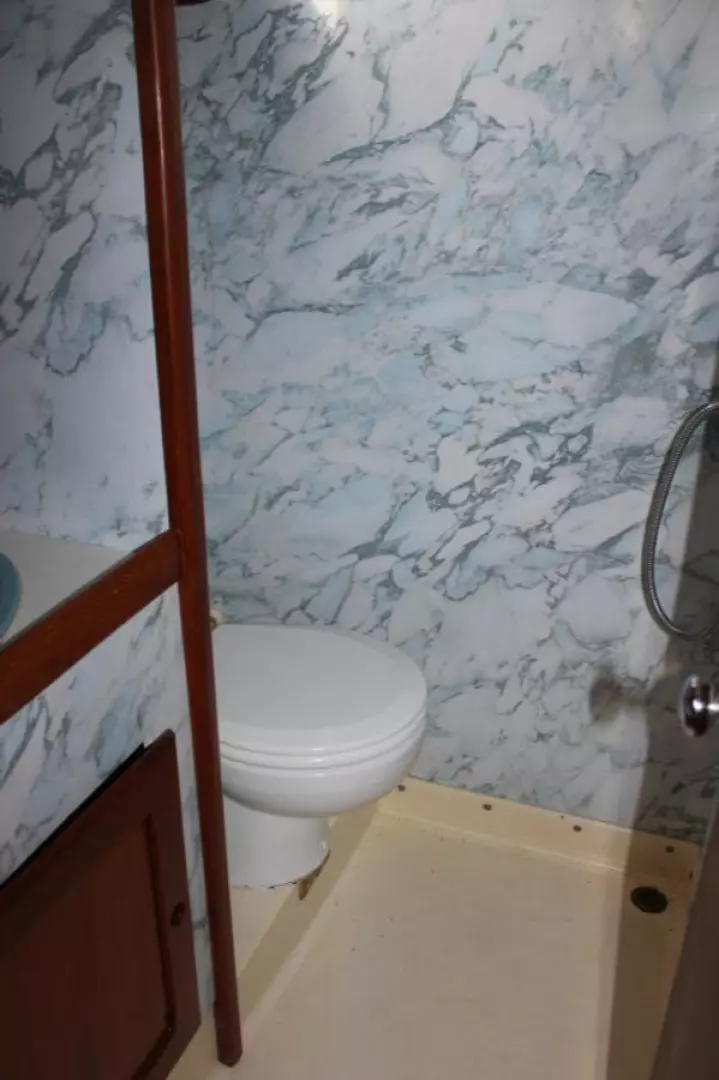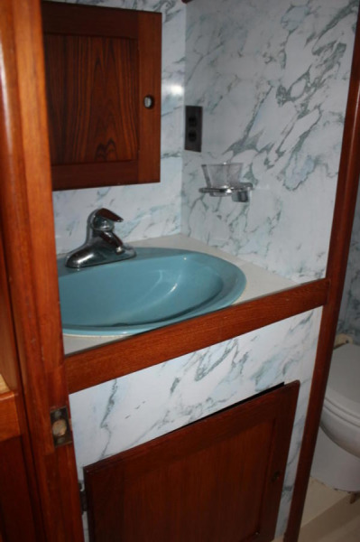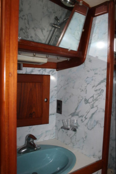 Forward is the guest stateroom featuring a V-Berth with storage aft to starboard and a full sized head with salt water marine toilet, sink, shower and two access doors-one from the salon and a private entrance from the forward stateroom.