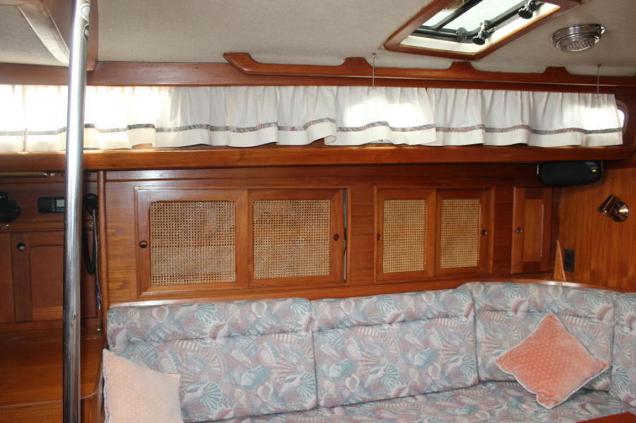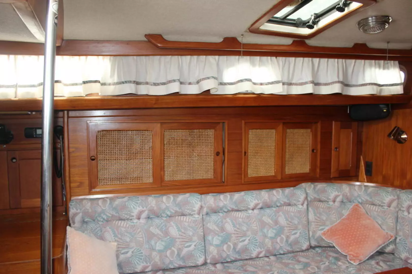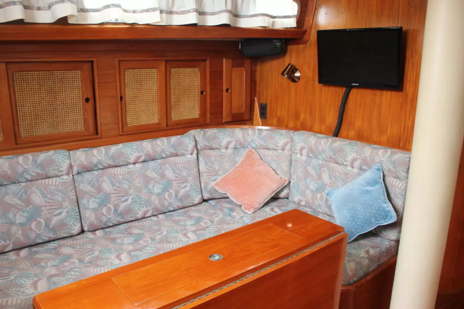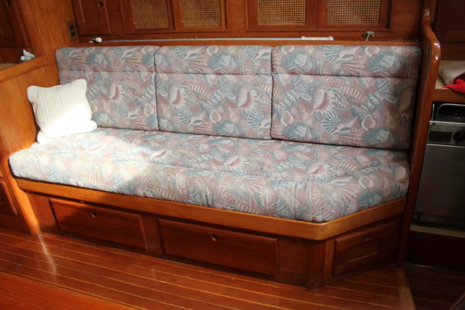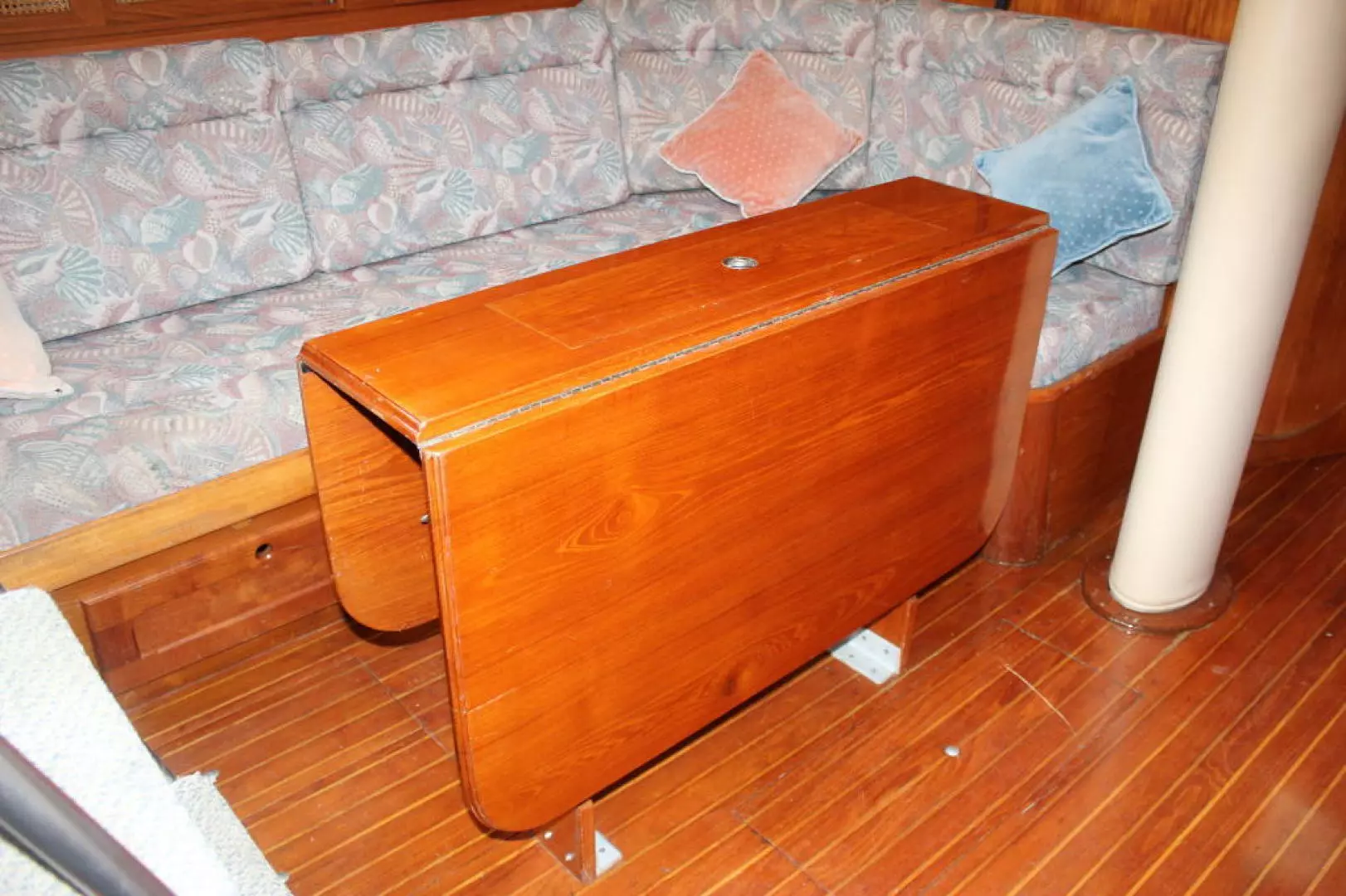 Enter the salon from the center cockpit companionway stairs. To port is an L-shaped settee that opens to create a double berth. On centerline is a folding varnished teak butterfly style table. To starboard is a full-length settee/berth. Storage behind and beneath all seat cushions.
