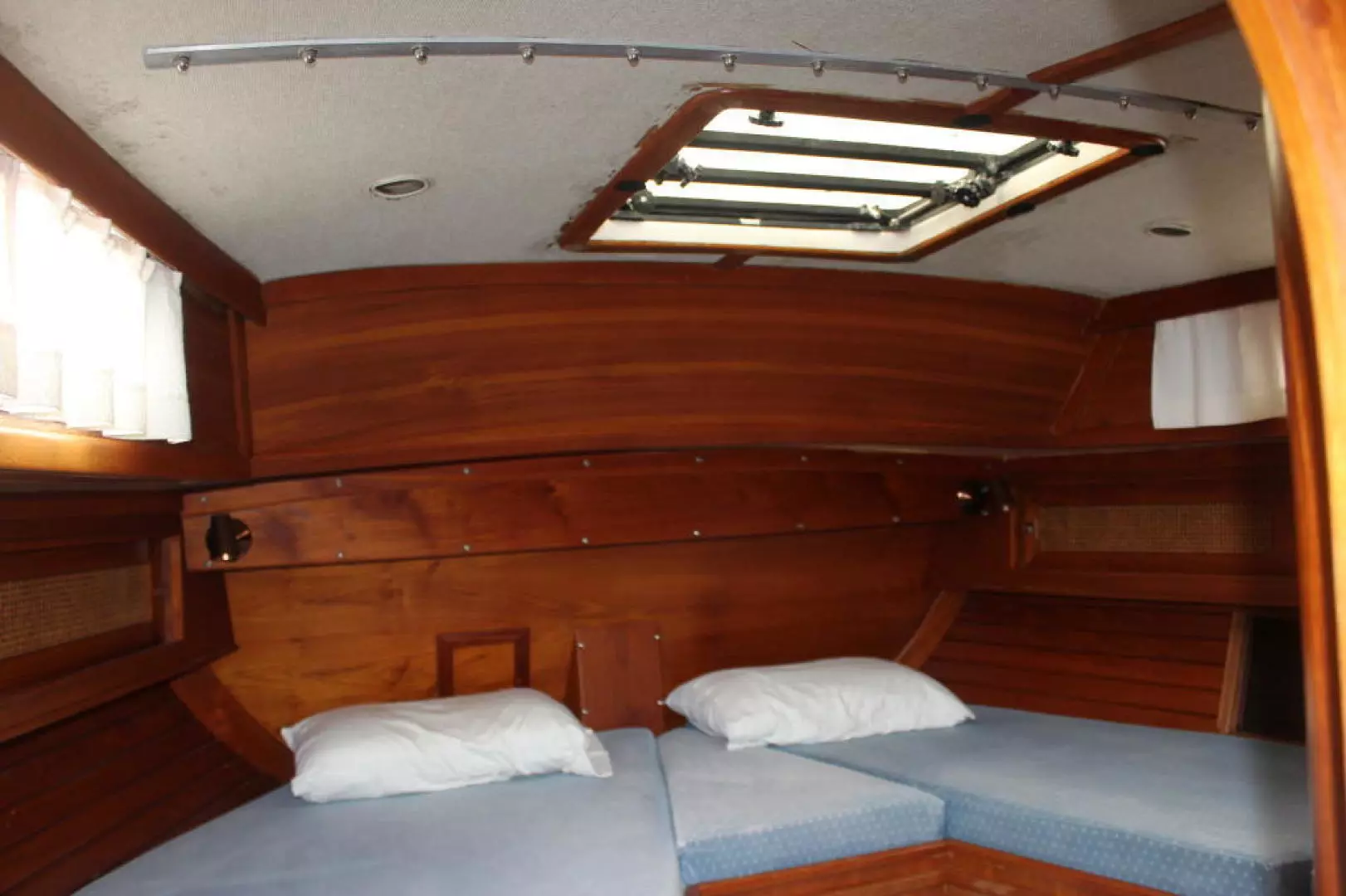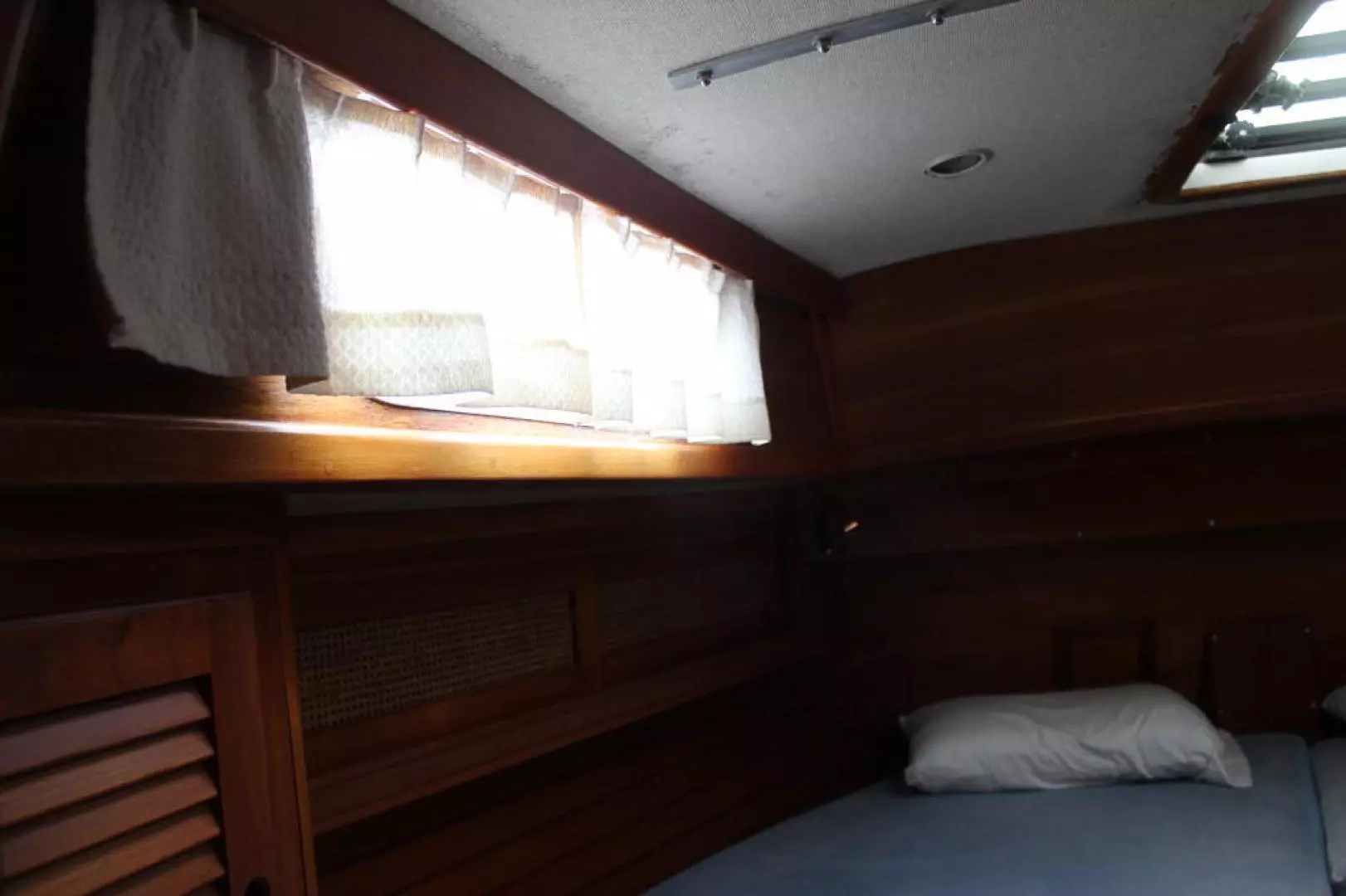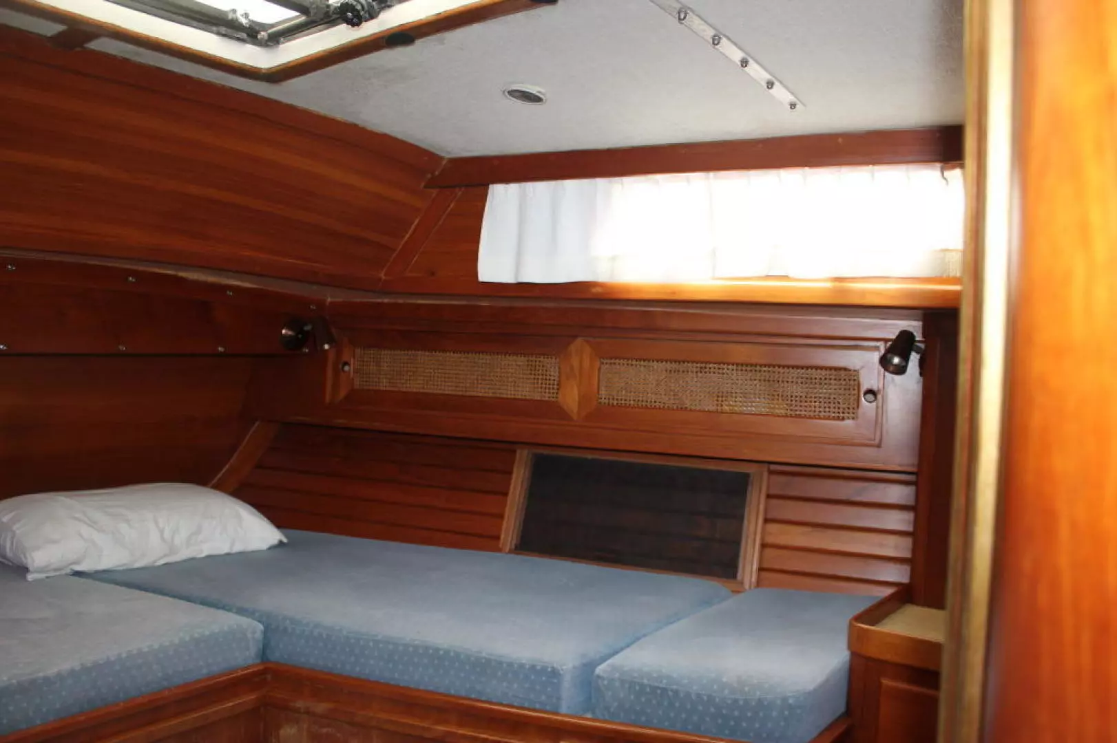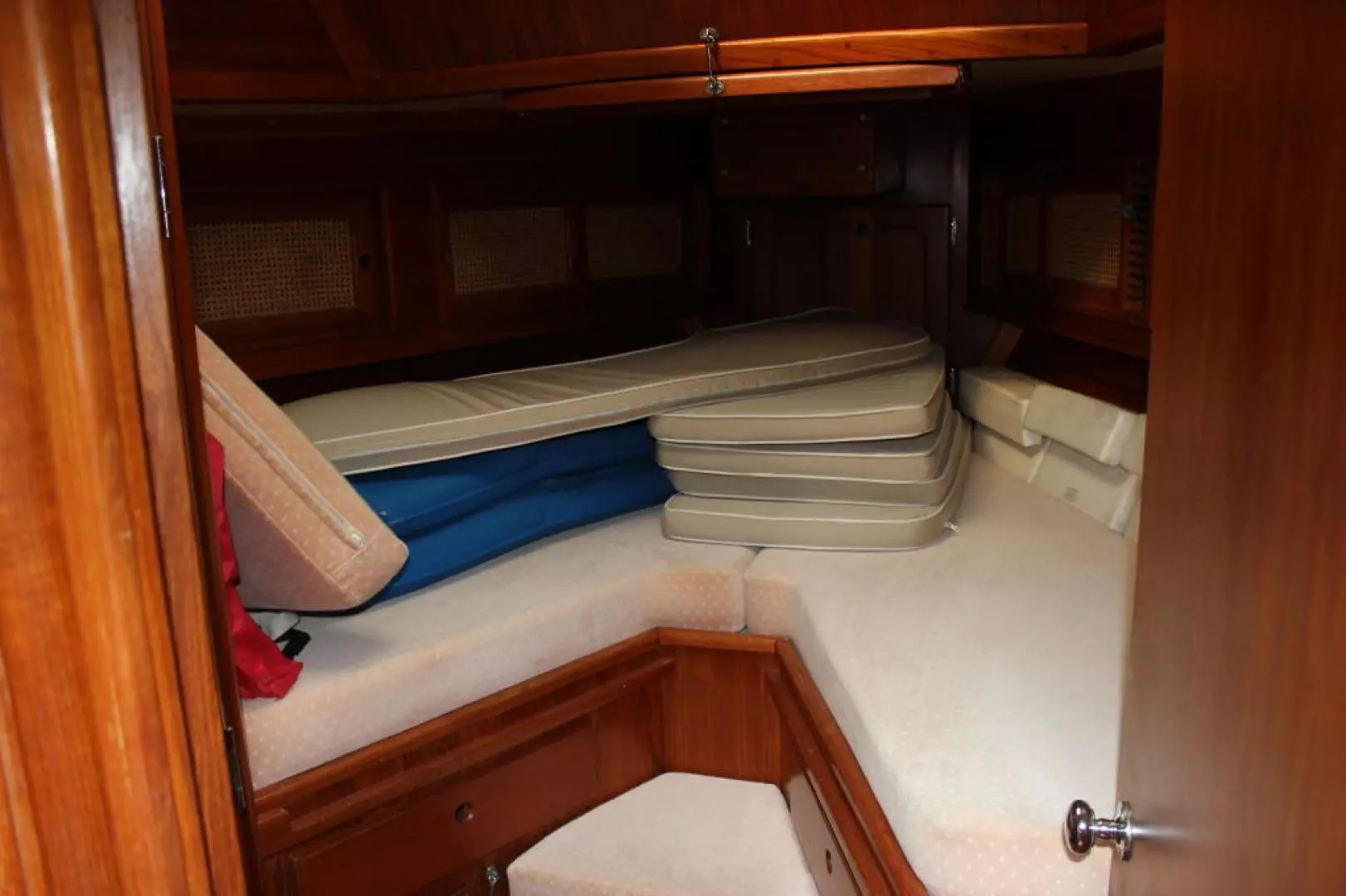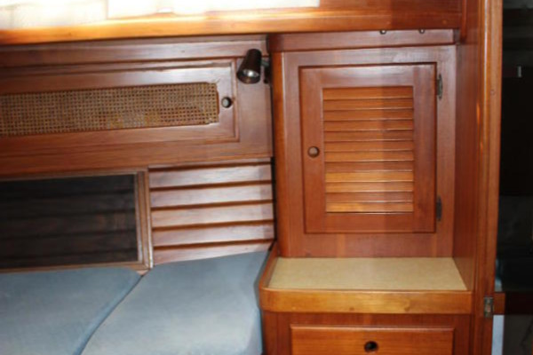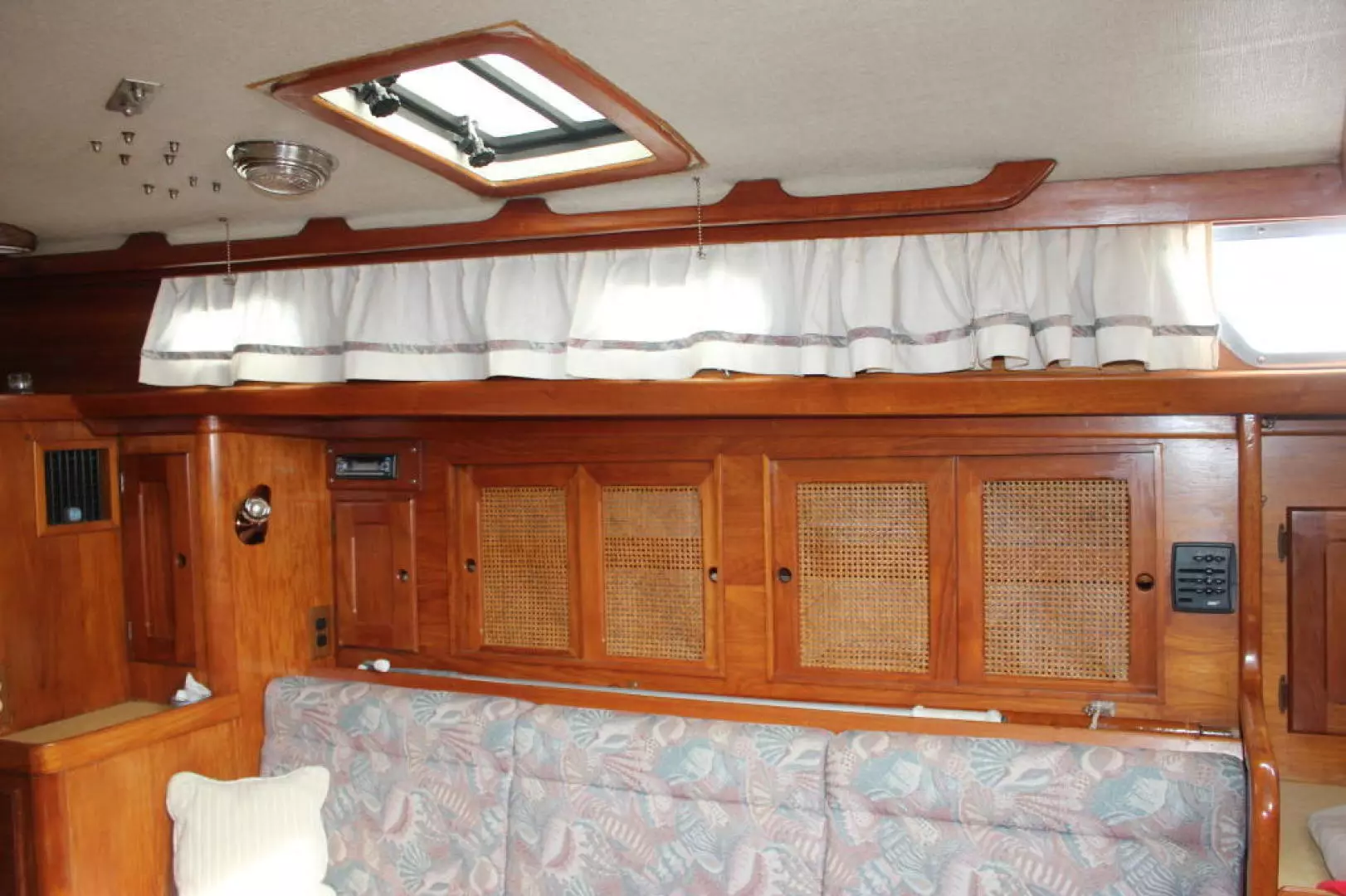 Enter the salon from the center cockpit companionway stairs. To port is an L-shaped settee that opens to create a double berth. On centerline is a folding varnished teak butterfly style table. To starboard is a full-length settee/berth. Storage behind and beneath all seat cushions.