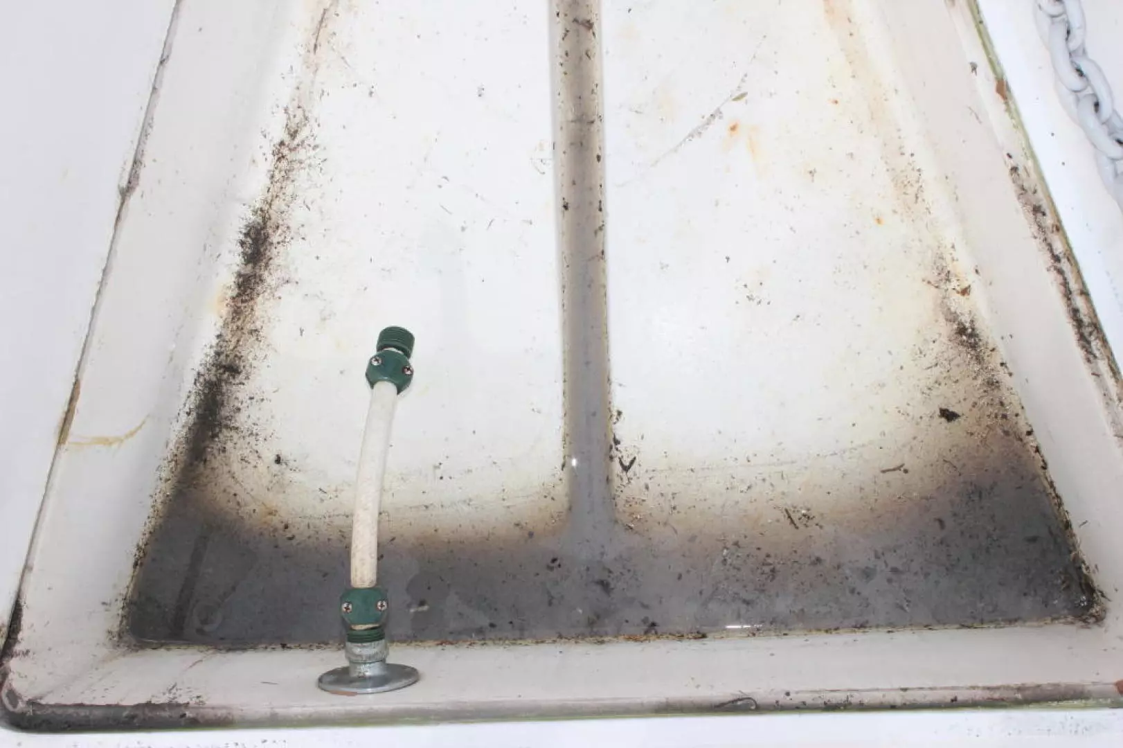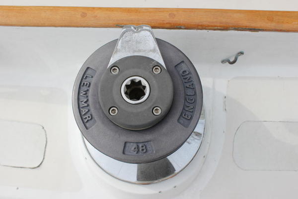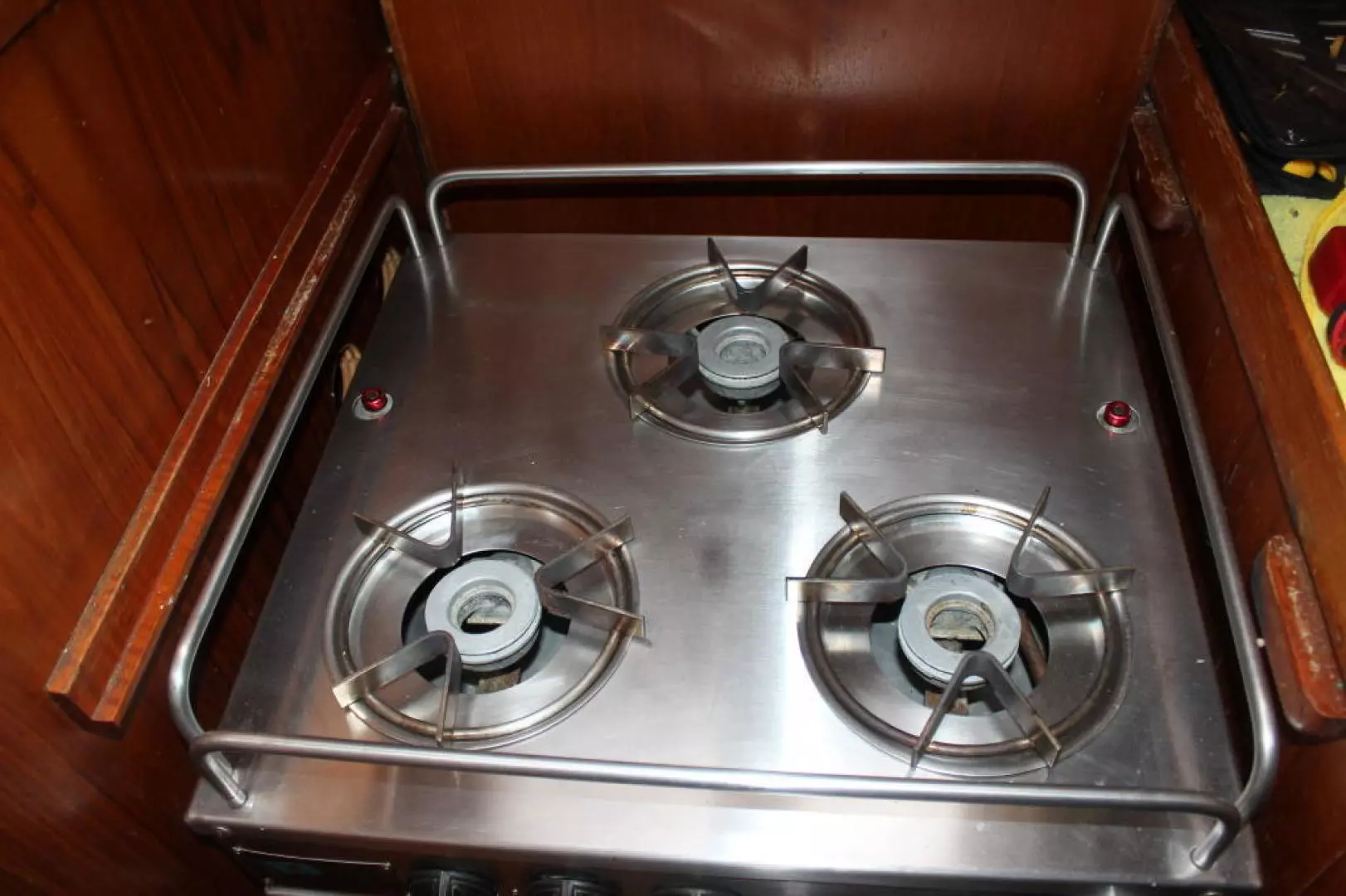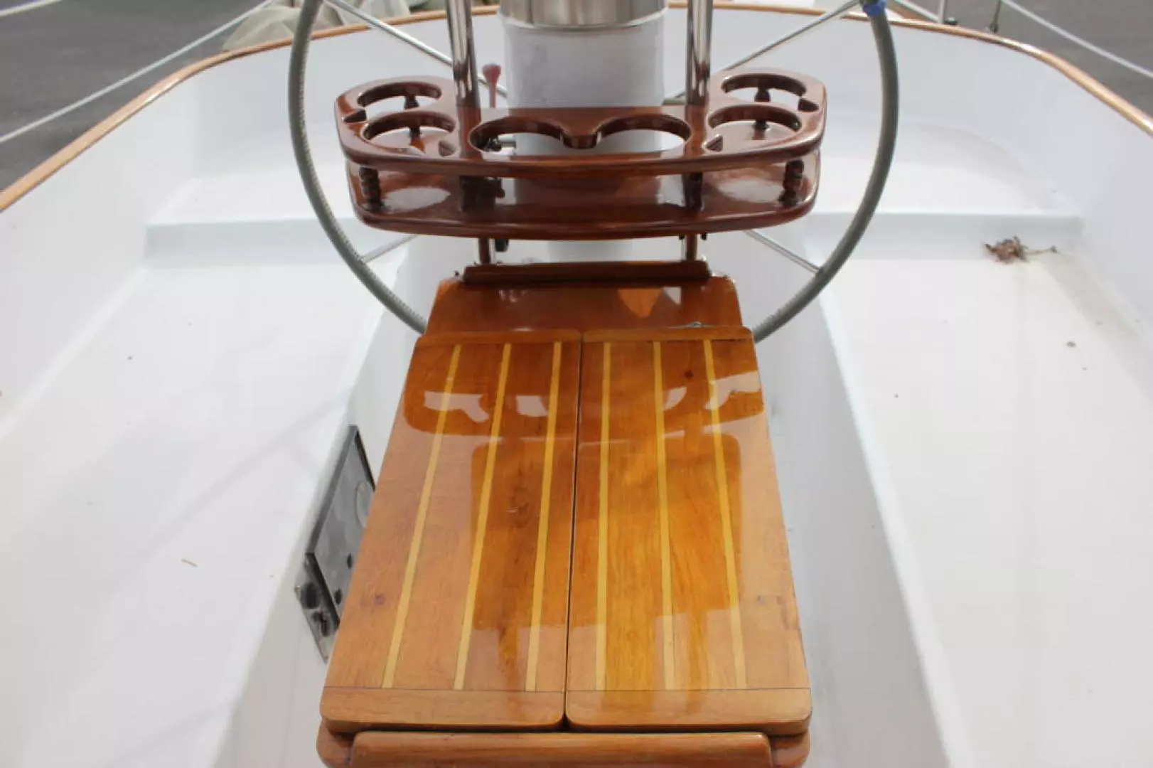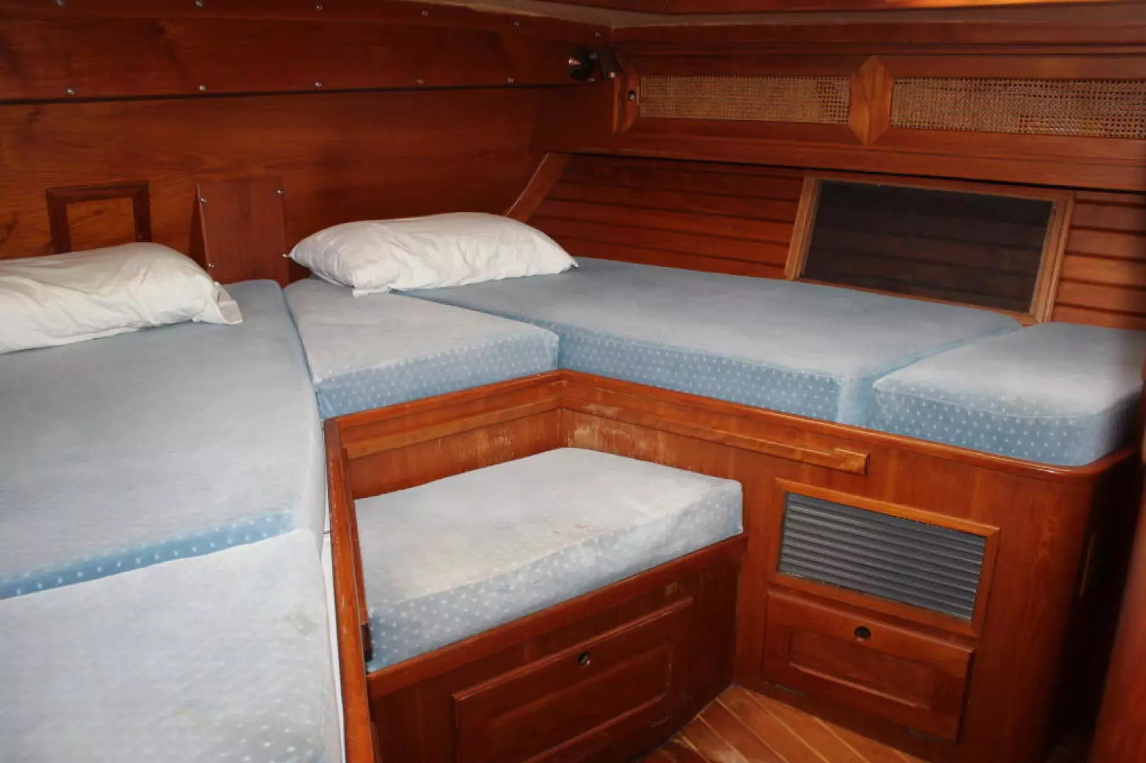 Enter the salon from the center cockpit companionway stairs. To port is an L-shaped settee that opens to create a double berth. On centerline is a folding varnished teak butterfly style table. To starboard is a full-length settee/berth. Storage behind and beneath all seat cushions.