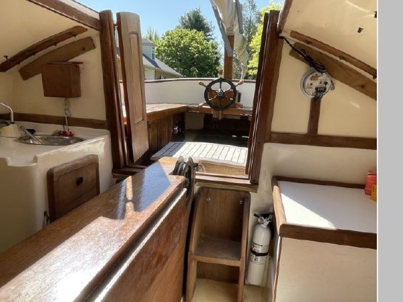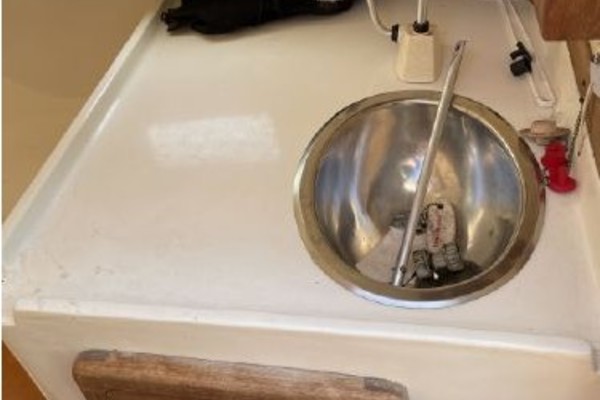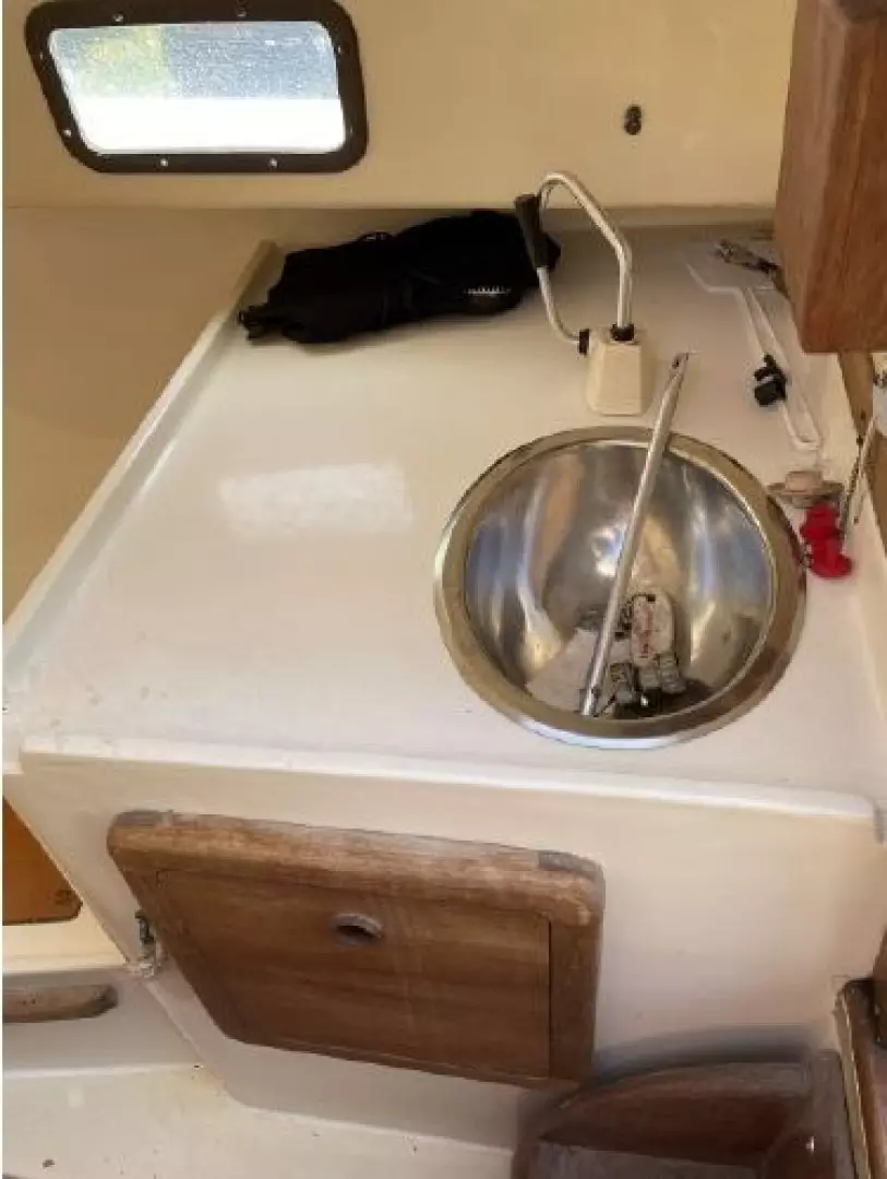 - To Starboard of the companionway is a counter with stainless steel sink and hand pump