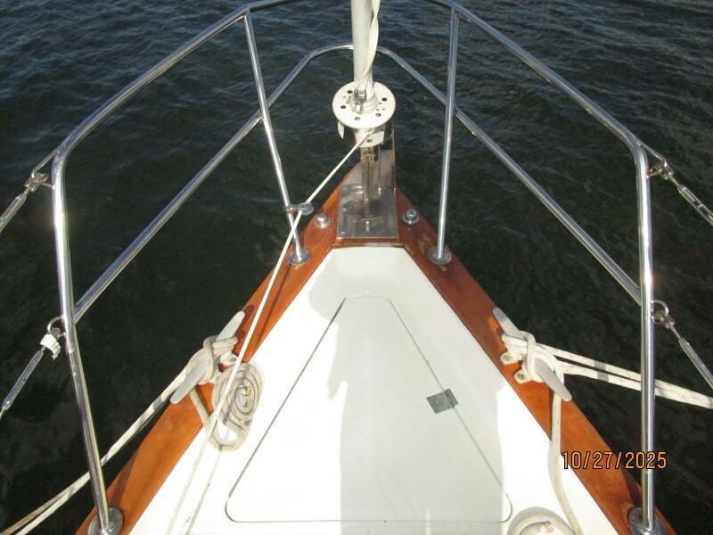 The forward stateroom offers a v-berth with an insert, overhead hatch, 2 portlights, shelves, storage cabinets and a privacy door. The head with 1/2 tub and shower is starboard aft.