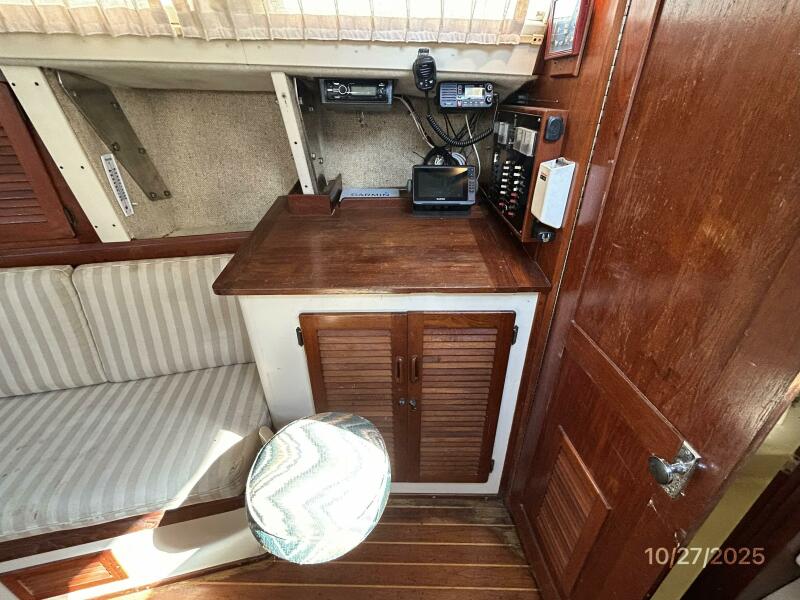 The nav station is starboard aft in the salon and offers a storage cabinet, electrical panel, VHF, Garmin multi-function display, Weems & Plath clock and barometer, 12 vdc outlet and a stereo.