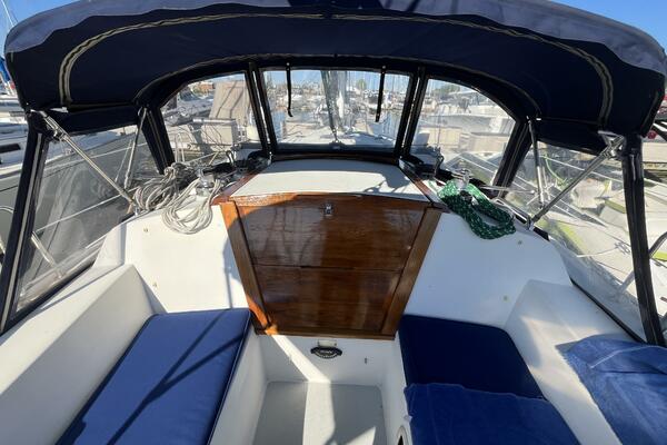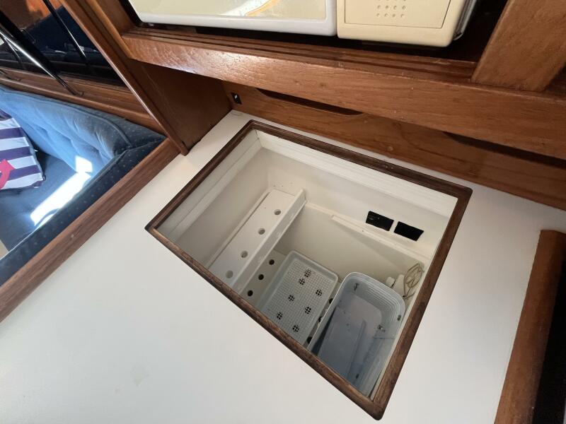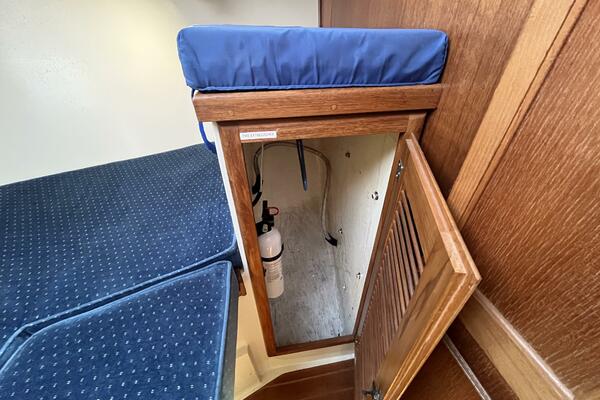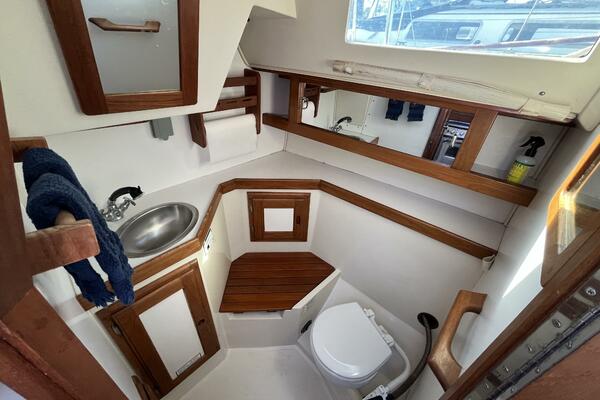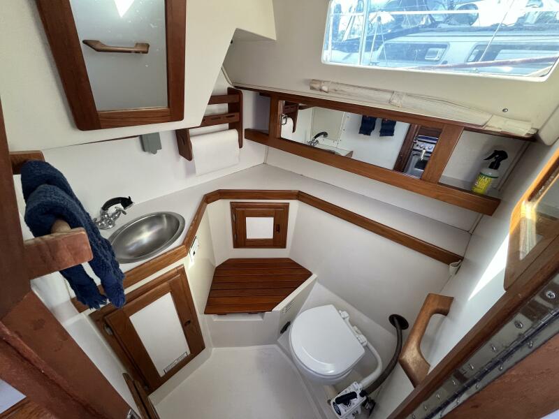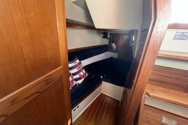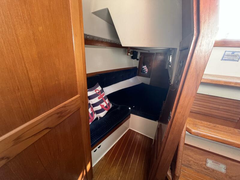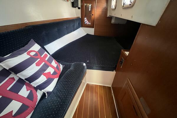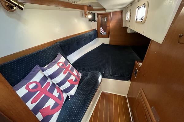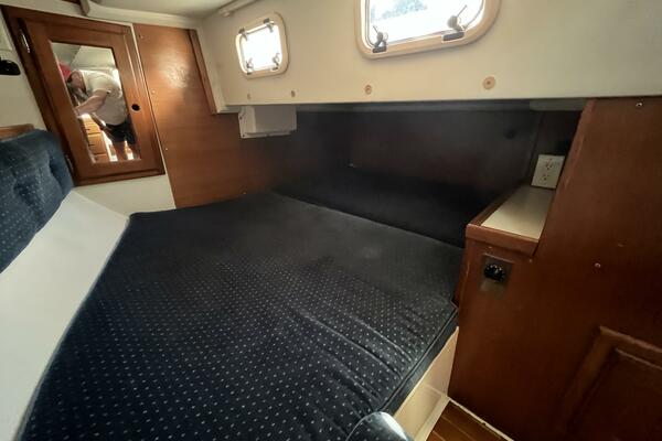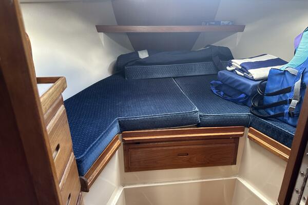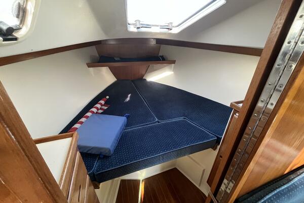 • The forward stateroom has a comfortable V-berth with a removable inset cushion to provide additional standing room. There is a forward storage shelf which is a convenient place to put the main hatch inserts while aboard. There is storage under the berth as well as one drawer for immediate access. There are three more drawers in a cabinet to port, a hanging locker to starboard, and storage shelves above each. There is a 12VDC fan, an overhead hatch, two opening ports, a privacy door leading aft, and two bright 12VDC LED brass lamps. September 26, 2025