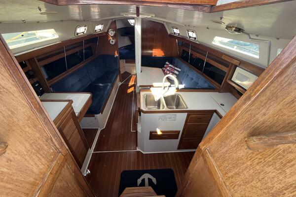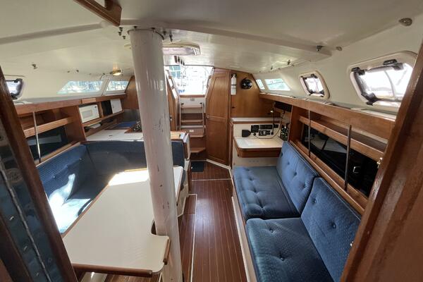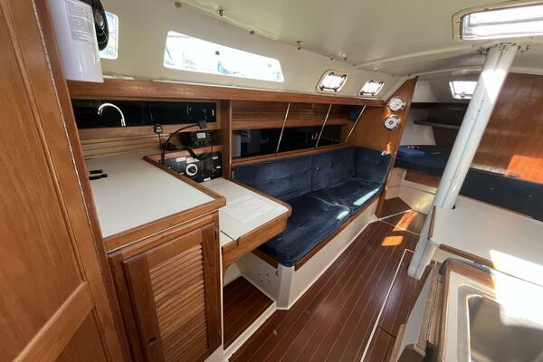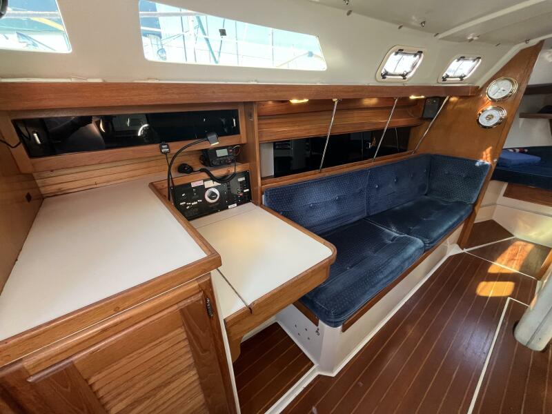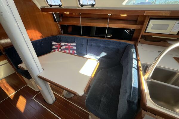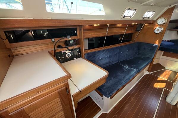 • Aft of that is the salon with a U-shaped dinette to starboard which comfortably seats four adults and converts to a double berth. There is storage behind and some beneath the seats, with access to the depth transducer and speed sensor. There is a settee to port large enough for 3 adults and with storage behind and some below. There is a quartz clock and an open dial barometer, both brass with 5” dials, both Weems & Plath Endurance II 135 models, on the forward bulkhead. There are shelves on both sides of the salon for storage of books and dishes.