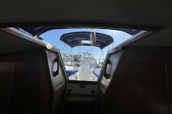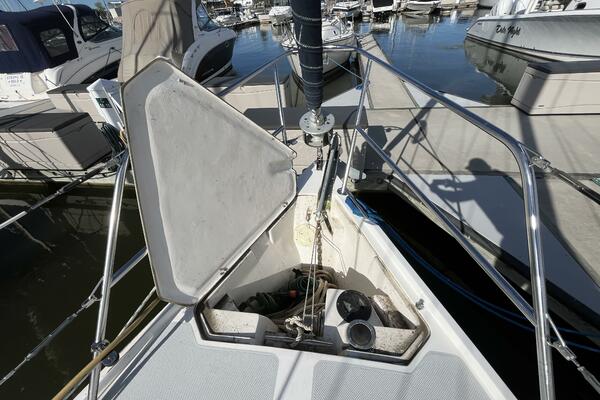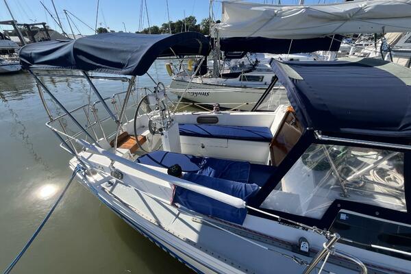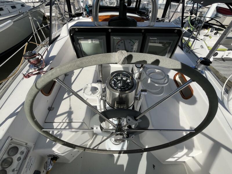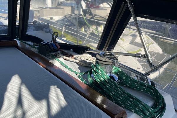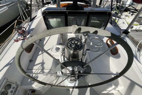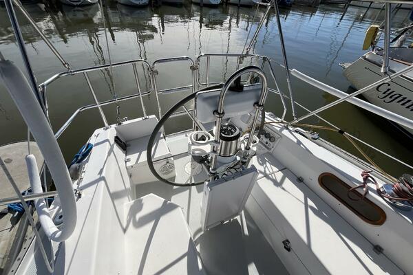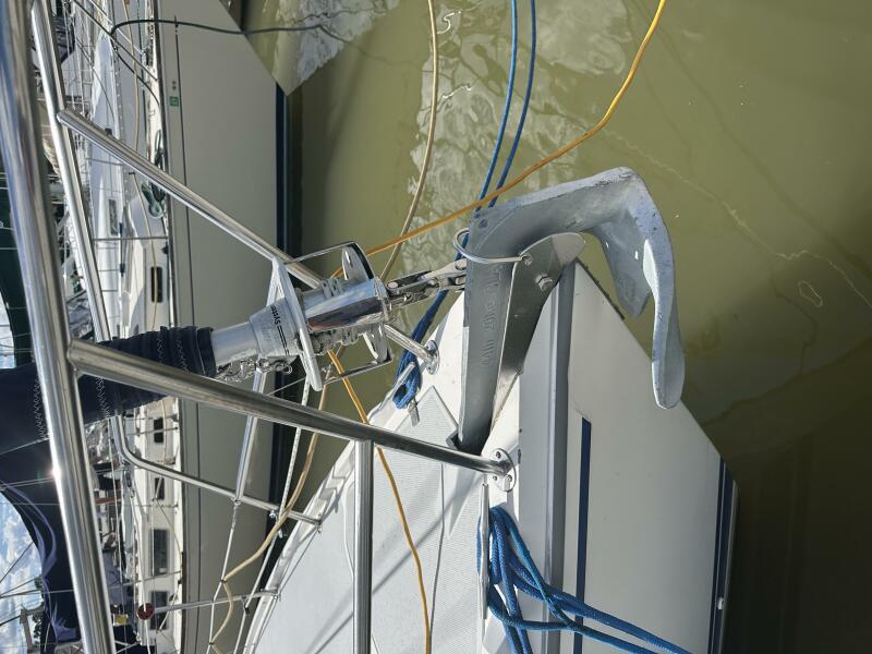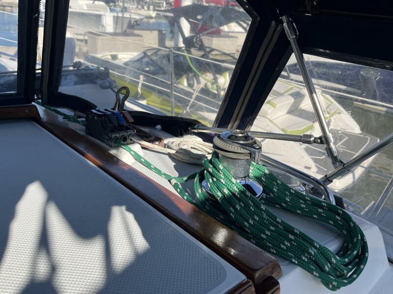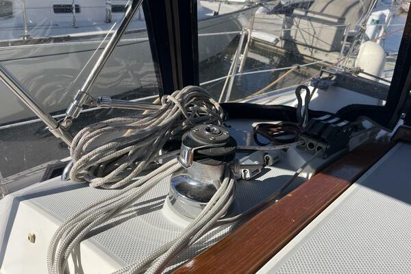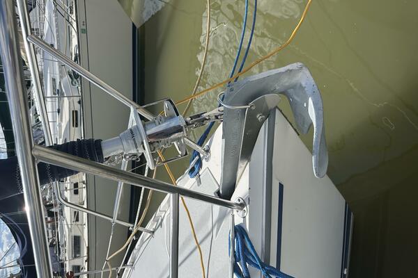 Walk-through transom, white hull with gray non-skid side decks. Dodger and Bimini with complete cockpit enclosure. Leather wrapped wheel. Maxwell anchor windless. Wash hose in anchor locker. New Lewmar 44 lb. claw anchor with 200’ chain/nylon rode. Two Lewmar #46 self-tailing primary winches, one #30 and one #40 self-tailing cabin top winches. Johnson Pump 4000 gal/hr bilge pump. Cockpit white poly fold down drop leaf tablewith drink holders. Magma party-size propane grill with new stainless-steel top and new grilling surface.
