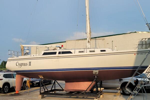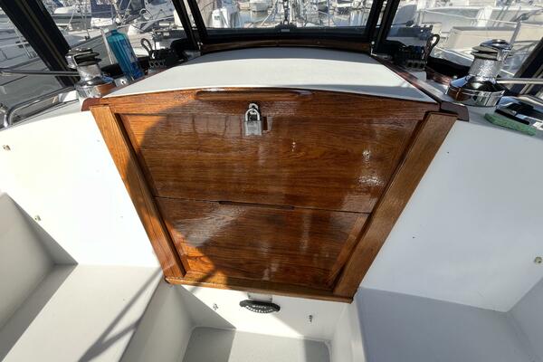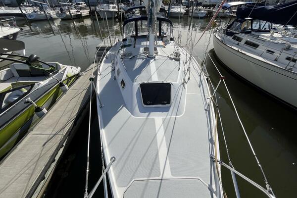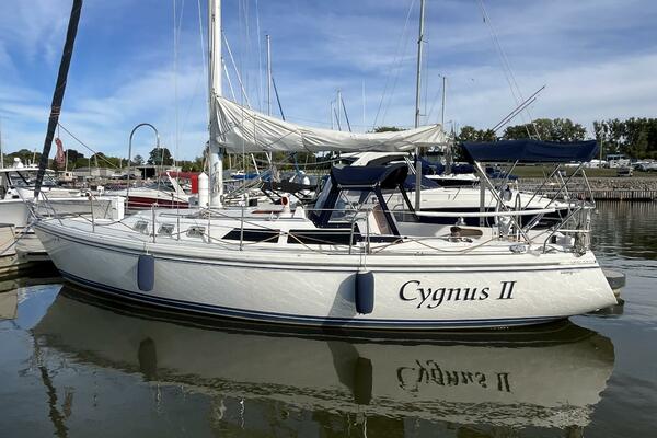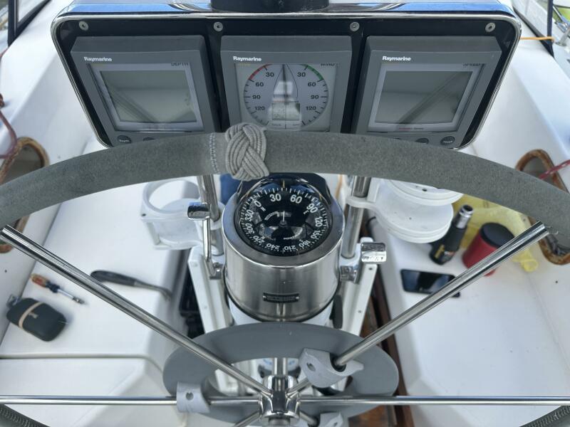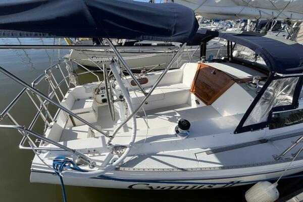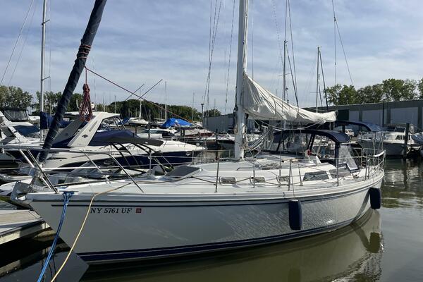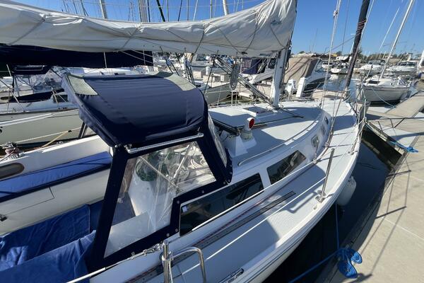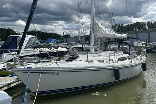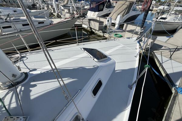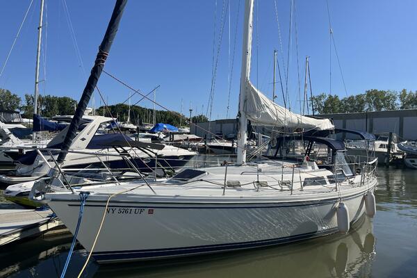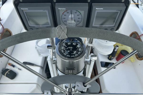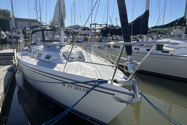 Walk-through transom, white hull with gray non-skid side decks. Dodger and Bimini with complete cockpit enclosure. Leather wrapped wheel. Maxwell anchor windless. Wash hose in anchor locker. New Lewmar 44 lb. claw anchor with 200’ chain/nylon rode. Two Lewmar #46 self-tailing primary winches, one #30 and one #40 self-tailing cabin top winches. Johnson Pump 4000 gal/hr bilge pump. Cockpit white poly fold down drop leaf tablewith drink holders. Magma party-size propane grill with new stainless-steel top and new grilling surface.