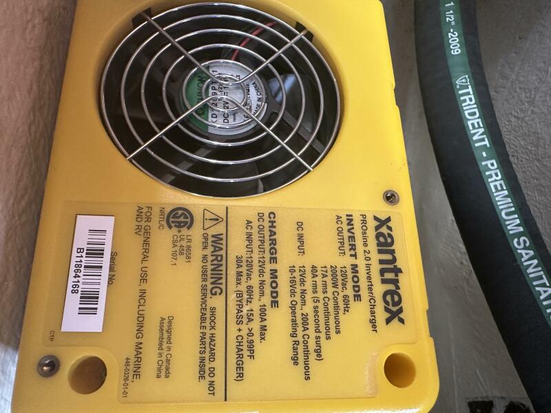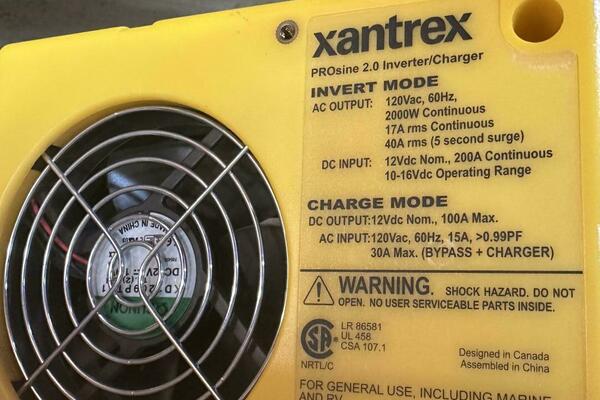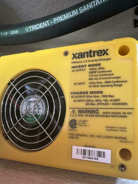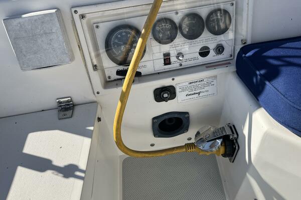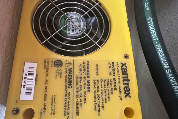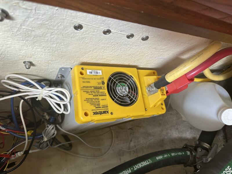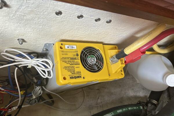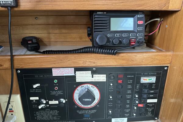 Electronics Uniden ES UM525 VHF radio with DSC. Raymarine ST60 speed and depth meters, autopilot. Fusion MS-CE600 Stereo with cockpit speakers. Complete upgrade of primary electrical system in 2009: upgrade main cabling to 1 AWG, four T125 Trojan Golf Cart Batteries 480 AH @ 12V (approx. 3 years old), extra engine start battery (2 years old), Balmar 80 amp alternator, Prosine 2.0 2 KW pure sine wave inverter with 100 amp charger (can be programmed for less charging current to prevent shore power circuit breaker trips).