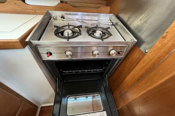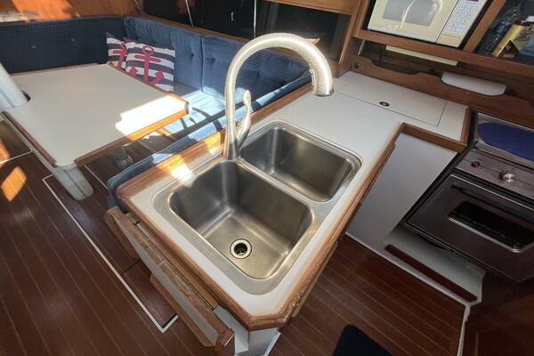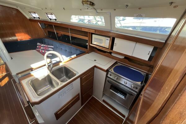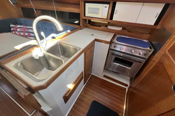 • Aft of the dinette is the L-shaped galley including double stainless steel sinks, hot and cold pressure fresh water system, the top loading Adler-Barbour refrigerator with freezer compartment, two burner Hillerange propane stove with oven and removable cutting board, plus storage for food and dishware. The microwave uses no counter space but is conveniently situated for easy use.