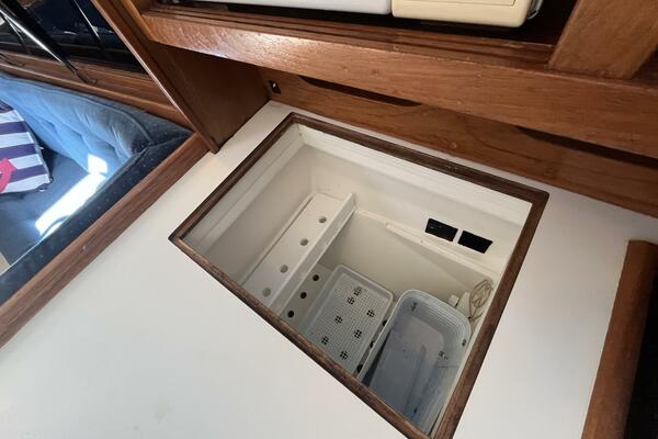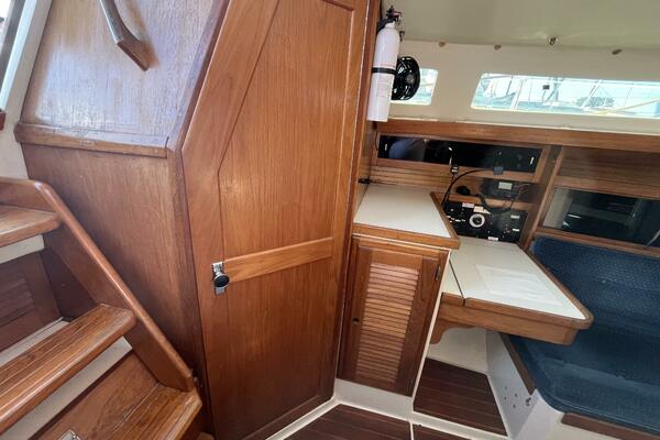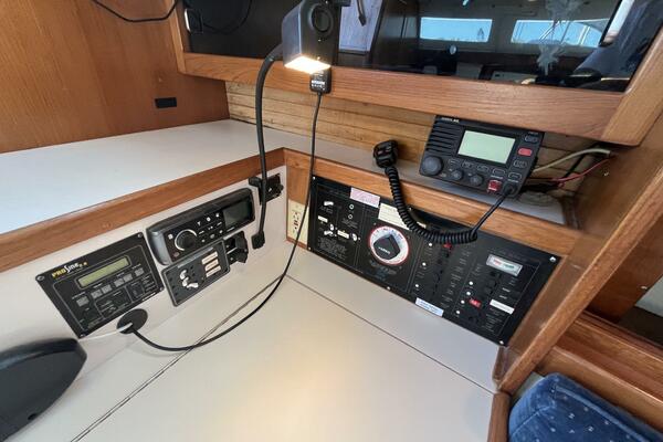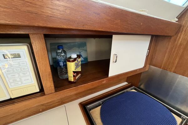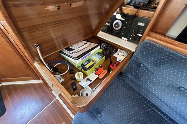 • Aft of the settee is the navigation station with chart desk opening for chart storage. The 120VAC and 12VDC electrical panels are next to the desk. There is storage above the electrical panels, and a shelf above the chart desk. There is a convenient long-neck adjustable lamp above the desk. Below the shelf and behind the chart table is a utility cabinet.