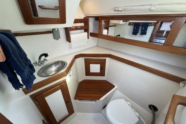• Aft of the chart desk is the head with a marine toilet, vanity with a stainless steel sink, and mirrored storage cabinets.