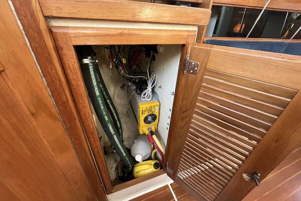 Steel cradle Two winch handles Telescoping boat hook, Hatch tent, Winch and propeller maintenance materials Radar reflector that stores flat Many equipment manuals, most in PDF format so they can be saved and viewed on one’s cell phone, tablet, and laptop. Emergency supplies, including a USCG Approved buoyant electronic flare with daytime signal flag (approved replacement for pyrotechnic flares), safety jackline, 6 thru-hull plugs, sail repair fabric, self sealing repair tape Spare parts, including several engine seawater cooling pump impellers, Universal engine V-belt, bilge pump valve, rigging tape, fuel filters, filter wrenches, 300 amp fuse for inverter/charger, stuffing box packing, stuffing box wrenches, Delta recessed aerator wrench for the galley faucet, caps for the engine coolant overflow tank.