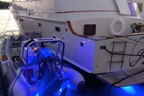 A 2021 Vikings Gala tender with 60HP Yamaha outboard sits securely on the Marquipt hydraulic self-rotating davit, making tender operations effortless.