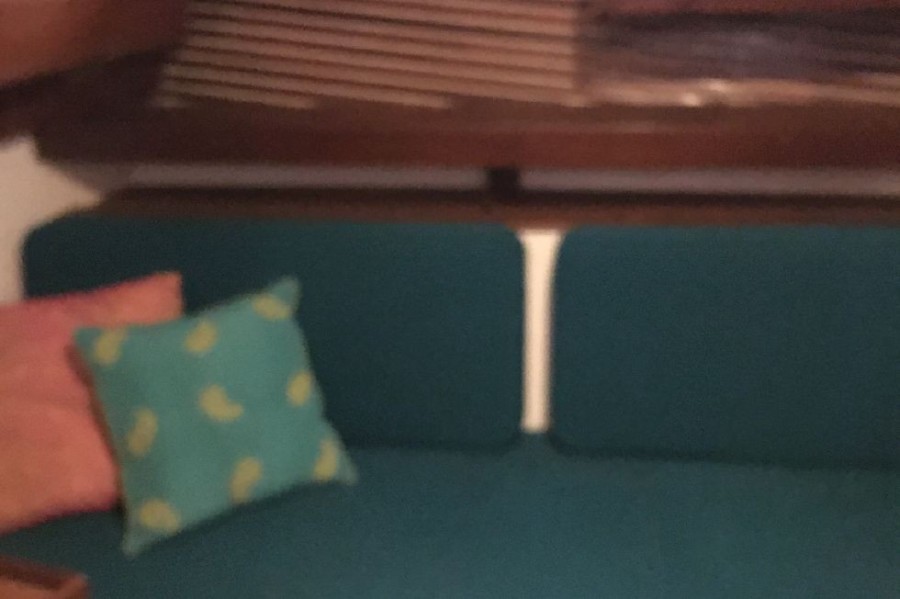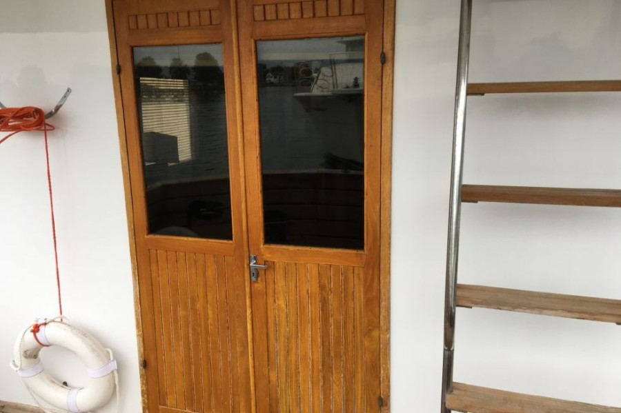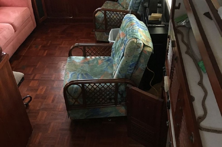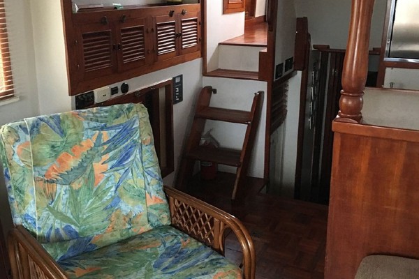From the afterdeck, double doors lead into the salon. Large sliding windows and 6'6" of headroom create a well lit open space. She has a large sofa to starboard and two chairs to port. Teak Parquet flooring through out adds to the warmth below
