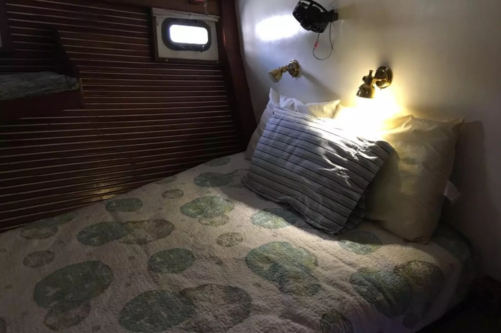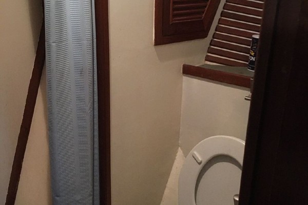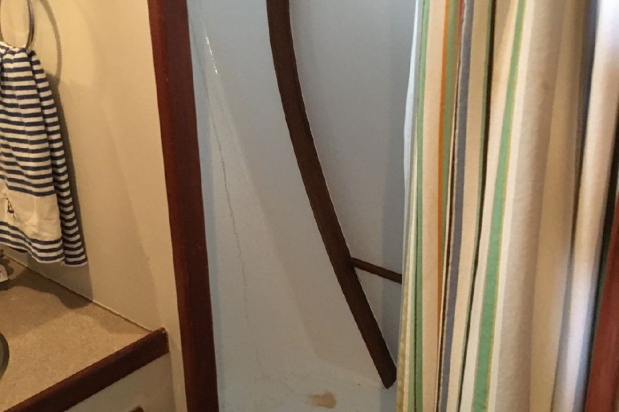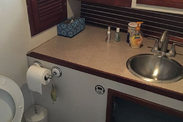 The master stateroom at the forward end of the passageway has an offset double berth to starboard with handing locker and shelves to port and private head with shower in the forepeak. The guest stateroom is to starboard off the passageway featuring upper and lower single berths. One berth folds up so as to create a nice office should that be more desirable. A head with separate shower stall is located across from the guest stateroom.