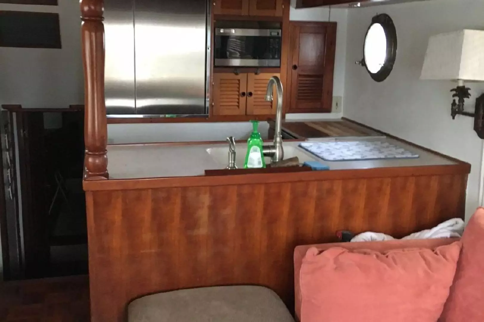 The U-Shaped galley is located starboard at the forward end of the salon. Next to the galley and down a couple of steps is the access to the Master cabin and guest cabin. Outboard to port is the access to the pilot house.