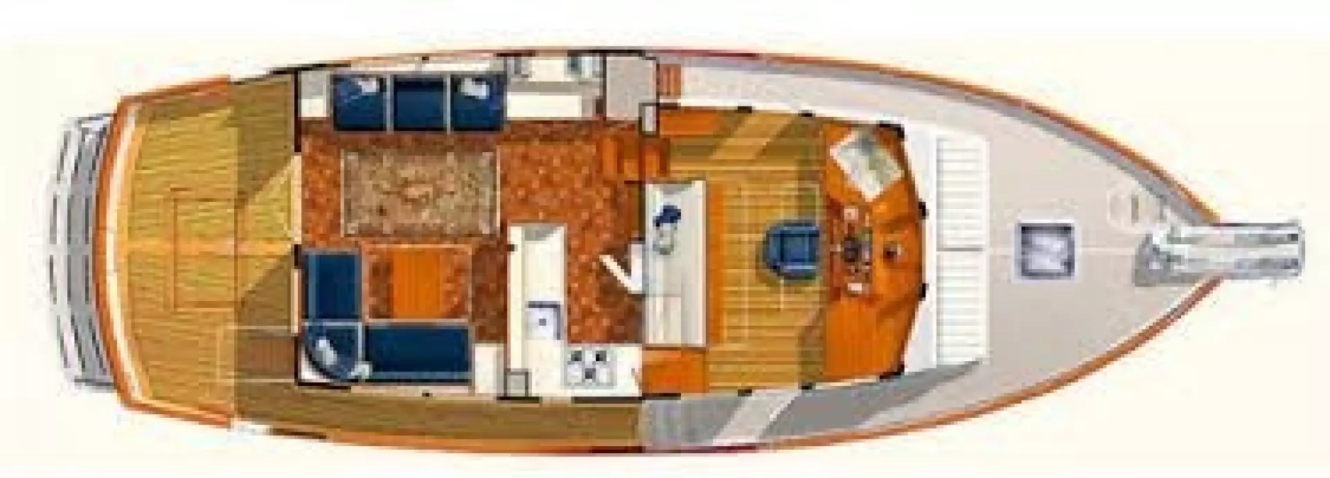 Up several steps to the Pilot house where one will find port and starboard doors giving access to the side decks. Centerline helm and large settee aft.