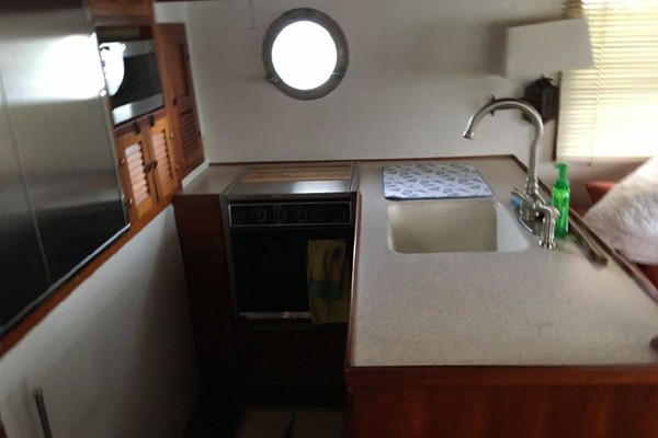 - Large U-shaped Sea Galley to starboard and forward in salon;Corian counter tops with built-in sink, and hot and cold pressure water