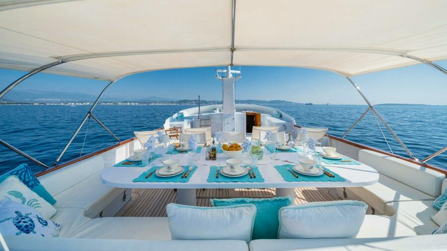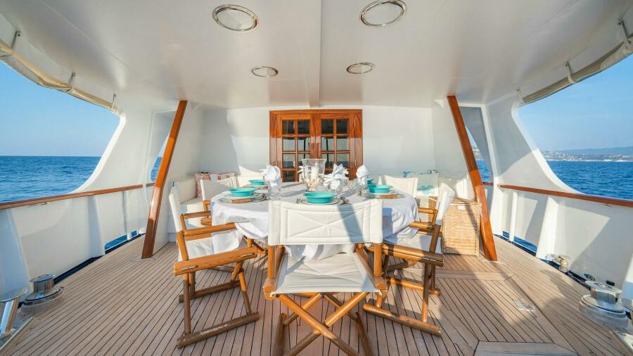 As you step onboard, you are welcomed by an inviting external dining area. This space offers protection from the elements, thanks to retractable awnings that can shield you from wind or rain. At the centre of the deck is a large teak dining table with seating for six guests, surrounded by comfortable sofa seating areas, perfect for breakfast or more formal gatherings.