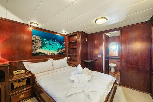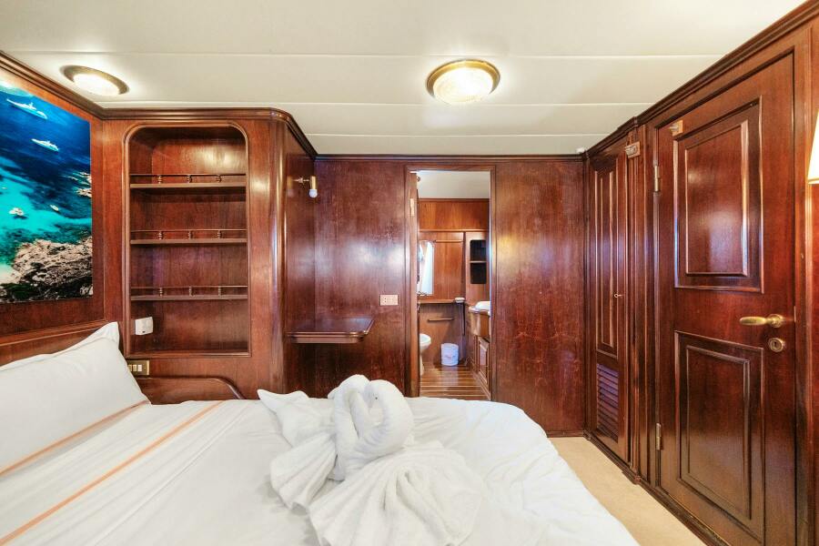 The separate guest accommodations are located forward of the main salon, accessible via their own private staircase. This area includes a luxurious double VIP cabin, complete with its own en suite bathroom, as well as two twin cabins, each featuring en suite facilities.