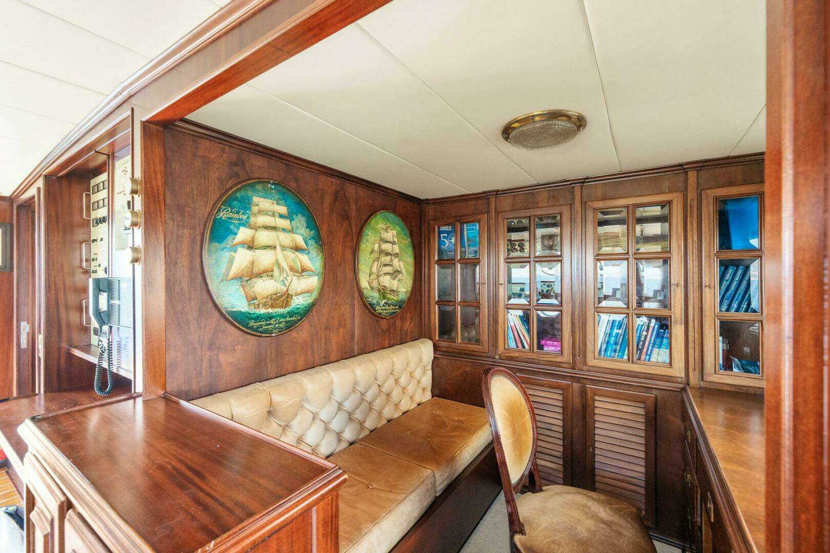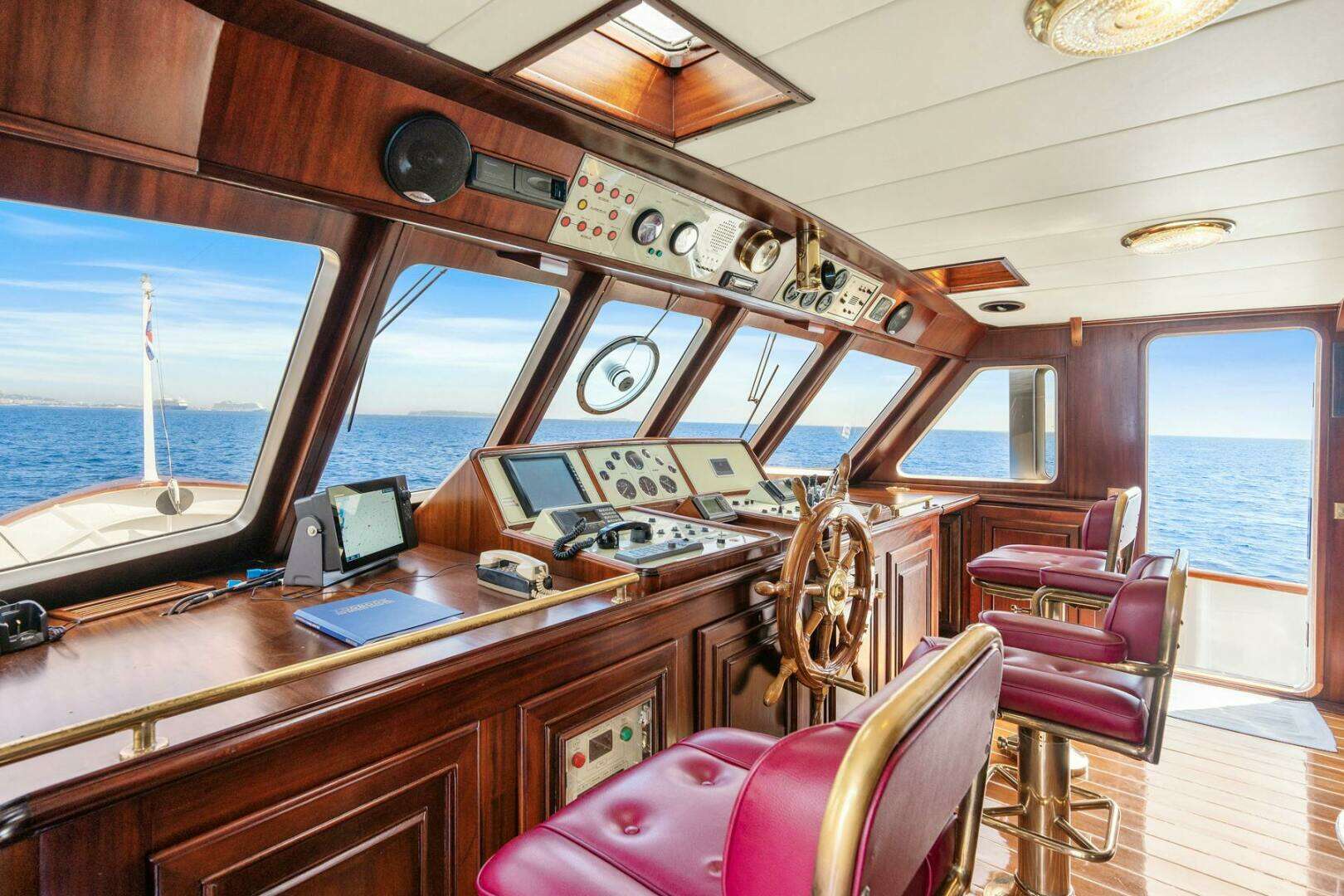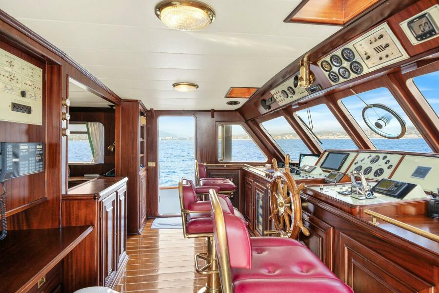 The classic wheelhouse is equipped with three bronze navigation seats, each upholstered in rich burgundy leather. The design stays true to the vessel's classic style while incorporating modern features, including upgraded Furuno navigation systems. To the port side, there is a spacious captain's office with easy access to both the port and starboard wing stations.