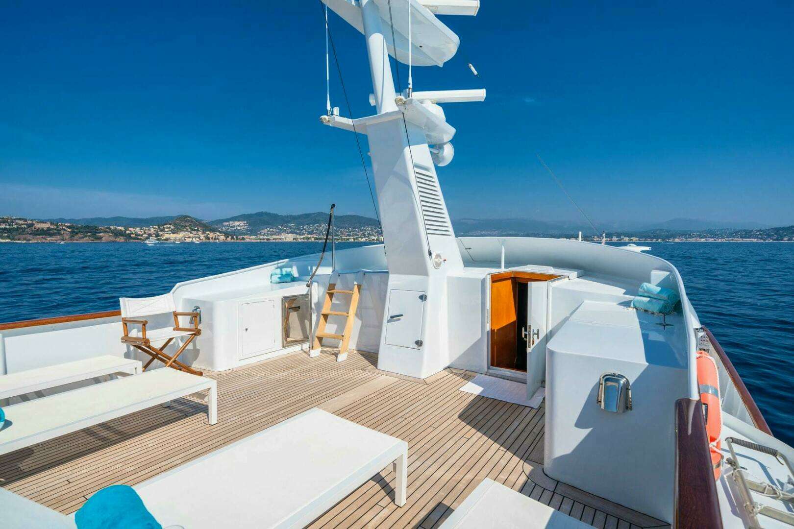 The expansive flybridge on Amirraglio is a standout feature. In 2022, the owner relocated the stack forward, creating even more open deck space. This modification allows for four deck chairs and a spacious aft dining area with comfortable seating for 10 guests. The area can be shaded as needed. The teak decks were also replaced in 2022, enhancing the overall aesthetic. The forward section of the flybridge is equipped with ample storage and an exterior fridge. Additionally, just a few wooden steps up, you'll find a large sunbathing pad, perfect for sun lovers.