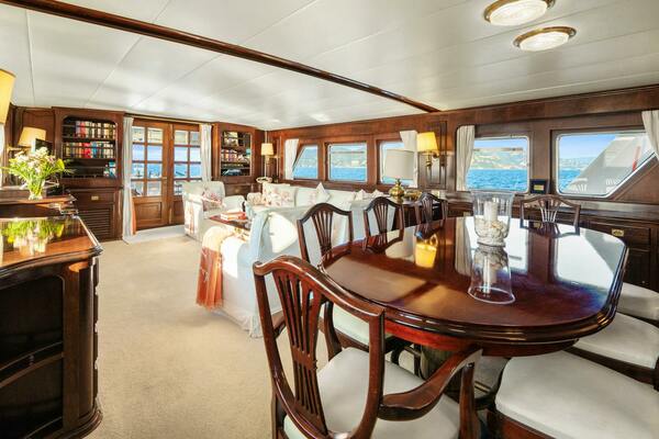 Upon entering, you are welcomed into a bright and inviting seating area, complete with large sofas and comfortable chairs arranged around a TV. The expansive windows not only flood the room with natural light but can also be opened to let in a refreshing breeze. To the starboard side, you'll find the main staircase leading down to the owner's suite. Just beyond the seating area is a formal dining space with seating for six guests. The main salon also offers ample storage, with plenty of cupboard space throughout.