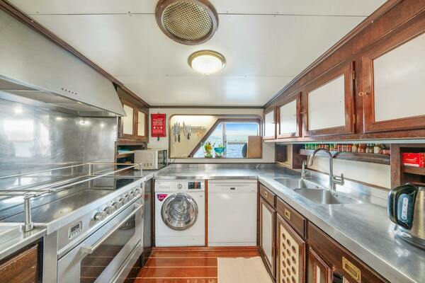 She boasts a spacious galley with stainless steel work surfaces, an induction hob, and an oven. The galley is equipped with three large commercial fridges and coffee-making facilities. It also serves as the crew mess area.