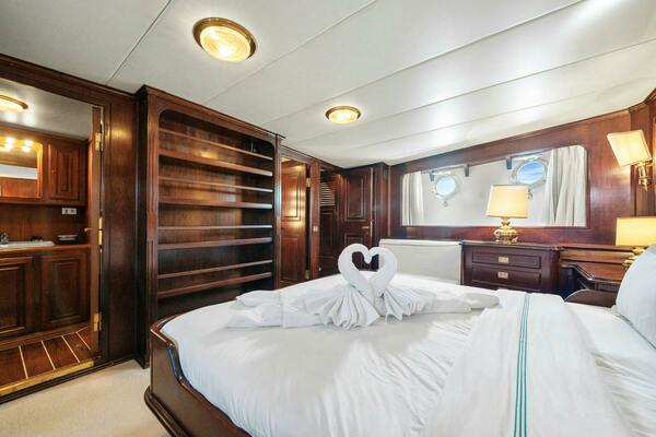 Descending the aft stairs from the main salon, you'll enter the full-beam owner's suite. This spacious cabin is illuminated by two portholes on either side, allowing ample natural light to fill the room. The centrepiece of the suite is a large king-size bed, flanked by bedside tables on both sides. The cabin offers generous storage space, including a walk-in wardrobe located on the starboard side. On the port side, you'll find the en suite bathroom, complete with a large shower.