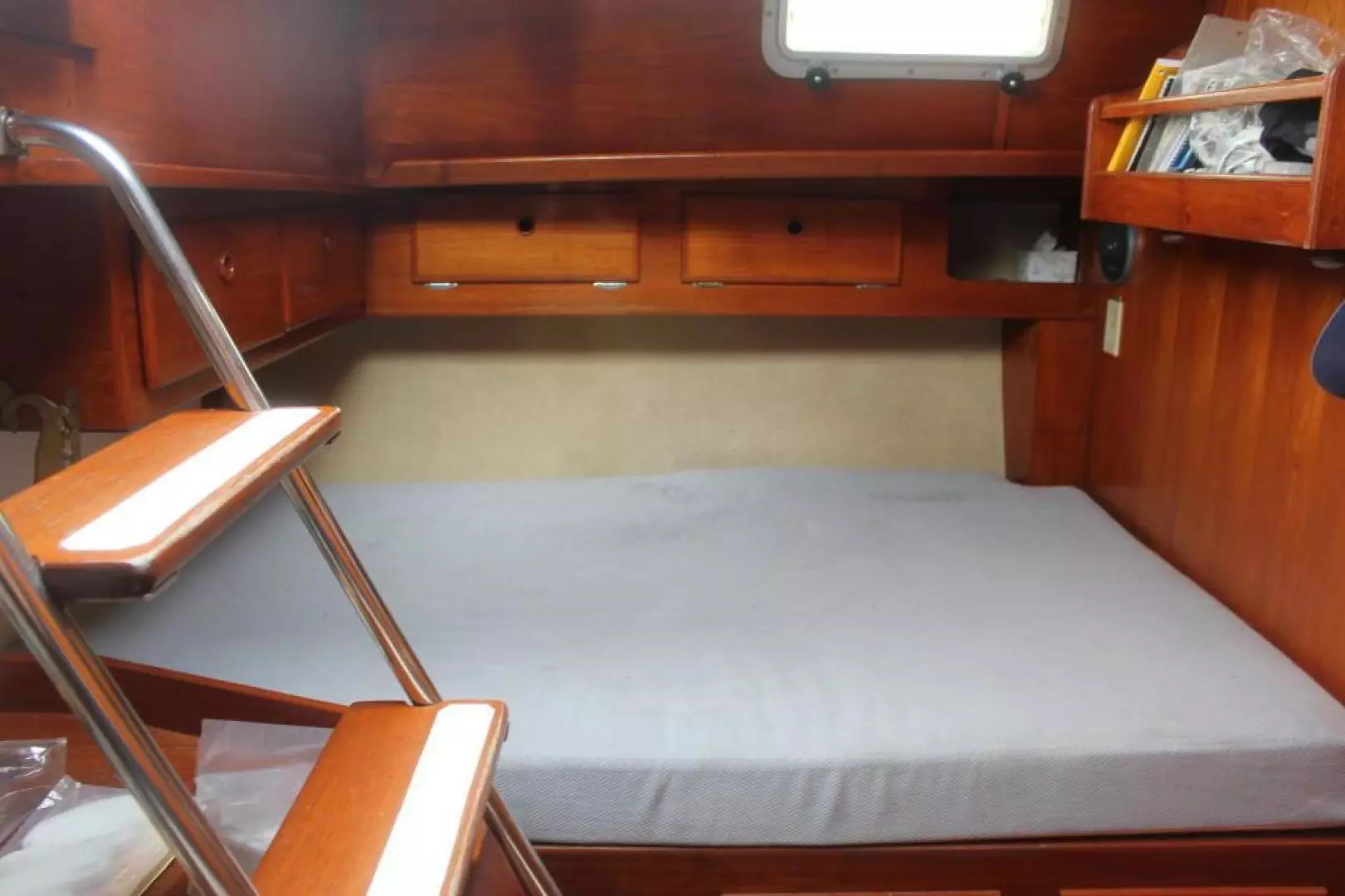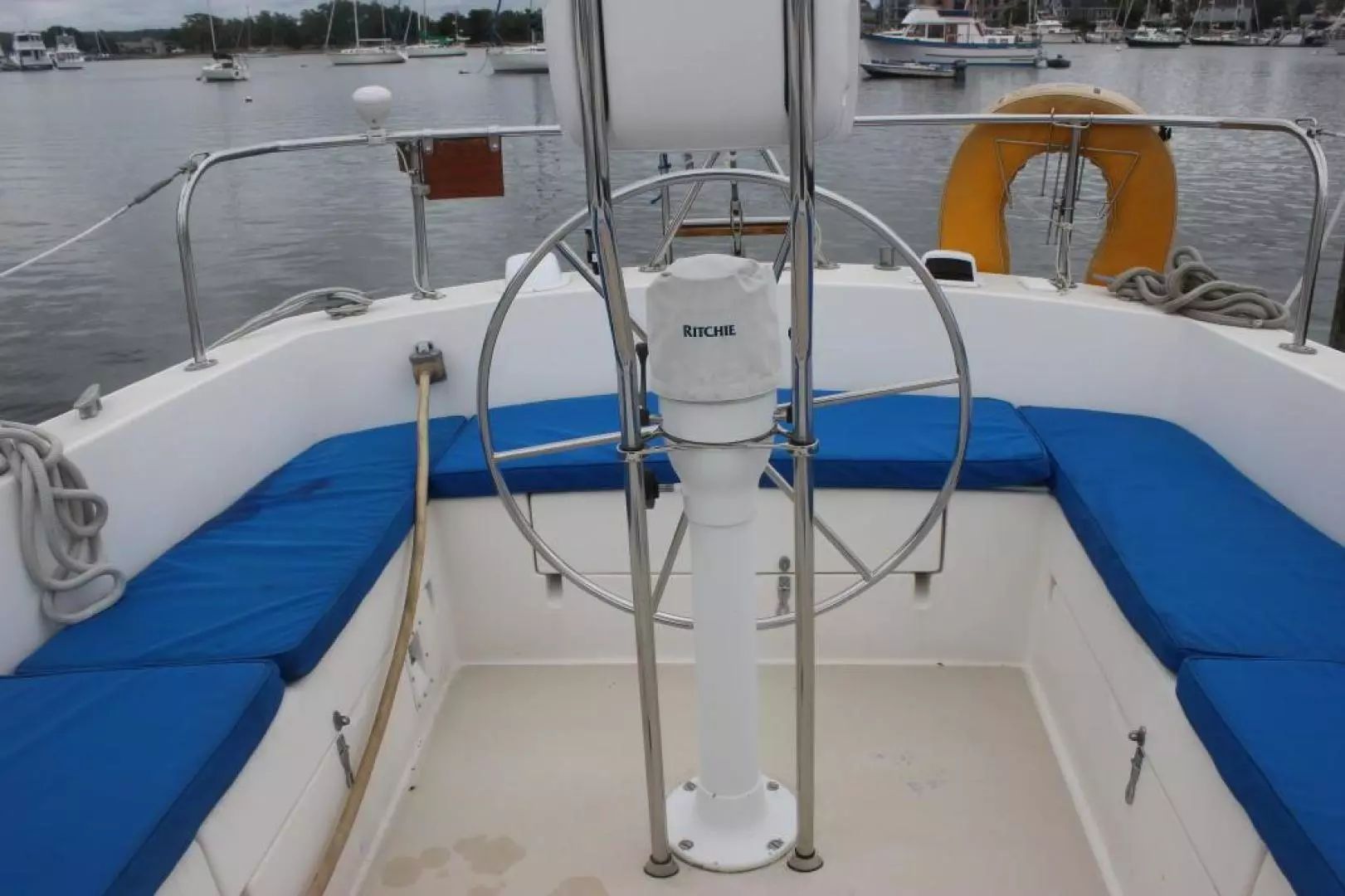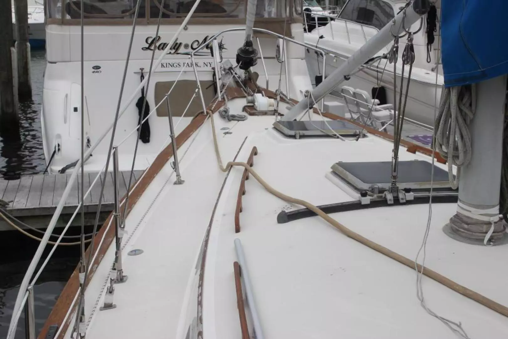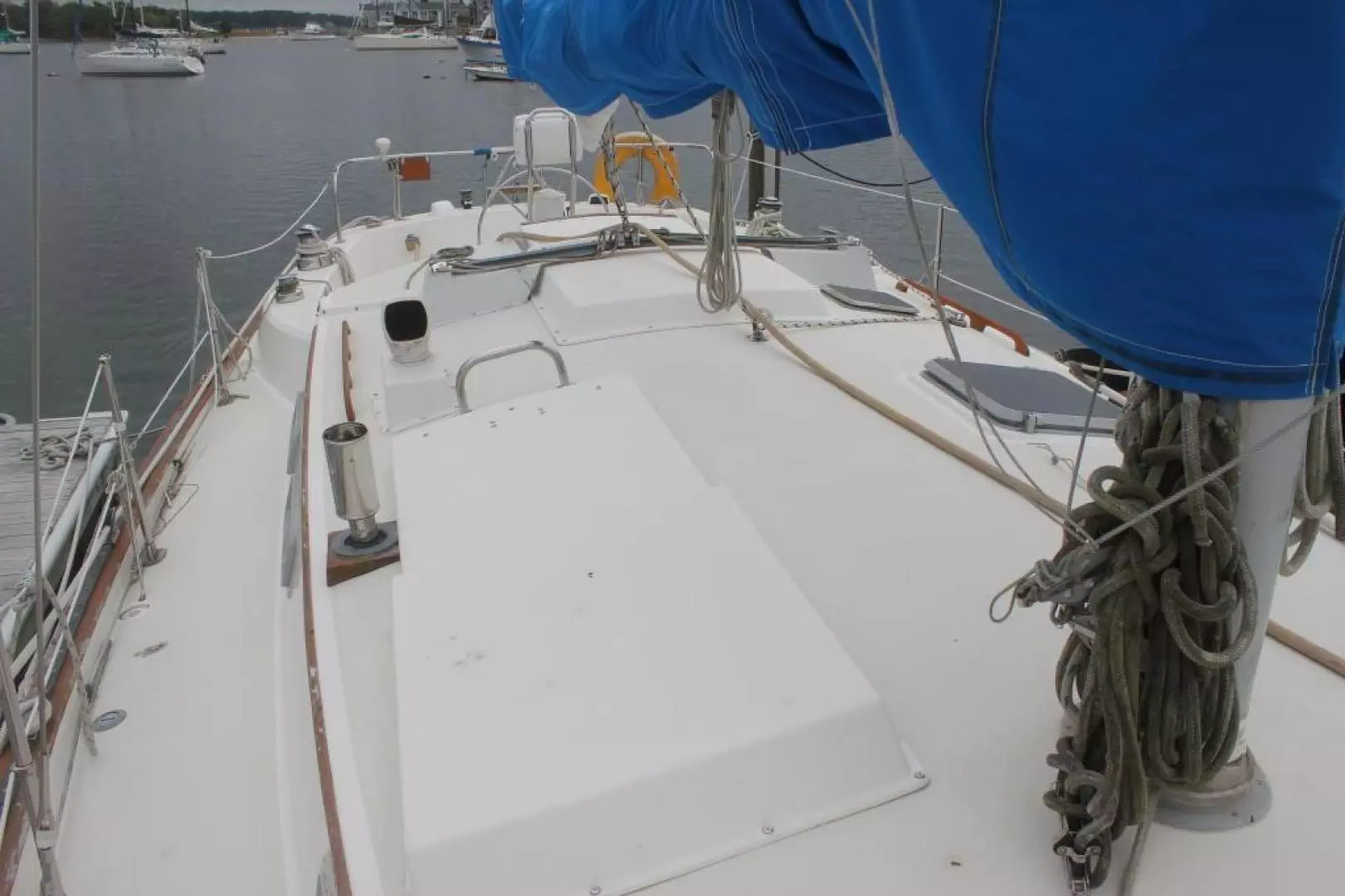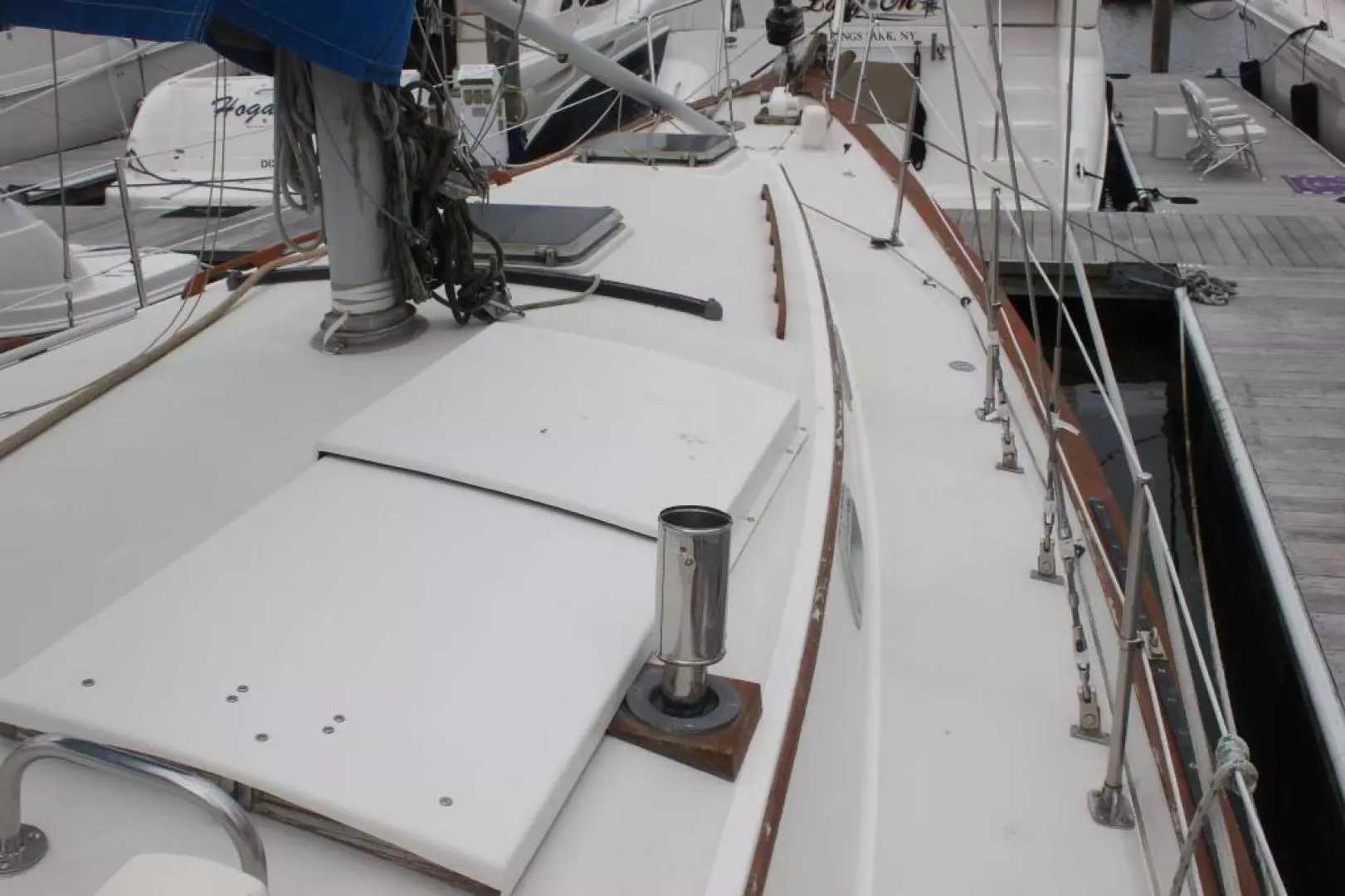 Raeven II is an original owner cutter rigged Pearson 424 with a two berth, two head layout. When entering below deck the Nav Station is to starboard with a double berth to port. Forward to port is the U-shaped galley. There is a second deck access across from the galley to starboard. She has port and starboard settees with a centerline fold down table. Forward is the main cabin consisting of a centerline V-berth with a filler, wash stand to port and a concealed marine head to starboard. The main head with shower is just forward of the Nav Station. She a full compliment of sails and her auxiliary power is a 2010 55-HP Yanmar diesel with less than 100 hours. Check out the Full Specs and call for an appointment to see her. She is located in Greenport NY.