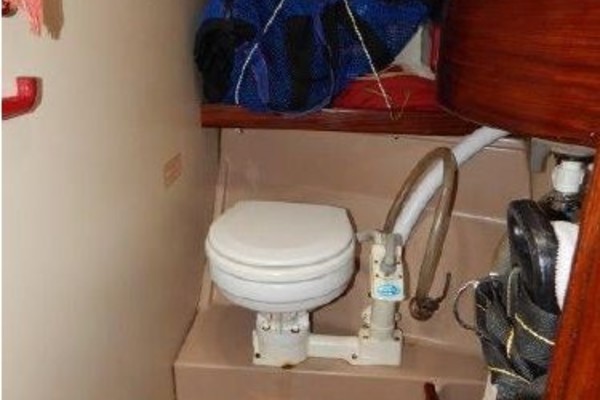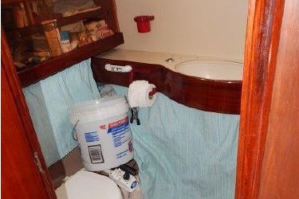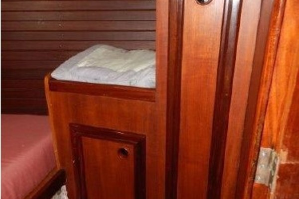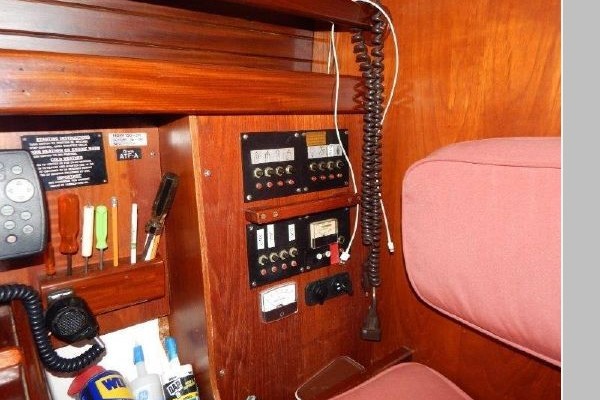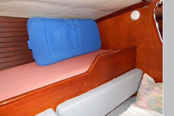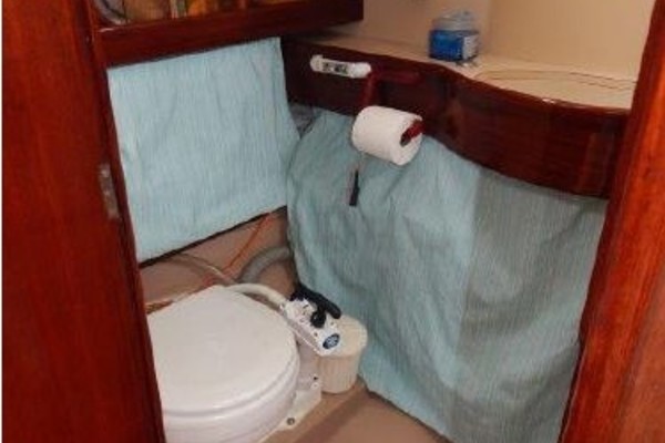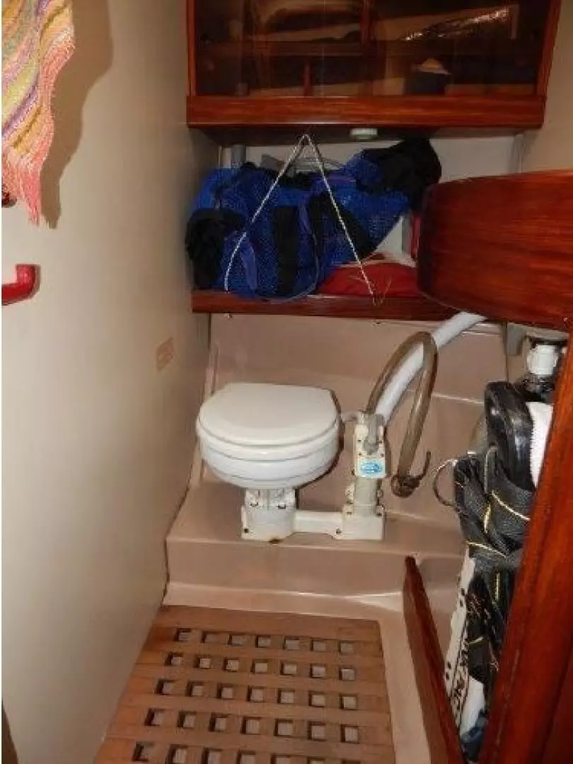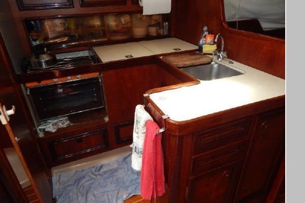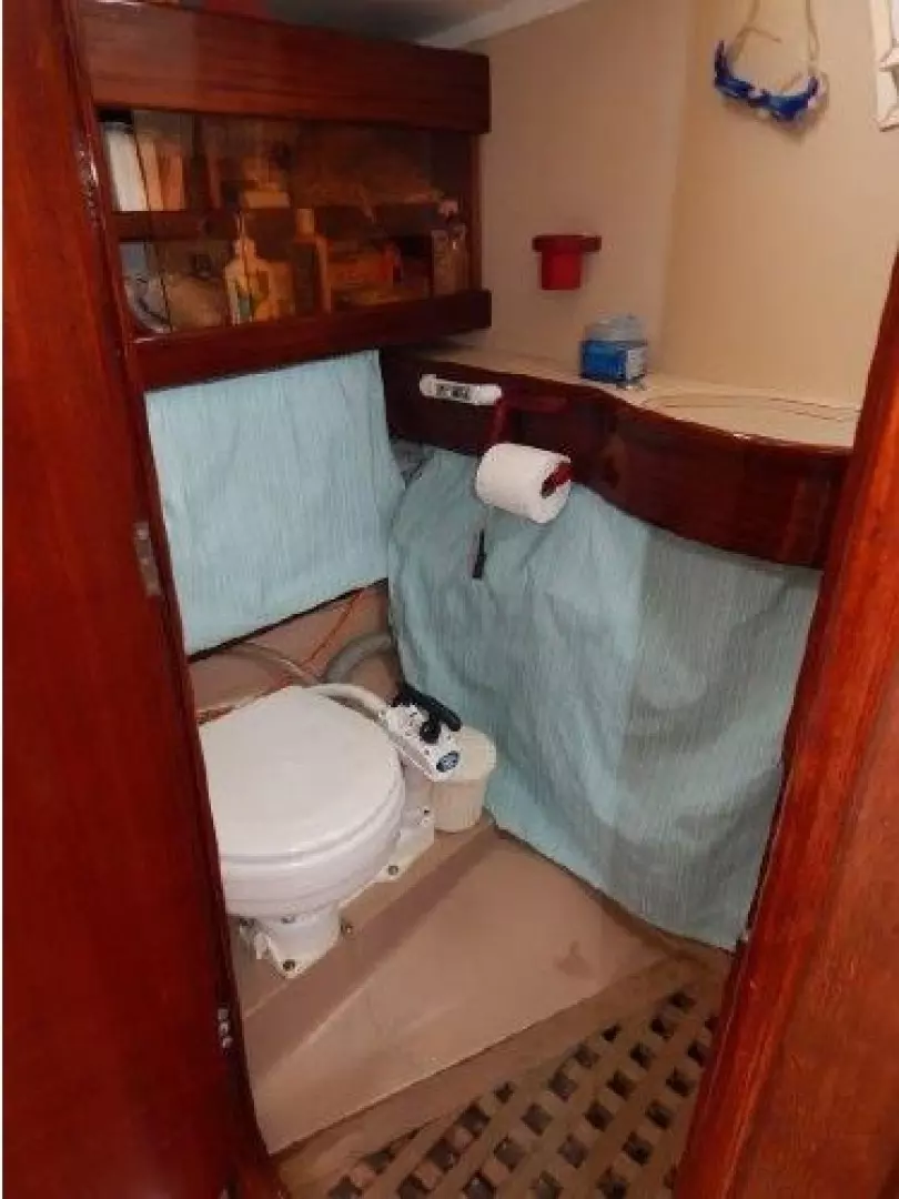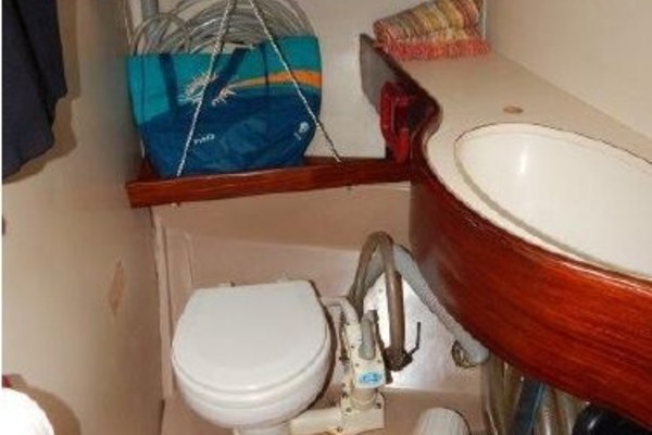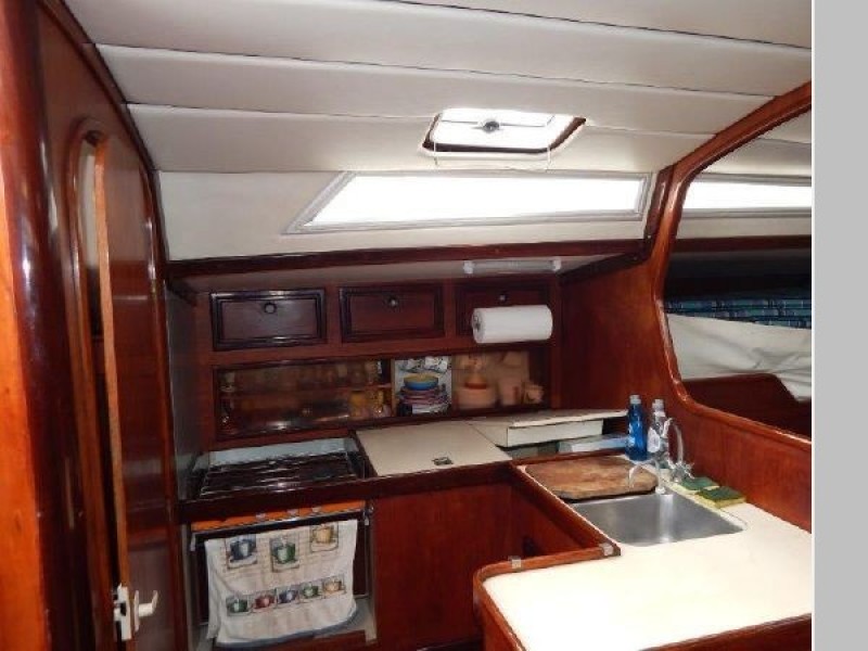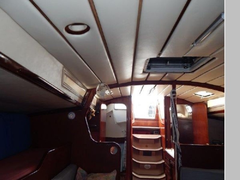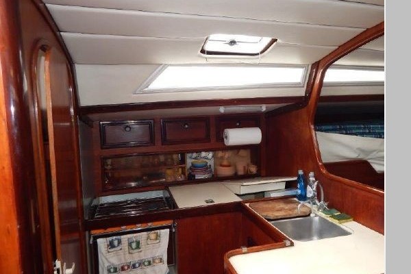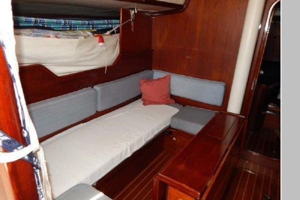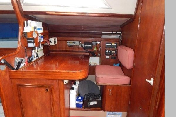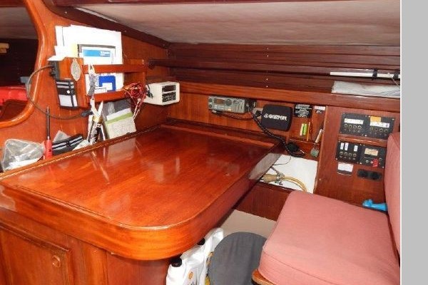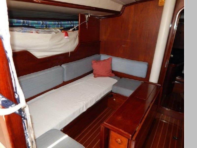 Starting furthest forward is an offset double berth to port, a storage locker, dressing seat and hanging locker to starboard. The forward enclosed head is next aft to port. The dinette is next aft with a center mounted gate leg table and opposing settee to starboard, there are pilot berths outboard on both sides. Next aft is the galley to port and the navigation station to starboard. The aft cabin with a double berth, hanging locker and storage is to port and the second enclosed head is to starboard.