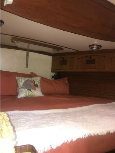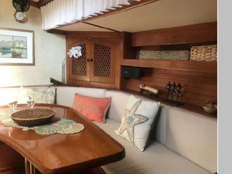 The main salon has an expandable transom berth to port with storage lockers and bookshelves. Opposite, to starboard, is an L-shaped settee with a teak L-shaped dining table. There is a flat screen TV over the center of the settee for excellent visibility from anywhere in the salon, Nav. station and galley. She has a mix between the traditional wood interior and the Herreshoff design with light bulkheads. It lends to a brighter yet warm interior. All the salon cushions have been recently recovered, as well as foam replaced, in a lovely linen Sunbrella (some photos show the covers used to protect the cushions as well as the new covers). From her solid teak and holly sole to the craftsmanship of her interior cabinetry one cannot help but see what sets the Little Harbor above so many other builders.