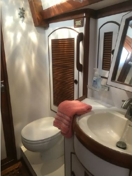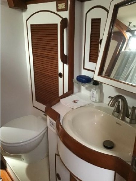 The forward head, to starboard, has access from the forward cabin and the main salon. This head area includes an electric/manual toilet, sink, shower and good locker space. Opening hatch and port add light and ventilation.