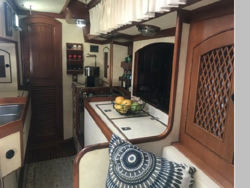 The galley is to port of the companionway and leads aft to the Master Stateroom allowing for a working area on both sides of the galley.