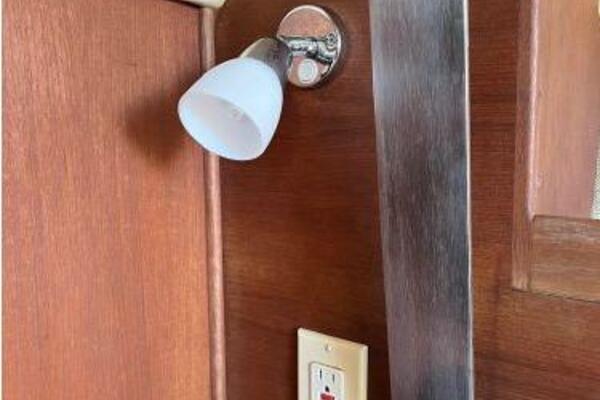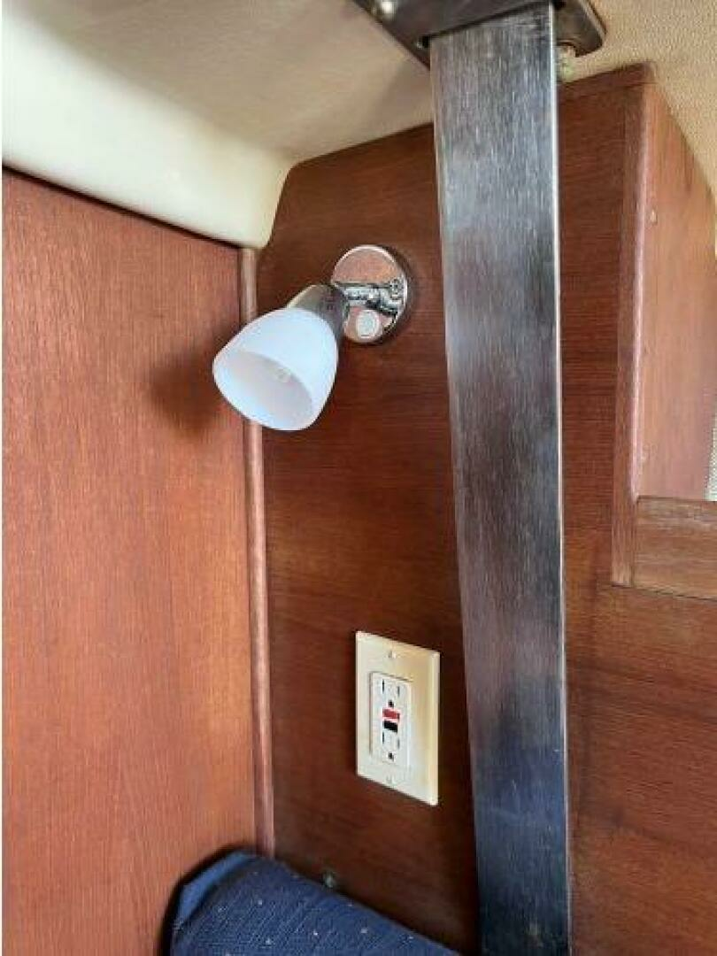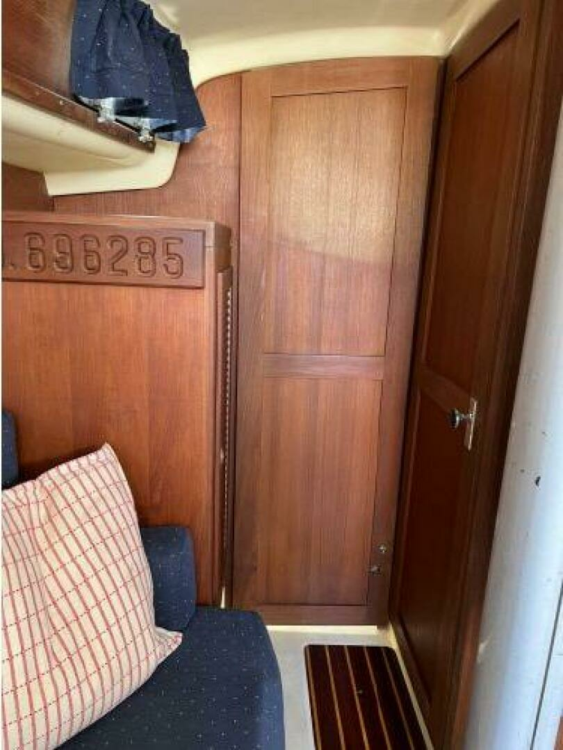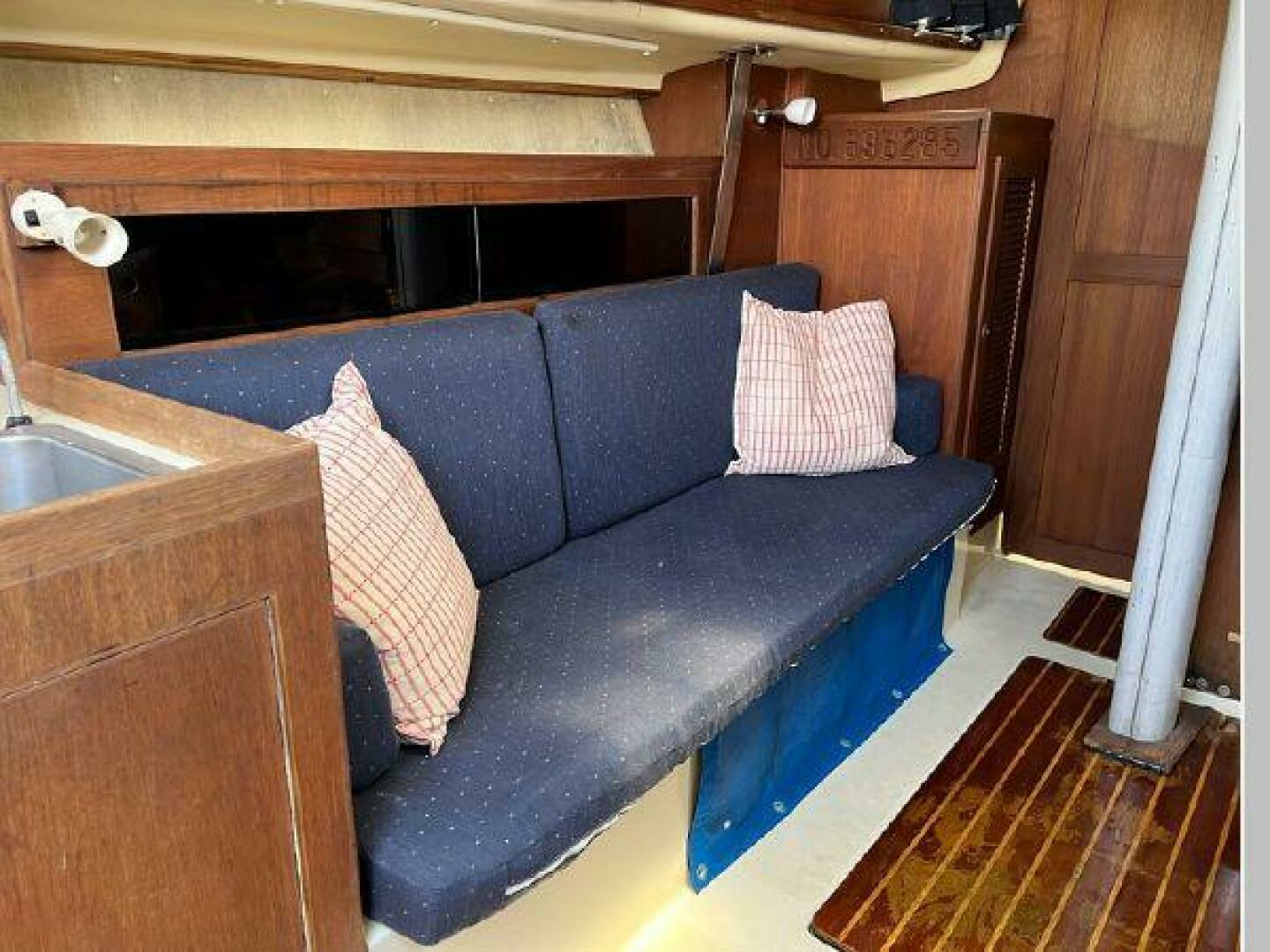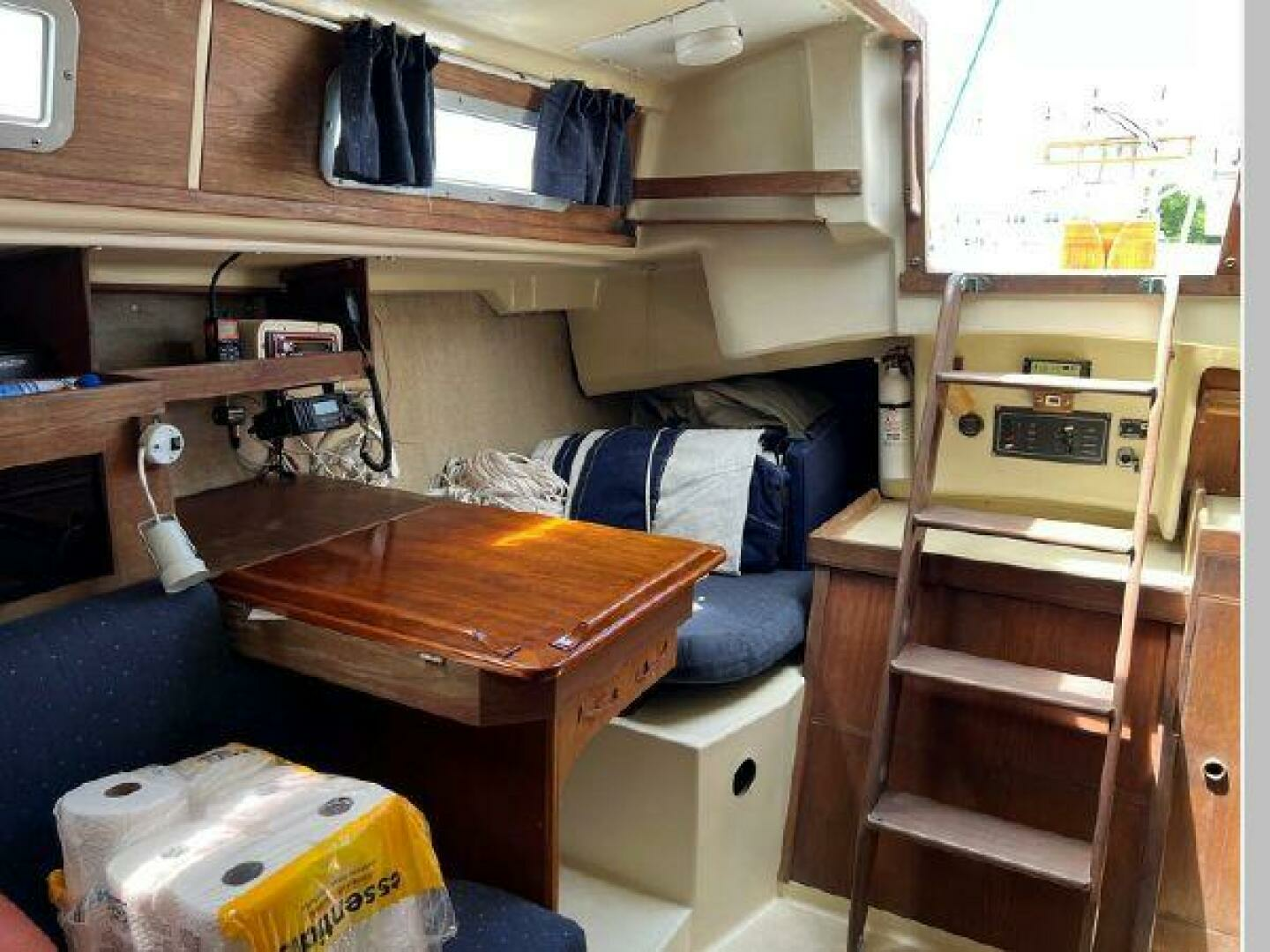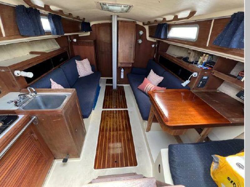 Starting forward is the V-berth with filler, storage shelves outboard and storage drawers, next aft is a hanging locker to port and the enclosed head to starboard. Next aft is a single convertible settee to port and a convertible settee to a double to starboard. There is a bulkhead mounted 2 leave folding teak dining table. Next aft is the galley to port and the navigation station to starboard with a quarter berth aft.