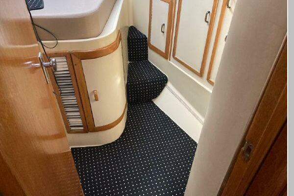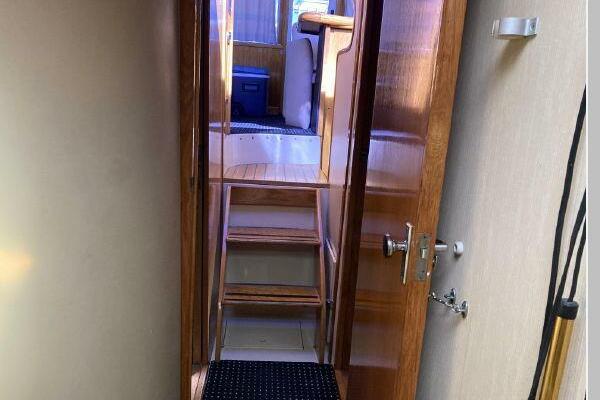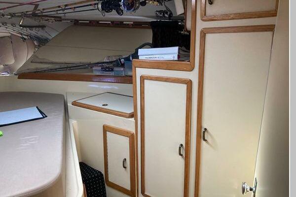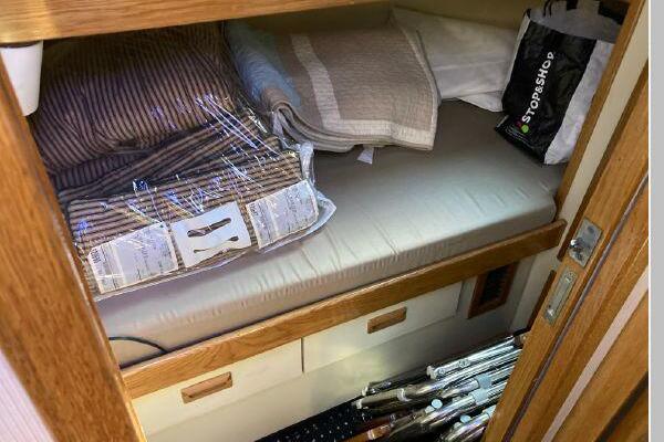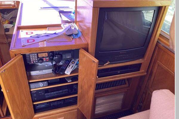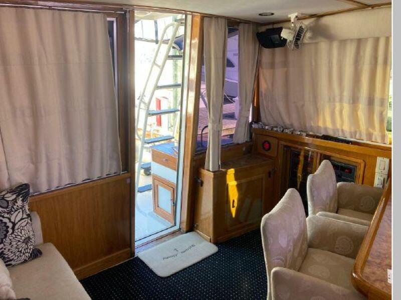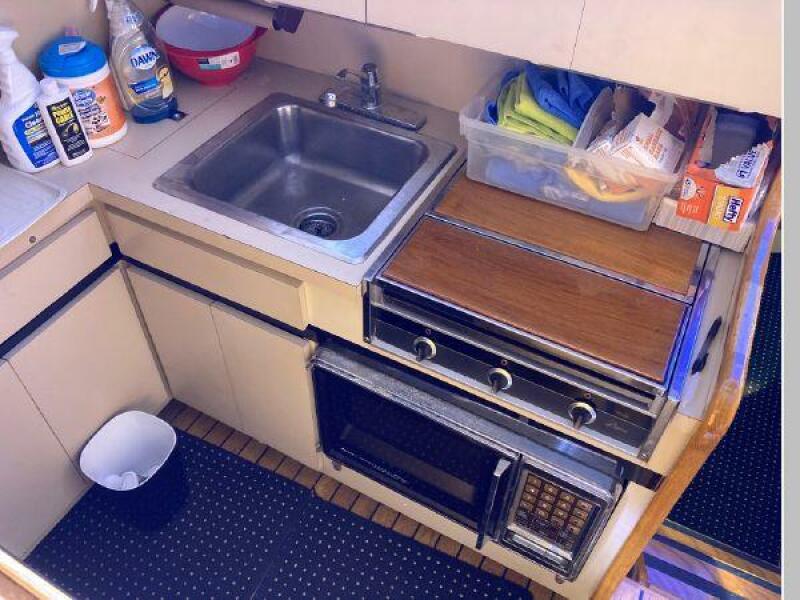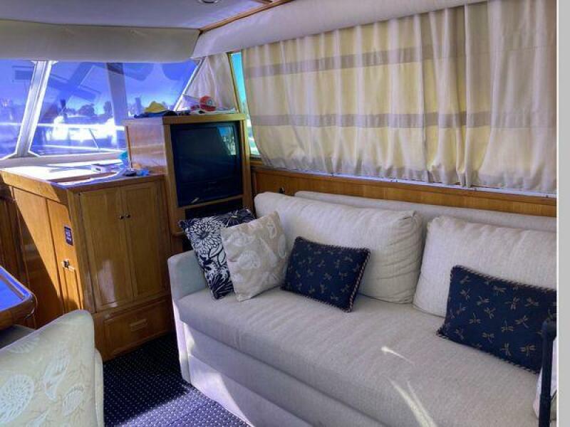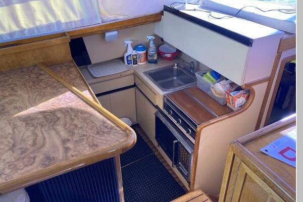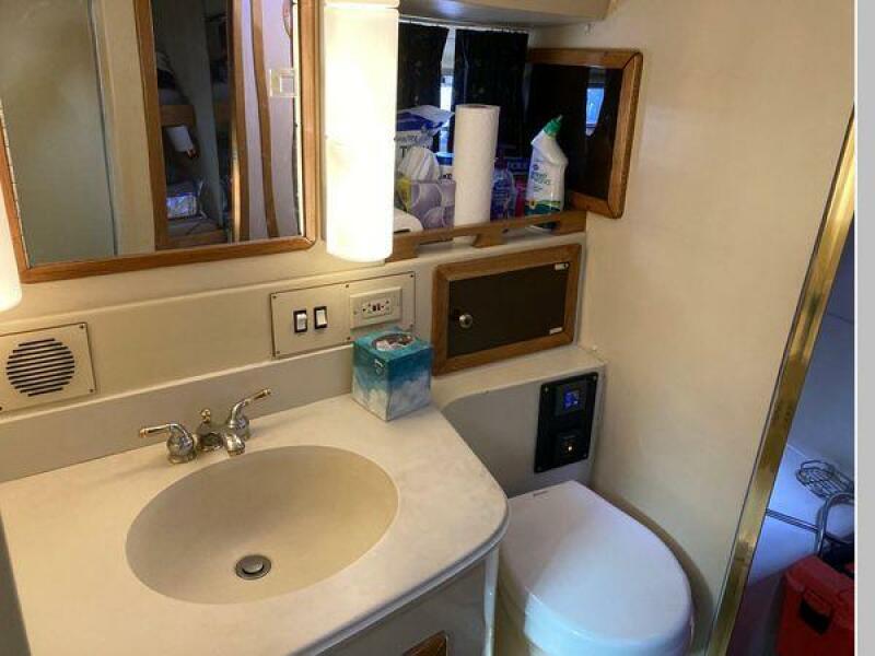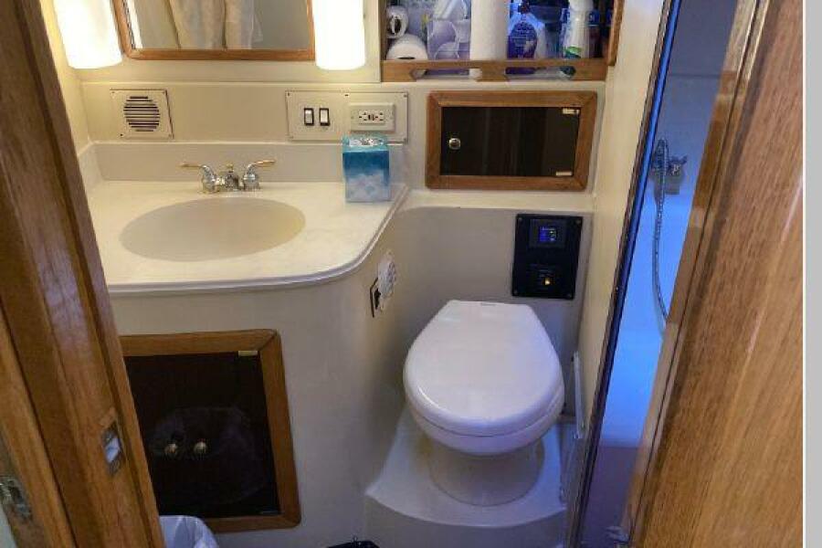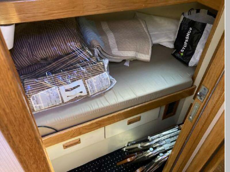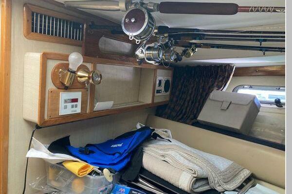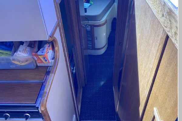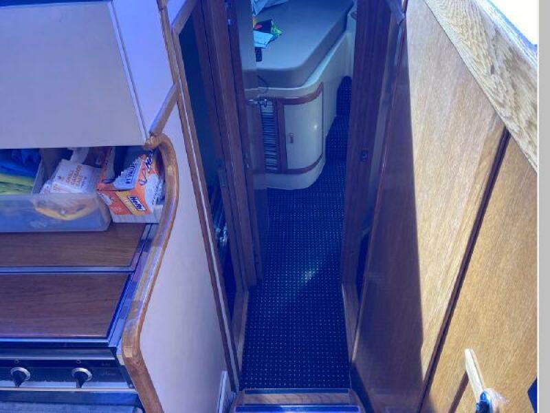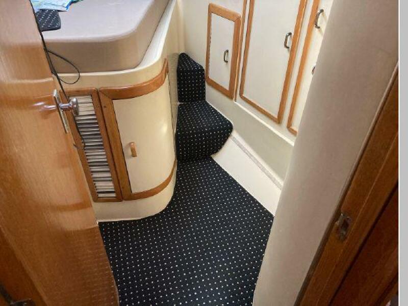 Enter the salon through the sliding glass the stylish salon has a pilot chair to port and starboard side L-shaped convertible settee with an electronics cabinet further forward . A unique angled breakfast bar separates the salon from the portside galley which is one step below the salon. Going forward, down two steps there is the guest stateroom with over/under berths with storage drawers and a hanging locker. Opposite to starboard is the head compartment with marine toilet, vanity and a stall shower. Further forward is the owner's stateroom with a large double berth to port, a starboard side vanity, hanging locker and numerus storage compartments and drawers, Overhead are numerous rod racks. The cabin soles and walls throughout the interior are low maintenance, off-white fiberglass of the boat's one piece molded inner liner which extends from the transom all the way to the forward rope locker. An impressive piece of engineering.
