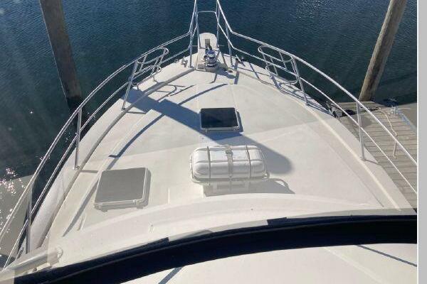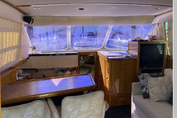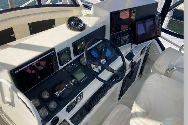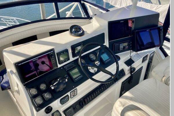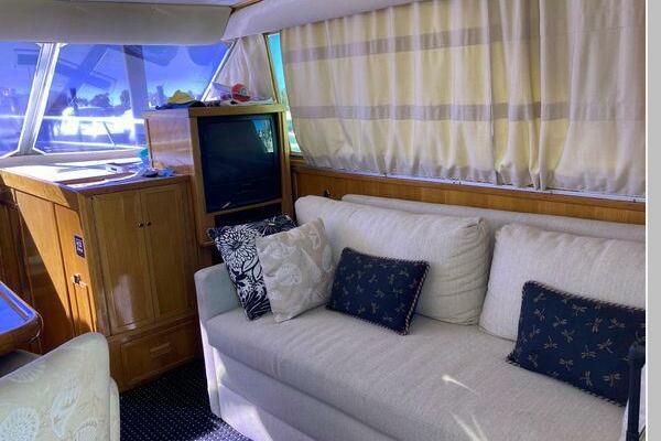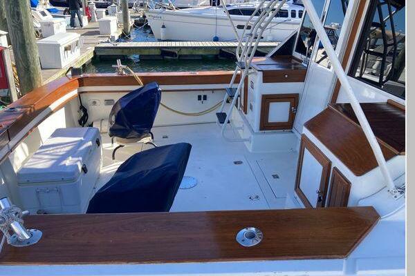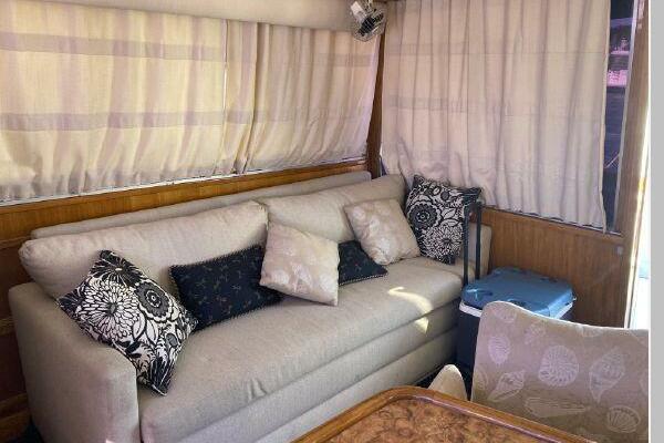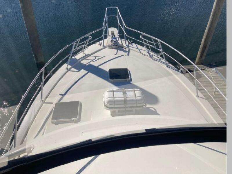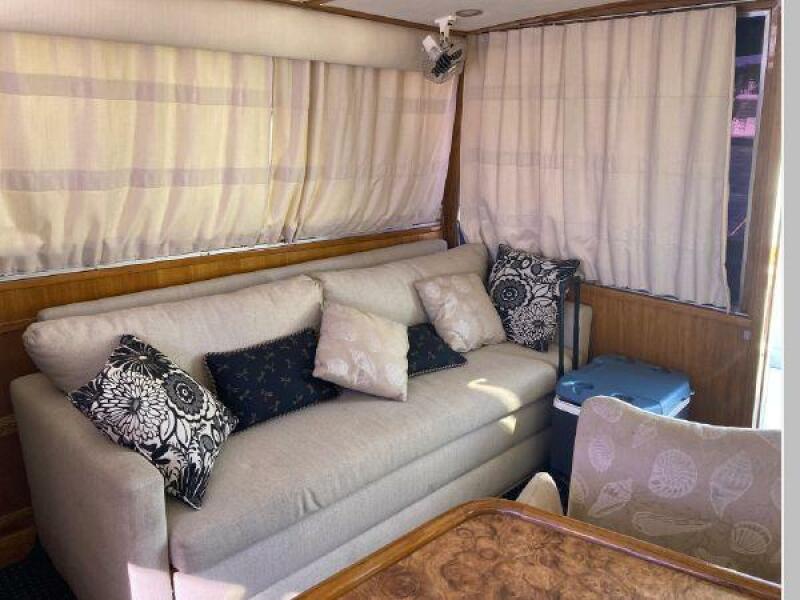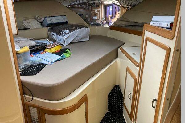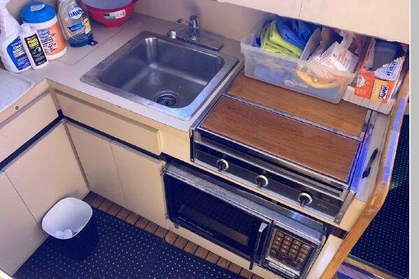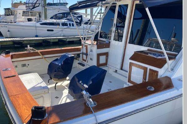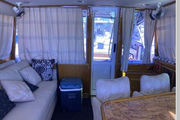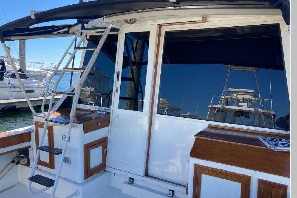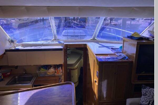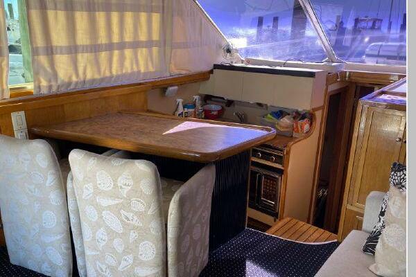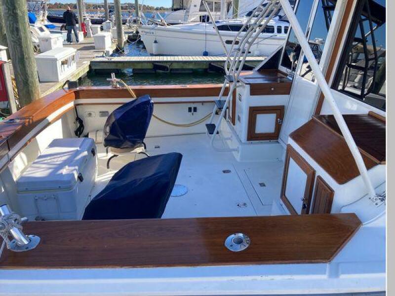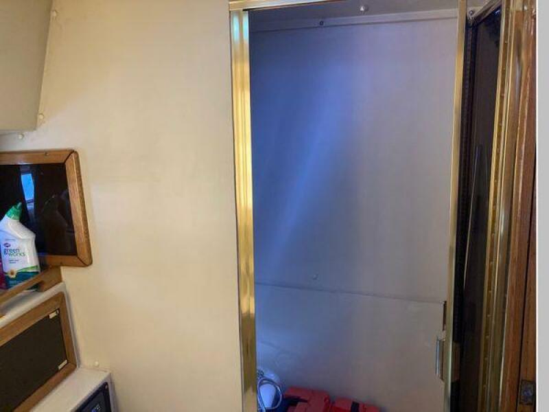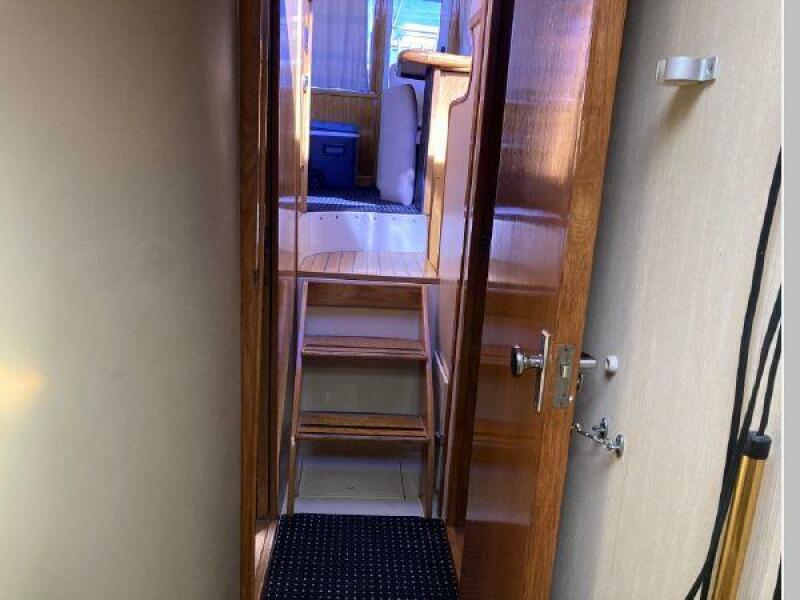 Enter the salon through the sliding glass the stylish salon has a pilot chair to port and starboard side L-shaped convertible settee with an electronics cabinet further forward . A unique angled breakfast bar separates the salon from the portside galley which is one step below the salon. Going forward, down two steps there is the guest stateroom with over/under berths with storage drawers and a hanging locker. Opposite to starboard is the head compartment with marine toilet, vanity and a stall shower. Further forward is the owner's stateroom with a large double berth to port, a starboard side vanity, hanging locker and numerus storage compartments and drawers, Overhead are numerous rod racks. The cabin soles and walls throughout the interior are low maintenance, off-white fiberglass of the boat's one piece molded inner liner which extends from the transom all the way to the forward rope locker. An impressive piece of engineering.