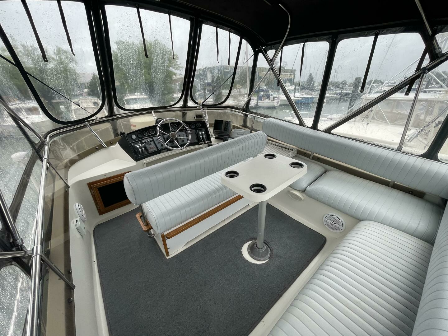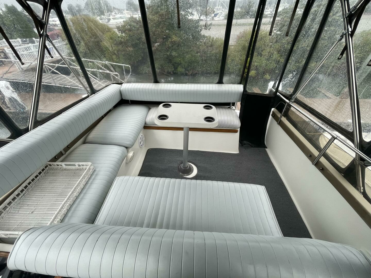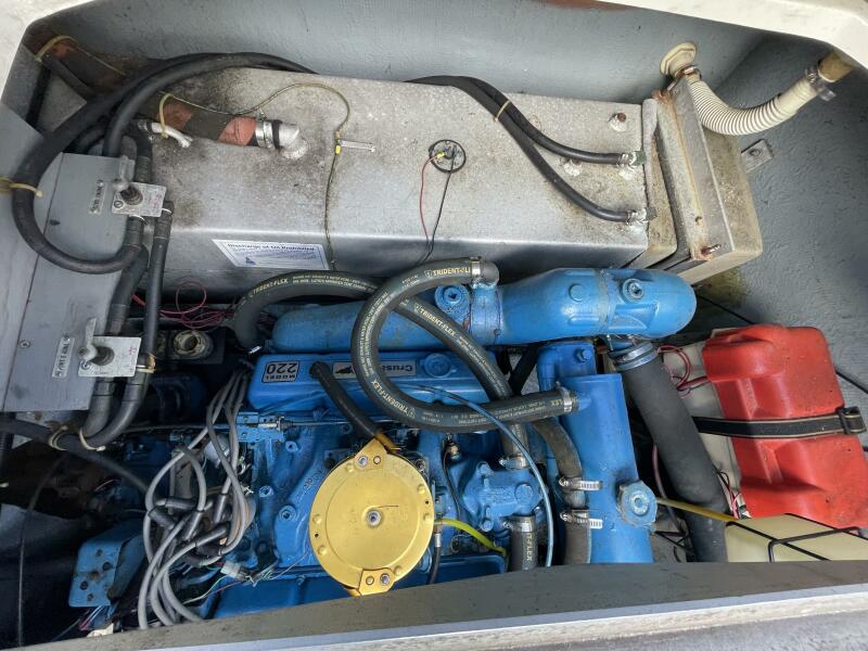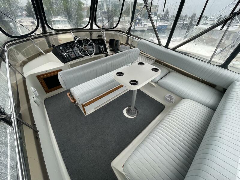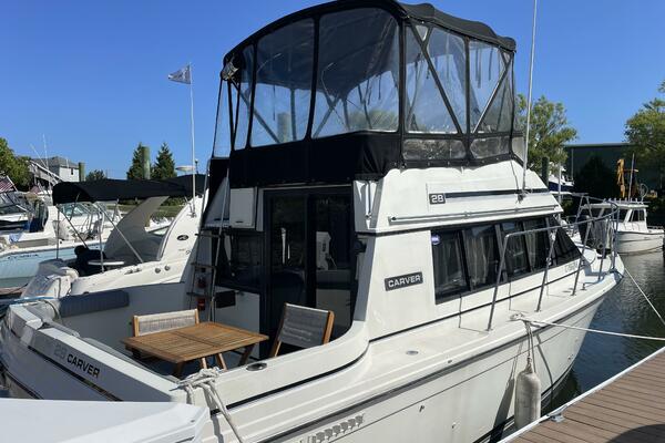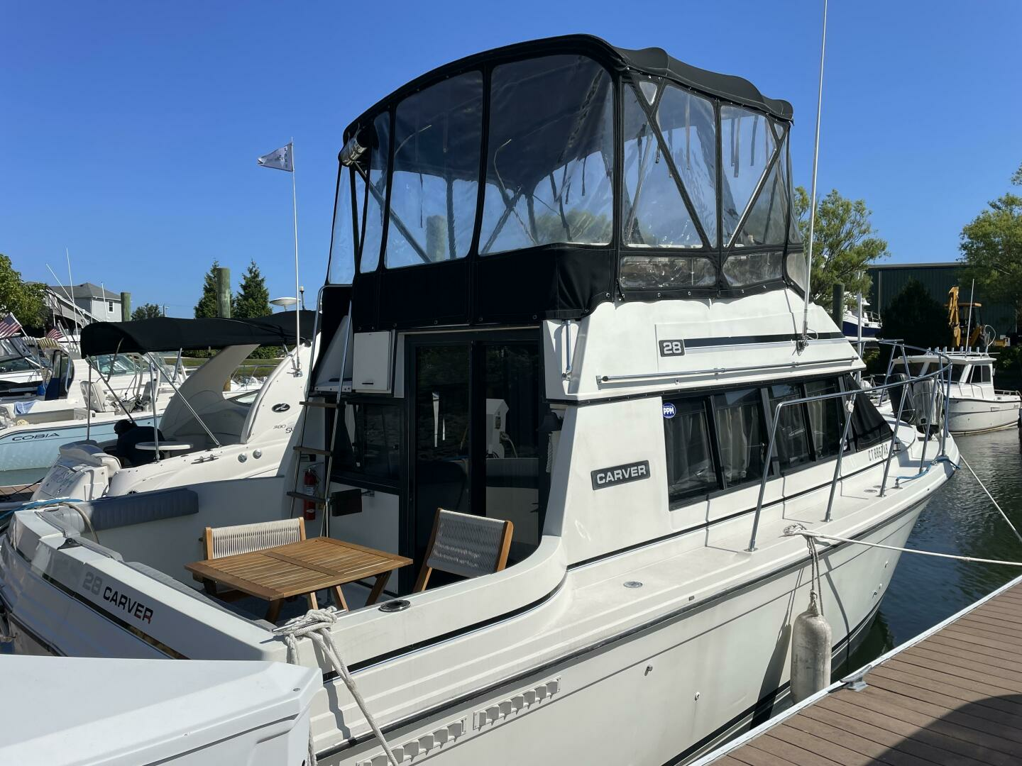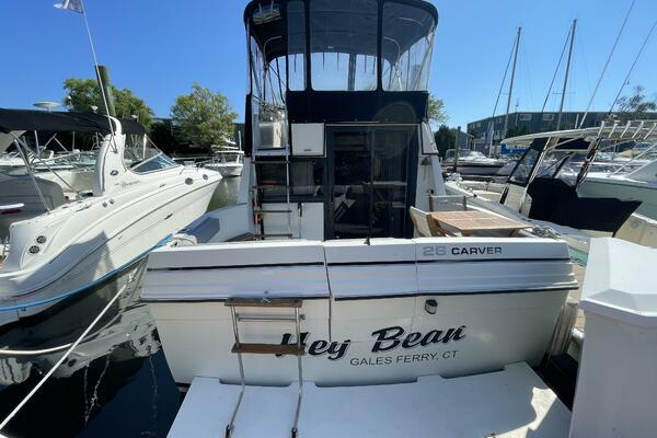"HEY BEAN" has been kept in great condition for her age. Powered by twin Crusaders Model 220's with V-Drives with approx. 800hrs. The Carver Mariner bridge has the best layout for socializing of any of the Mariner models with L-shaped bench seating, a flip-flop captain's bench, and a pedestal cocktail table. Full Bimini enclosure. Snap-down exterior carpeting on the bridge and aft deck. Walk around decks and a walk-out door in the transom that leads to the swim platform make tying up a cinch.