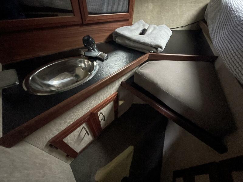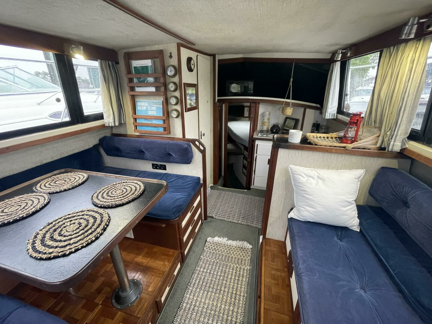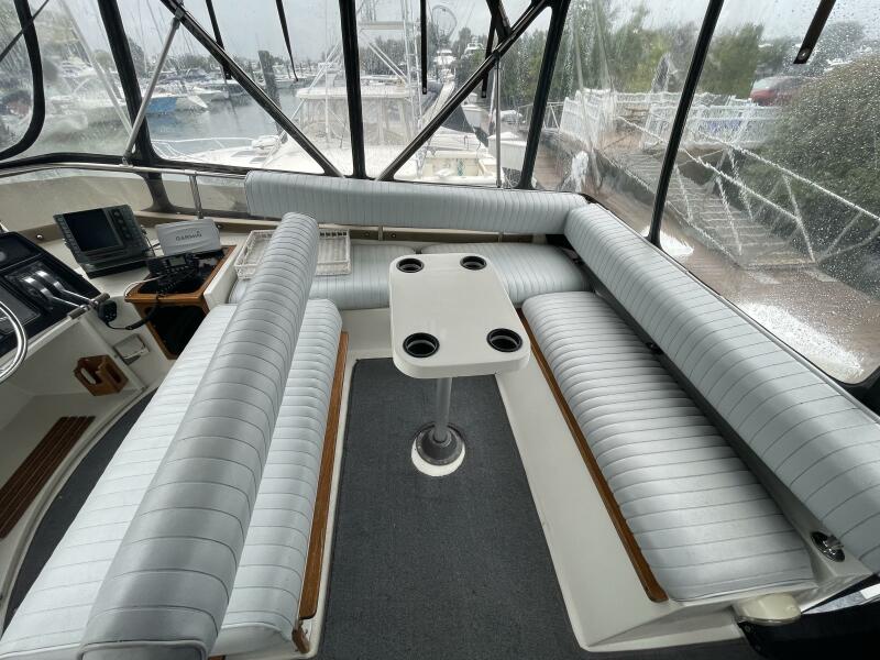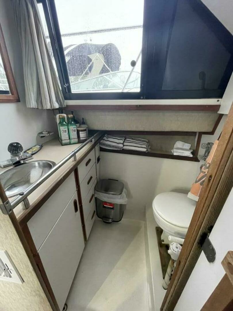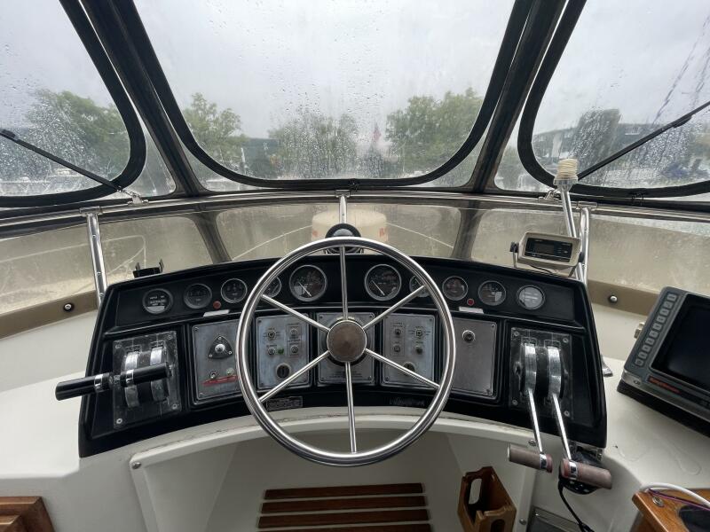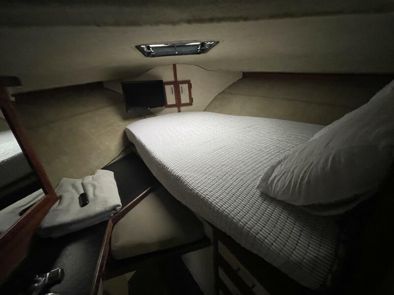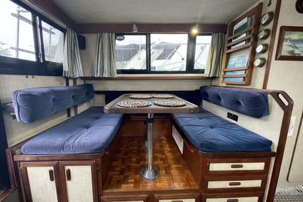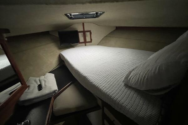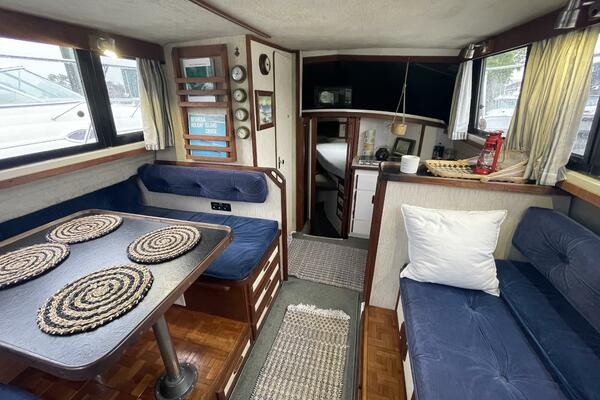 "HEY BEAN" has been kept in great condition for her age. Powered by twin Crusaders Model 220's with V-Drives with approx. 800hrs. The Carver Mariner bridge has the best layout for socializing of any of the Mariner models with L-shaped bench seating, a flip-flop captain's bench, and a pedestal cocktail table. Full Bimini enclosure. Snap-down exterior carpeting on the bridge and aft deck. Walk around decks and a walk-out door in the transom that leads to the swim platform make tying up a cinch.