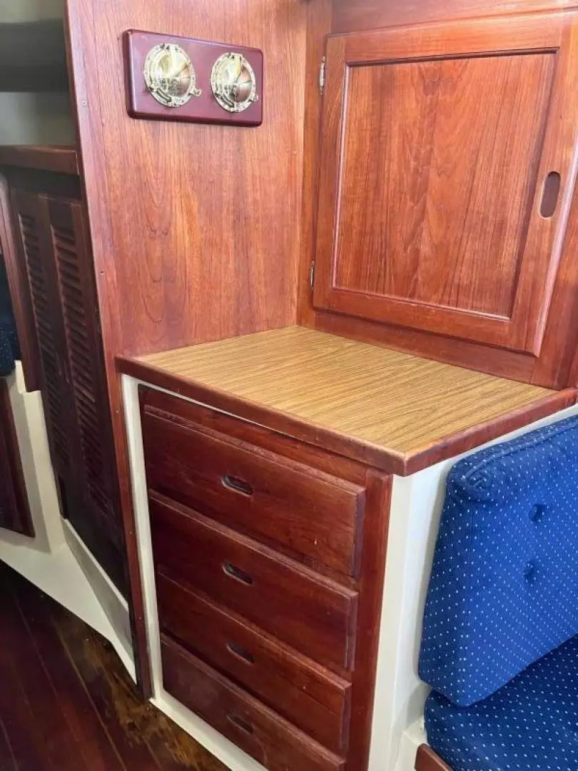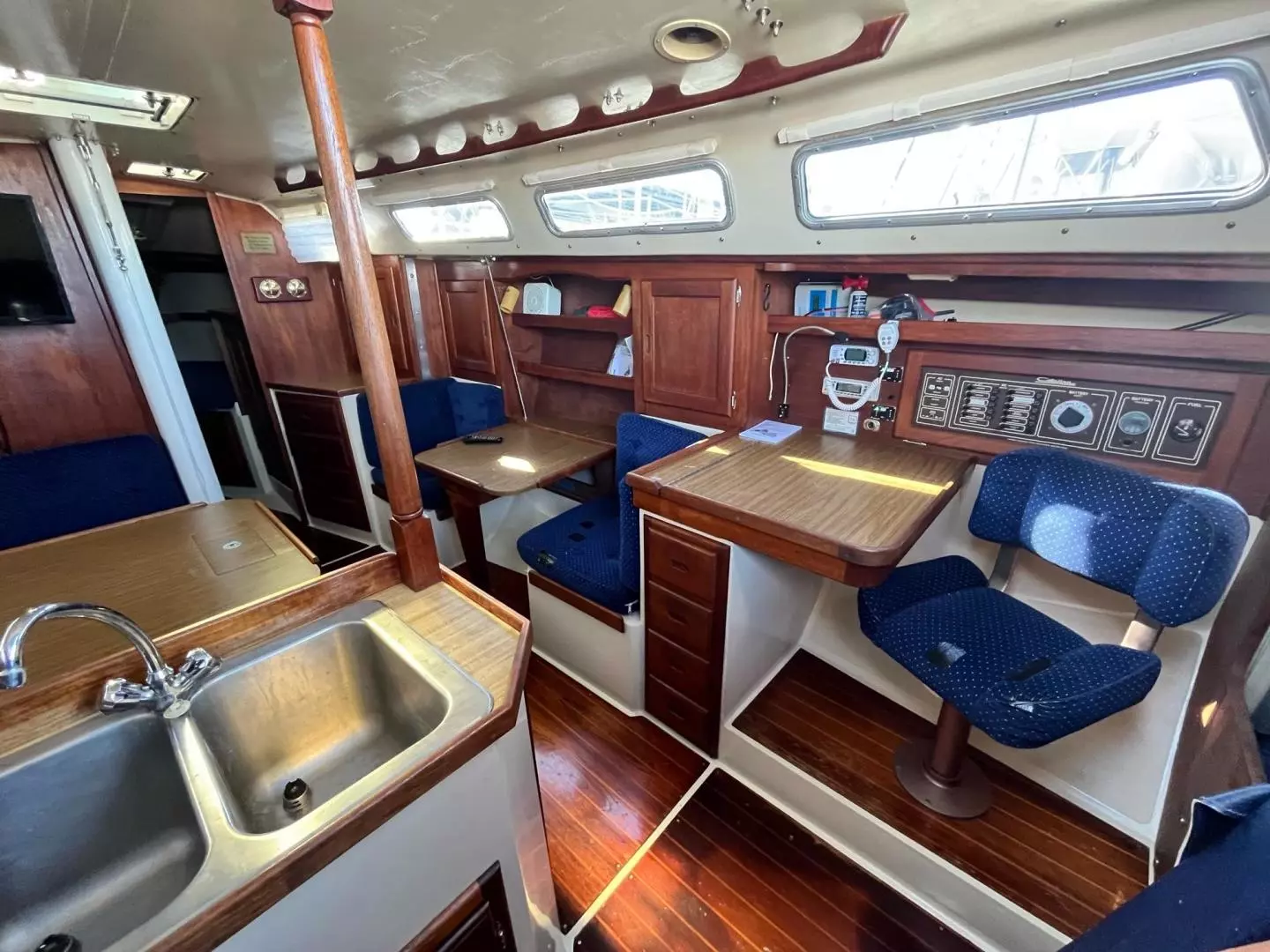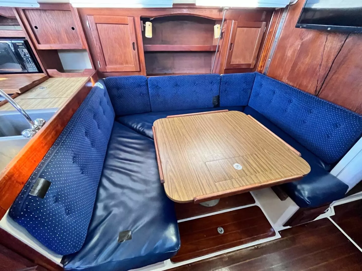 The salon area is spacious and airy with a 32" TV for entertainment. Her teak interior gives a warm and inviting feeling, and she has a teak/holly sole. She has plenty of ports that provide natural light in the cabin and the opening hatches